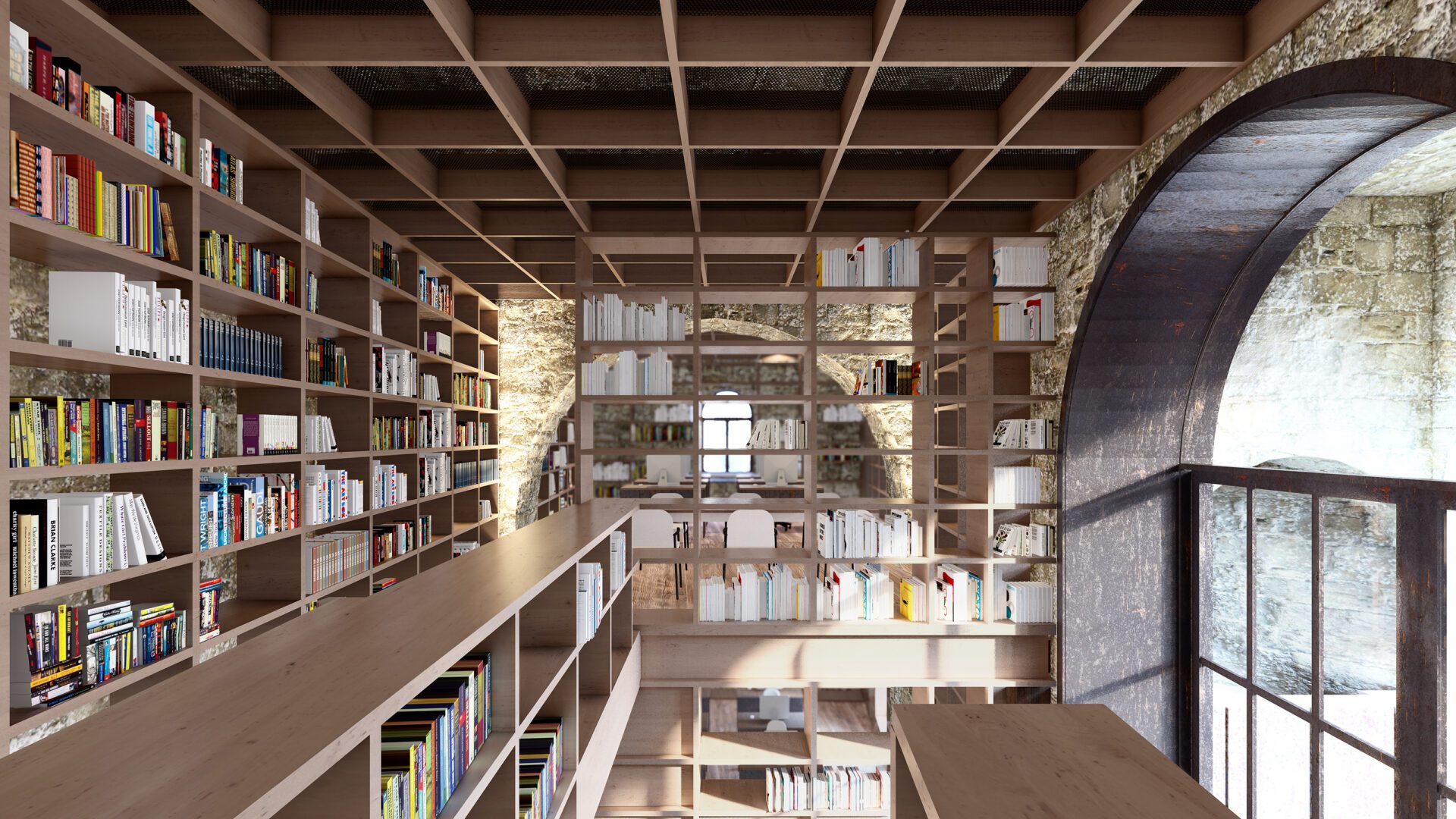The Chiesa Diruta is a unique Renaissance church with an elliptical dome. Visitors enter the site through the fallen northwest stone wall corner and cross the outdoor seating area that lead to the weather protected foyer which is bounded by perimetric folded glazing doors. This space may be used as a secondary event venue during summertime or as art exhibitions. The two storey Municipal Library is located at the opposite side of the monument accessible from Via della Resistenza.