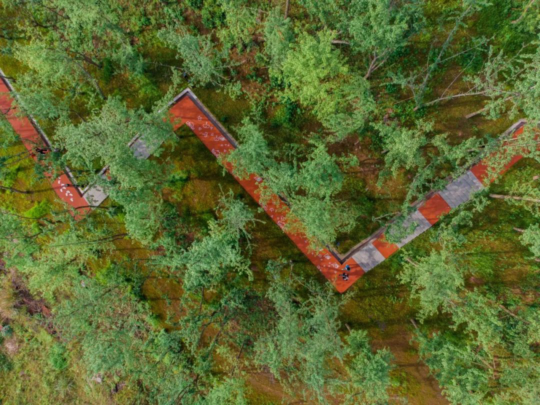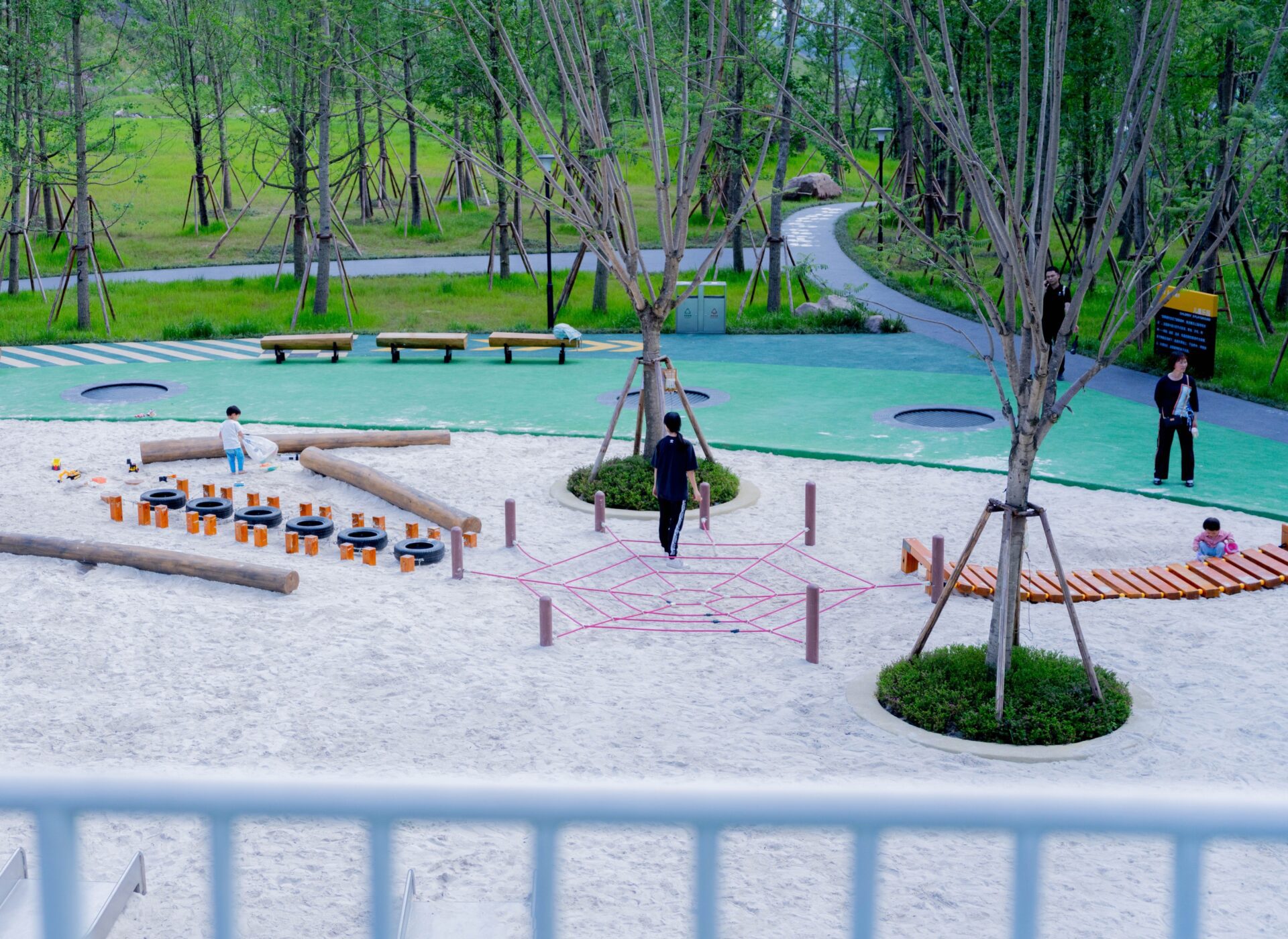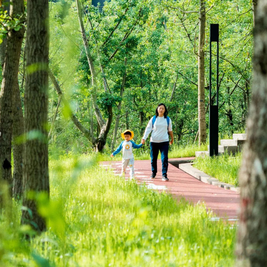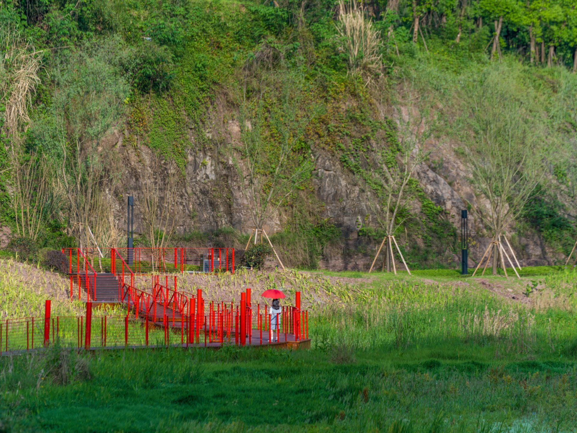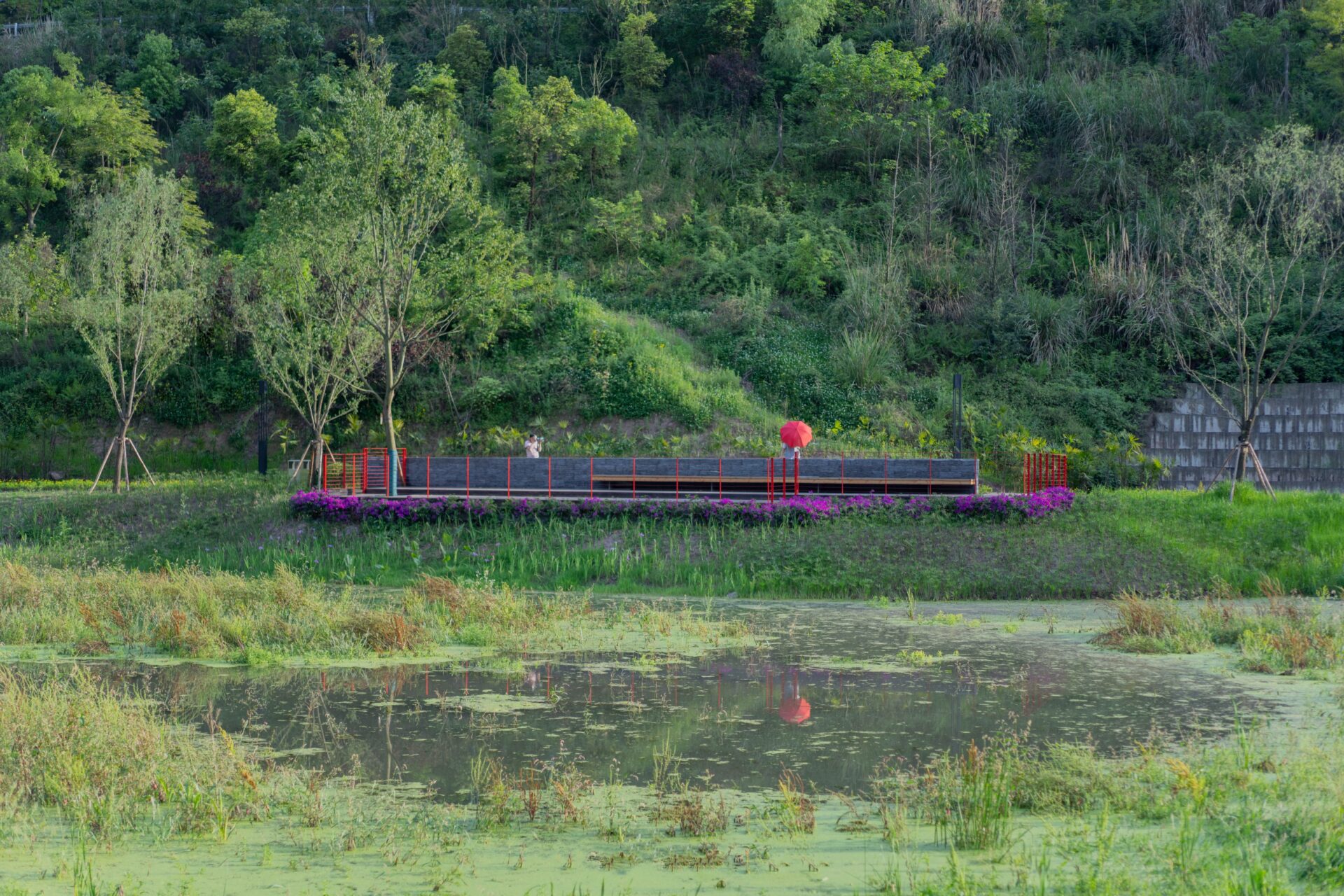 On the other side of the lake region was a pristine wetland region with luxuriant natural vegetation and a good ecological environment. Following the principle of light intervention, we reserved this wetland region and provided a glass plank road for viewing and scientific popularization. Standing here, citizens can experience the scene where layers of trees create a bright green hue, and lonely ducks fly together against the rosy evening glow.