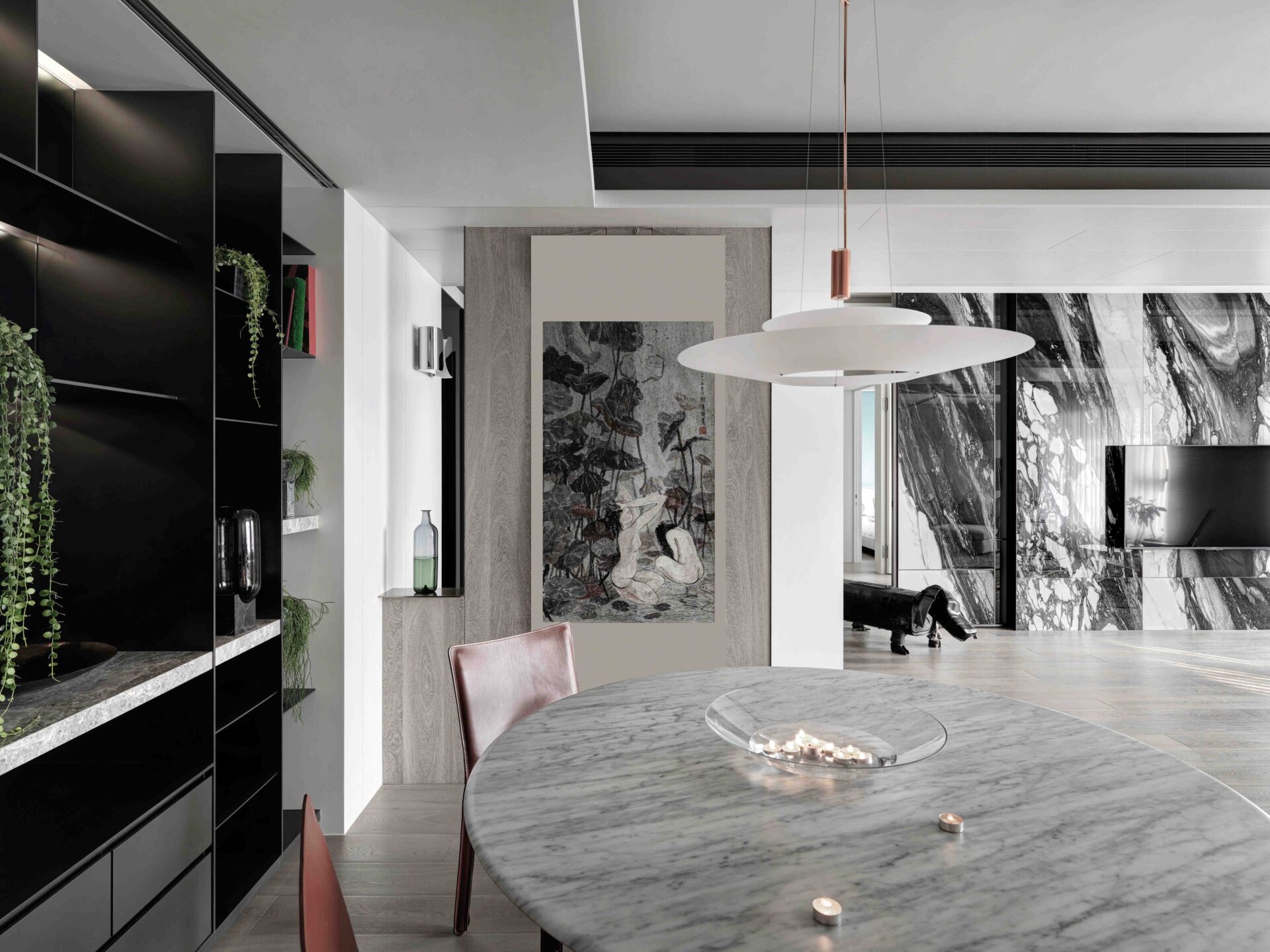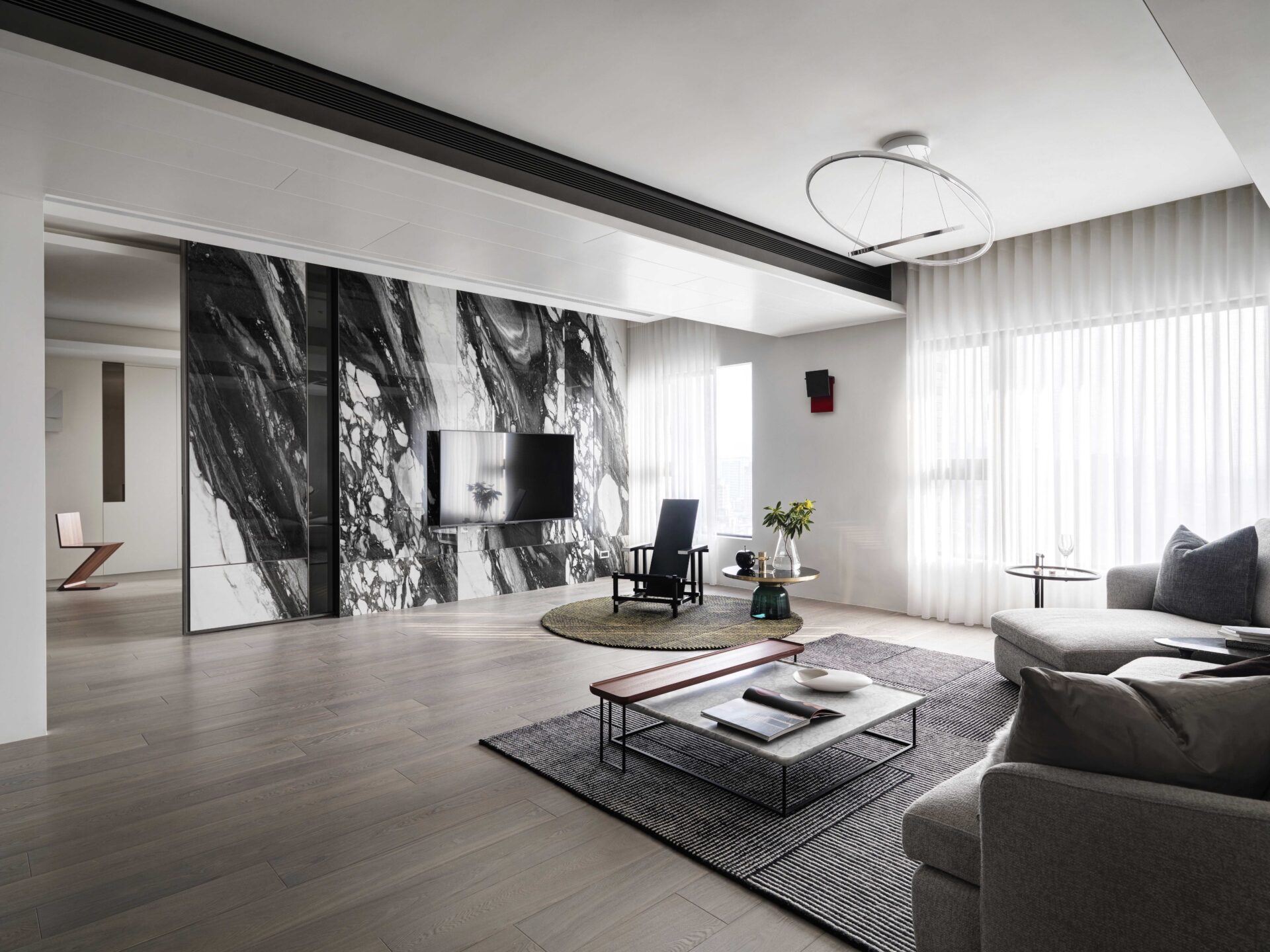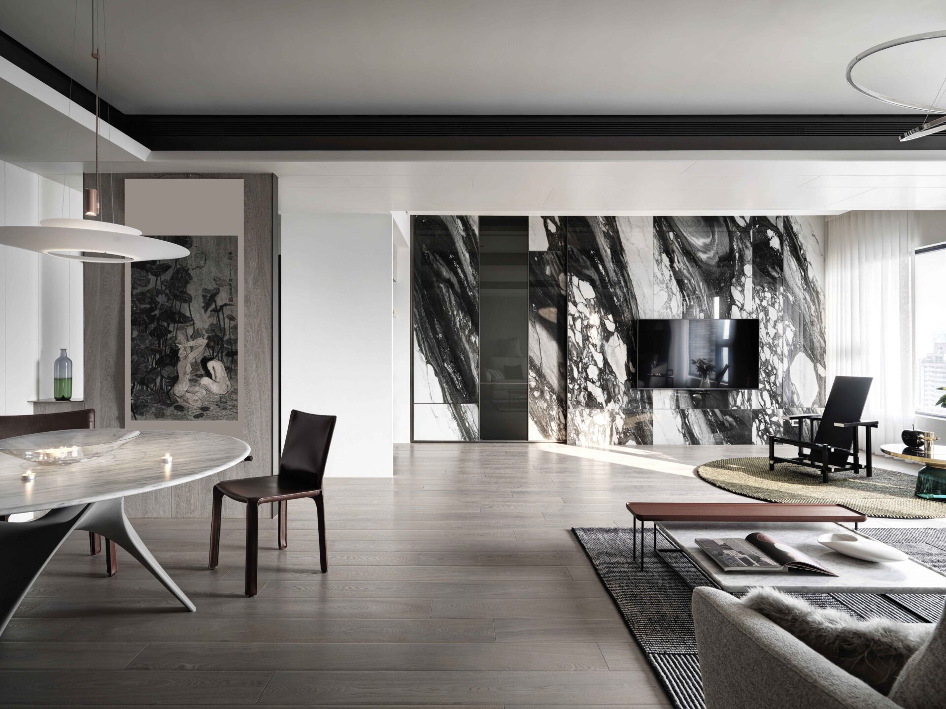 A residence is like a container of life, and space consists of the life experience of those living there. With the passing of time, it becomes more and more bountiful. Everything is a part of the journey of life, and the appearance of space reflects the beauty of daily life. The beautiful mountain scenery draws people's attention. Removing the partition wall and merging the two spaces into one and connecting windows on the two sides to form a massive window allows a large amount of light and outdoor scenery into the house. As for the layout design, the two ends of the space were planned as private areas, and the center the public, so that when passing through each area, one will be able to see exquisite scenery. Lines, geometry, and other elements illustrate the space, and in order to give it a center of gravity and a rich atmosphere, the designer utilized black granite to connect this focal point. The meandering surface of the black granite not only gives people a sense of flow but also interacts with the landscape outside the window, so that the distant mountain landscape seems to be included in the space, forming a Shan Shui painting, giving people inside a comfort as if they were in nature.
