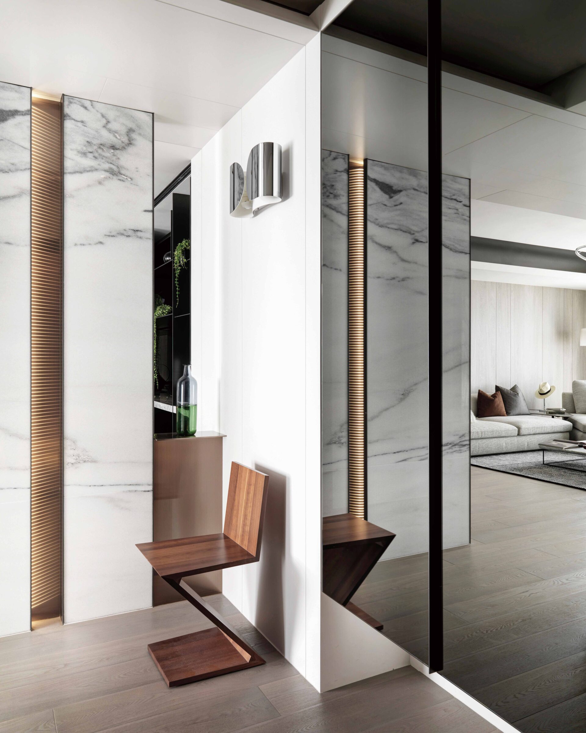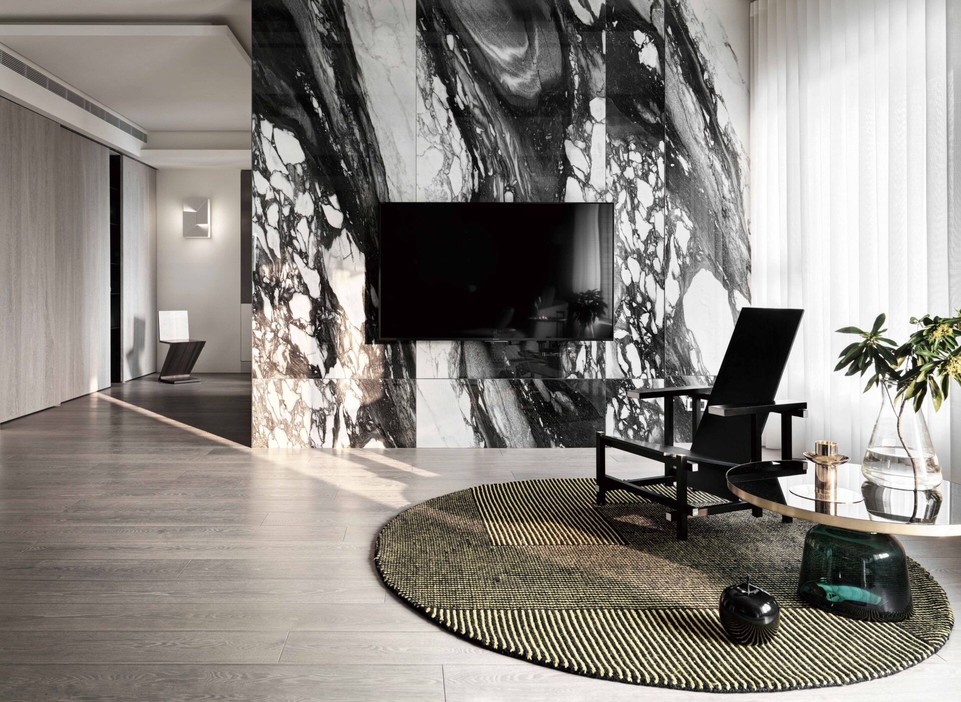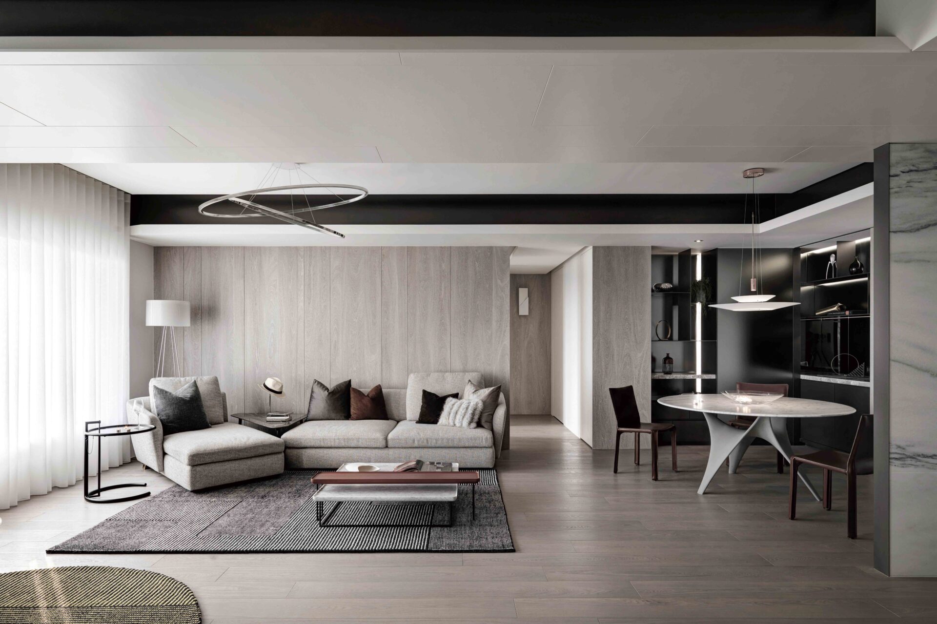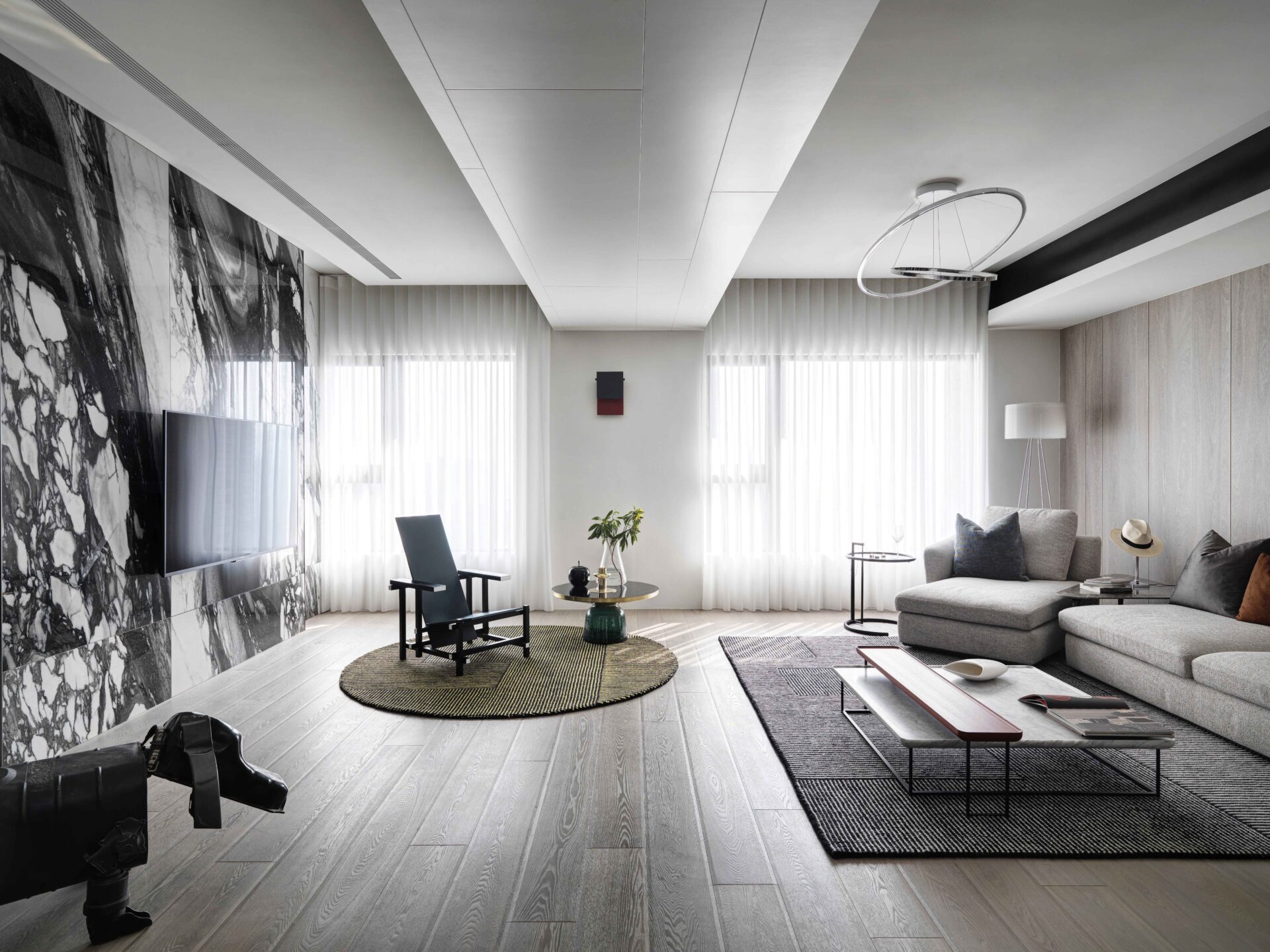 A residence is like a container of life, and space consists of the life experience of those living there. With the passing of time, it becomes more and more bountiful. Everything is a part of the journey of life, and the appearance of space reflects the beauty of daily life. The beautiful mountain scenery draws people's attention. Removing the partition wall and merging the two spaces into one and connecting windows on the two sides to form a massive window allows a large amount of light and outdoor scenery into the house. As for the layout design, the two ends of the space were planned as private areas, and the center the public, so that when passing through each area, one will be able to see exquisite scenery. Lines, geometry, and other elements illustrate the space, and in order to give it a center of gravity and a rich atmosphere, the designer utilized black granite to connect this focal point. The meandering surface of the black granite not only gives people a sense of flow but also interacts with the landscape outside the window, so that the distant mountain landscape seems to be included in the space, forming a Shan Shui painting, giving people inside a comfort as if they were in nature.