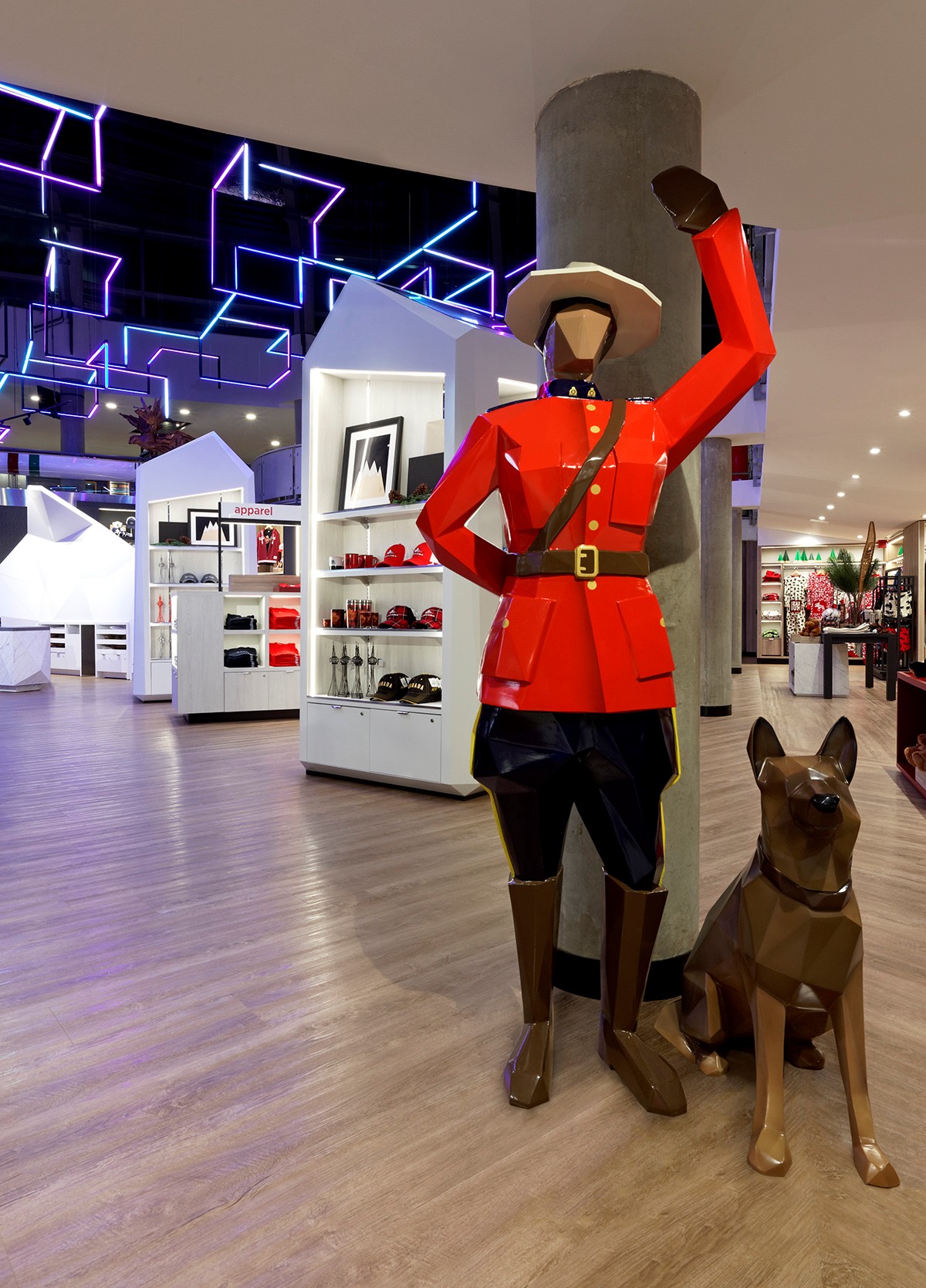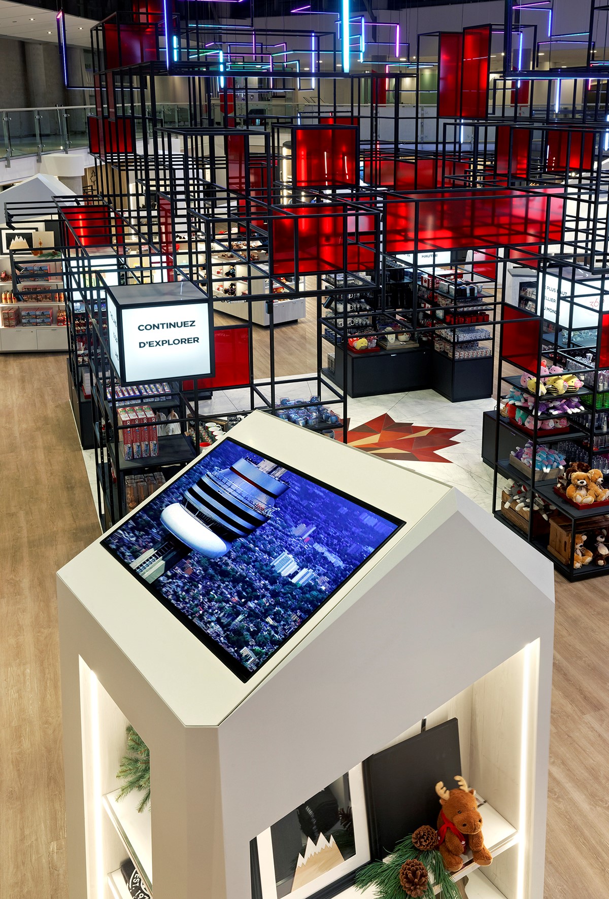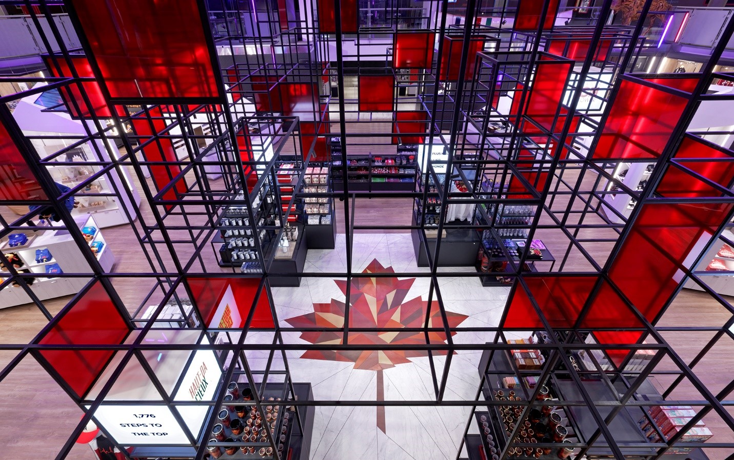 The CN Tower Retail Shop is located in the base of one of the world’s highest free-standing structures where each year over 2 million people visit, as a symbol of pride for Canadians. This awe-inspiring architectural wonder invites visitors to explore a multi-sensory environment infused with iconic symbols Canada’s iconography and typography. From first approach up the triple storey mezzanine space into entrance ramp, visitors get a glimpse of the energetic ‘Northern Lights-inspired’ sculptural LED-lighting display, suspended above the retail environment below. The installation is ever-changing and thematically programmable in-house, reminiscent of the Tower’s exterior lighting system, designed for night time illumination that honours the legacy of this national icon and landmark. As you enter the triple storey light-filled retail space, you are welcomed by high airy ceilings and the dynamic City Grid. Masterfully conceived and inspired by a retail fixture, made from a black metallic 3D-grid assembly, it represents Toronto’s city grid in a structural open grid format. Drawing visitors eyes upwards, the structure rises through the triple storey space with solid white plexi-glass light boxes that highlight interesting attraction facts, while seamlessly connecting to the suspended LED-lighting display, while framing a large, red maple leaf mosaic, made up of a variety of inlayed faceted tiles in a tribute to Canada’s preeminent national symbol. The low-energy lighting design is thoughtfully-considered throughout the entire space: as a unifying, conceptual feature through the ceiling installation, as a framing device delineating the iceberg retail towers and a means of ambient and spot lighting, highlighting the merchandise. The flow of movement throughout the space was well-considered, with new perspectives and thematic clusters of products around every corner. Two multi-dimensional ‘Cash Glaciers’ mirror one another, bookending each side of the exit. The CN Tower Gift Shop has received significant praise by international and local visitors, who enjoy the improved authentic details and products that proudly celebrate Canadian heritage. The firm has created an experience that successfully embodies the uniqueness and excitement of the nation within the base of the CN Tower. A new retail legacy is born, with enduring benefits worthy of the increasing global reputation and stature of Toronto, Canada.