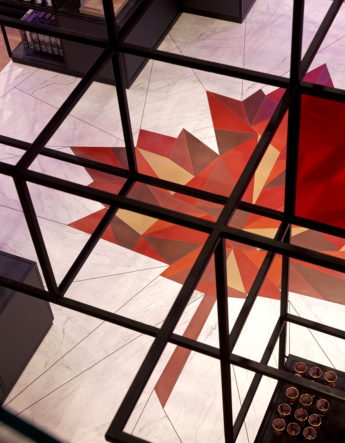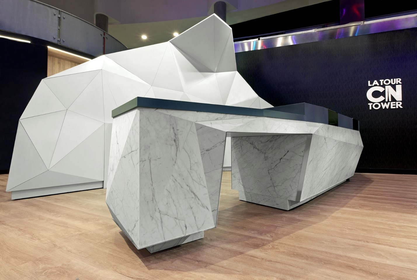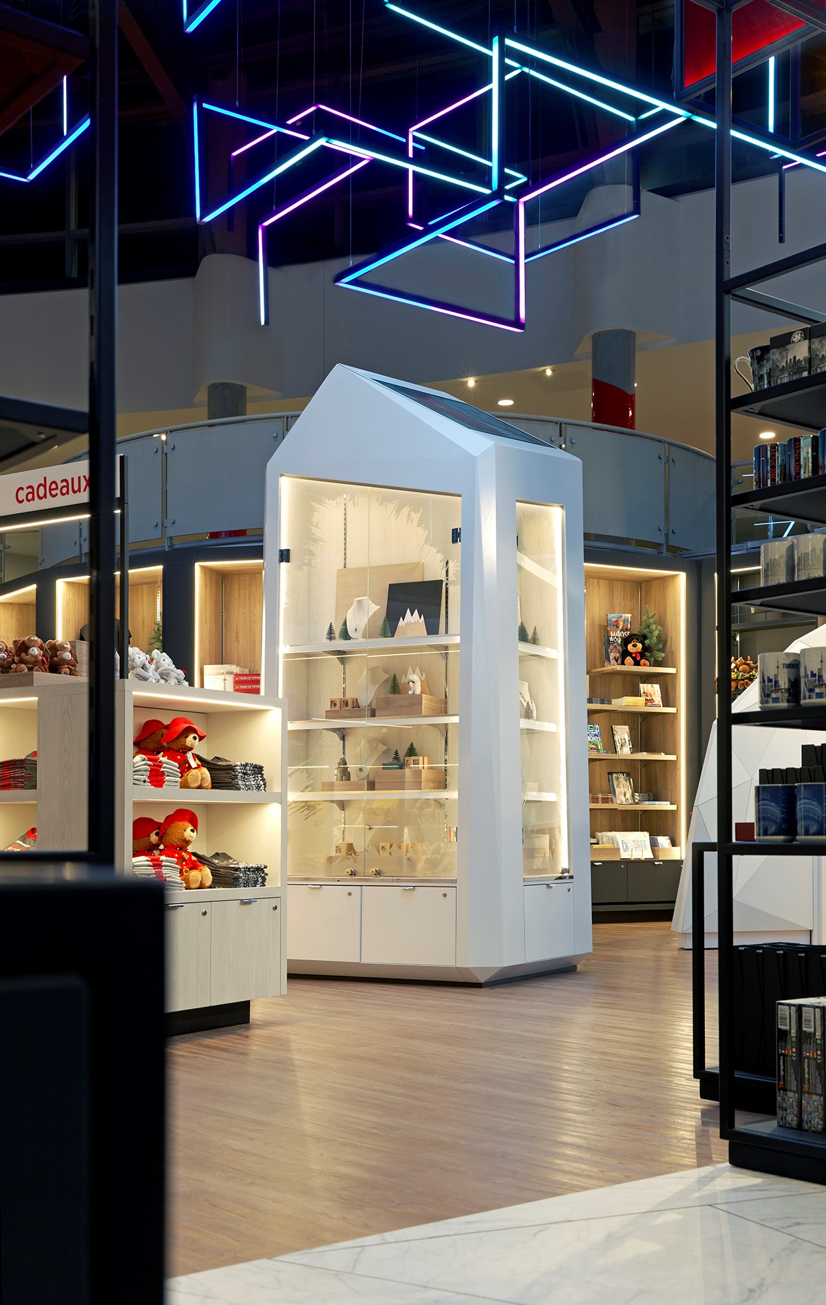The CN Tower Retail Shop is located in the base of one of the world’s highest free-standing structures where each year over 2 million people visit, as a symbol of pride for Canadians. This awe-inspiring architectural wonder invites visitors to explore a multi-sensory environment infused with iconic symbols Canada’s iconography and typography. From first approach up the triple storey mezzanine space into entrance ramp, visitors get a glimpse of the energetic ‘Northern Lights-inspired’ sculptural LED-lighting display, suspended above the retail environment below. The installation is ever-changing and thematically programmable in-house, reminiscent of the Tower’s exterior lighting system, designed for night time illumination that honours the legacy of this national icon and landmark. As you enter the triple storey light-filled retail space, you are welcomed by high airy ceilings and the dynamic City Grid. Masterfully conceived and inspired by a retail fixture, made from a black metallic 3D-grid assembly, it represents Toronto’s city grid in a structural open grid format. Drawing visitors eyes upwards, the structure rises through the triple storey space with solid white plexi-glass light boxes that highlight interesting attraction facts, while seamlessly connecting to the suspended LED-lighting display, while framing a large, red maple leaf mosaic, made up of a variety of inlayed faceted tiles in a tribute to Canada’s preeminent national symbol. The low-energy lighting design is thoughtfully-considered throughout the entire space: as a unifying, conceptual feature through the ceiling installation, as a framing device delineating the iceberg retail towers and a means of ambient and spot lighting, highlighting the merchandise. The flow of movement throughout the space was well-considered, with new perspectives and thematic clusters of products around every corner. Two multi-dimensional ‘Cash Glaciers’ mirror one another, bookending each side of the exit. The CN Tower Gift Shop has received significant praise by international and local visitors, who enjoy the improved authentic details and products that proudly celebrate Canadian heritage. The firm has created an experience that successfully embodies the uniqueness and excitement of the nation within the base of the CN Tower. A new retail legacy is born, with enduring benefits worthy of the increasing global reputation and stature of Toronto, Canada.