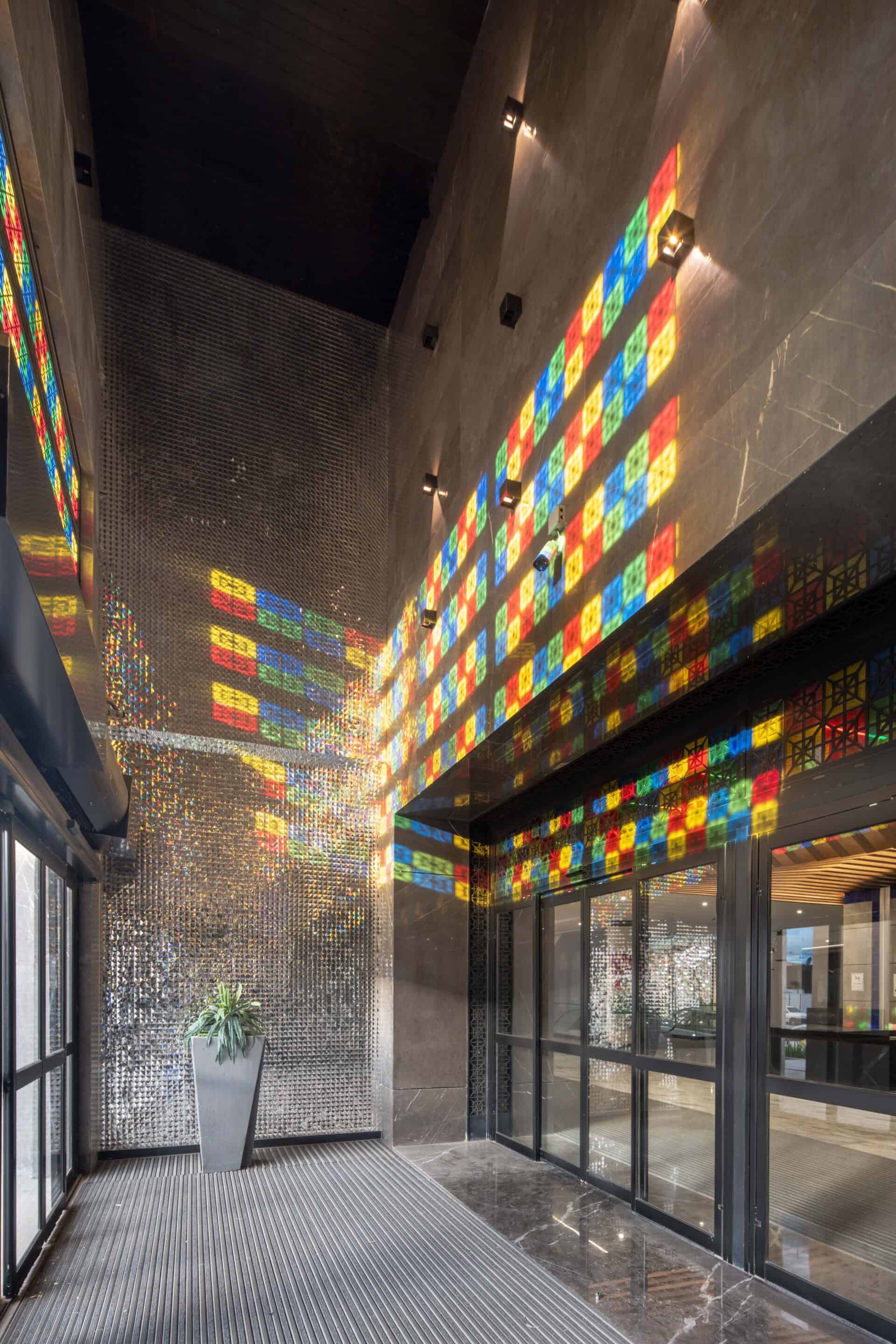 The facade of the complex utilizes traditional Iranian arts such as brick masonry, tile work, plasterwork, and geometric patterns. The corners and edges of the facade also feature traditional arts like knot-making, framing, muqarnas, and tile work. The use of plants and a water feature in the building's facade and entrance, in addition to their aesthetics, create a calming atmosphere.