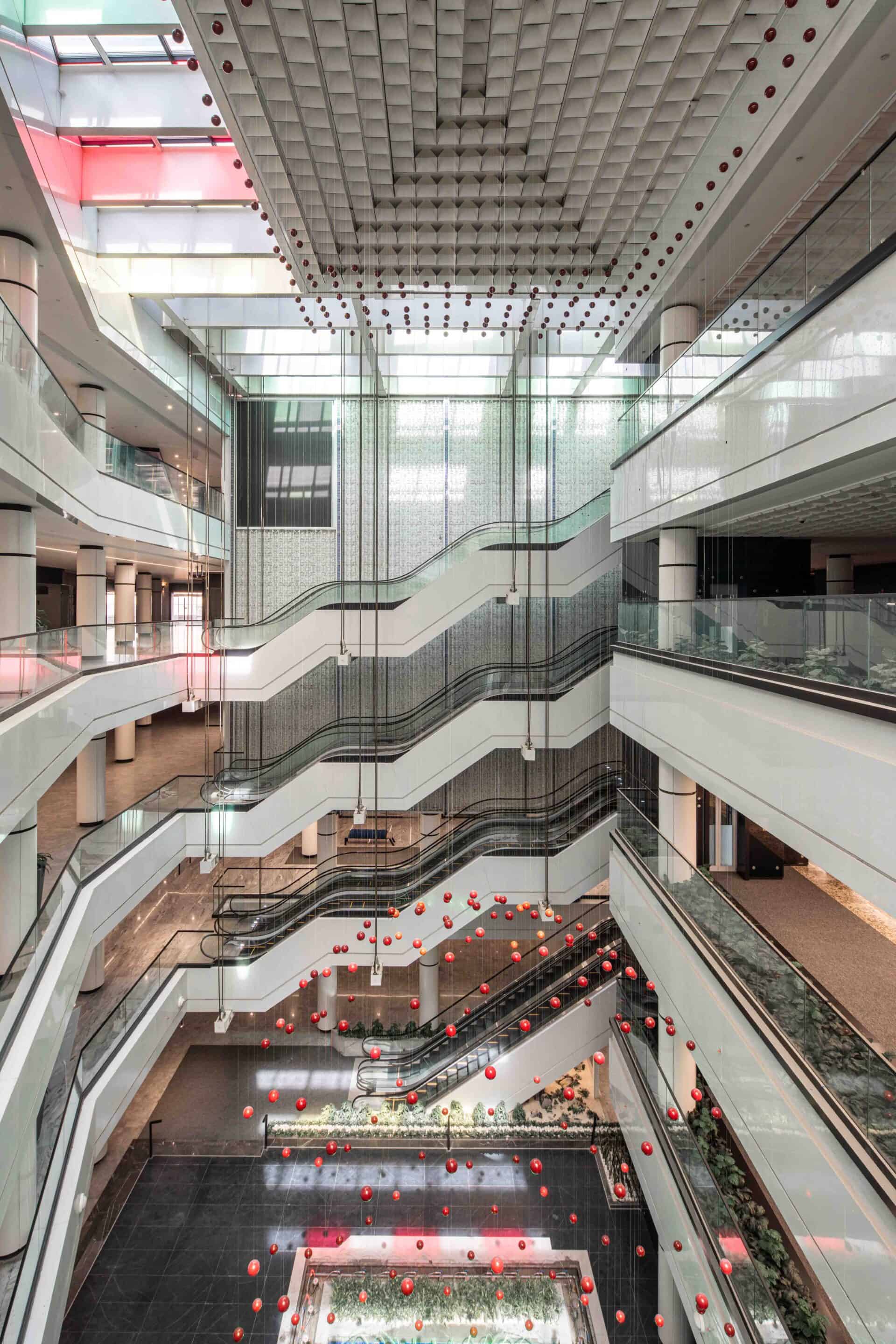 The use of reflected colored lights, moving spheres, and other decorative elements instills a sense of liveliness in the visitors. These elements make the space appear vibrant and lively.