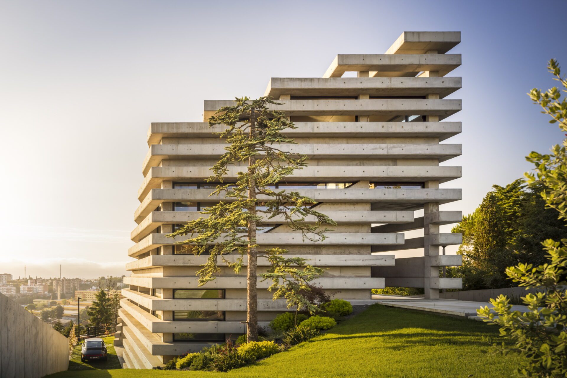 The villa is located in an elevated area with a strong slope in the city of Leiria, Portugal. The conditions of the subdivision suggested a volumetry of a tower, a viewpoint over the city. One of our premises was that the social areas were located on the upper floors and the swimming pool on the roof, to enjoy the 360º view.