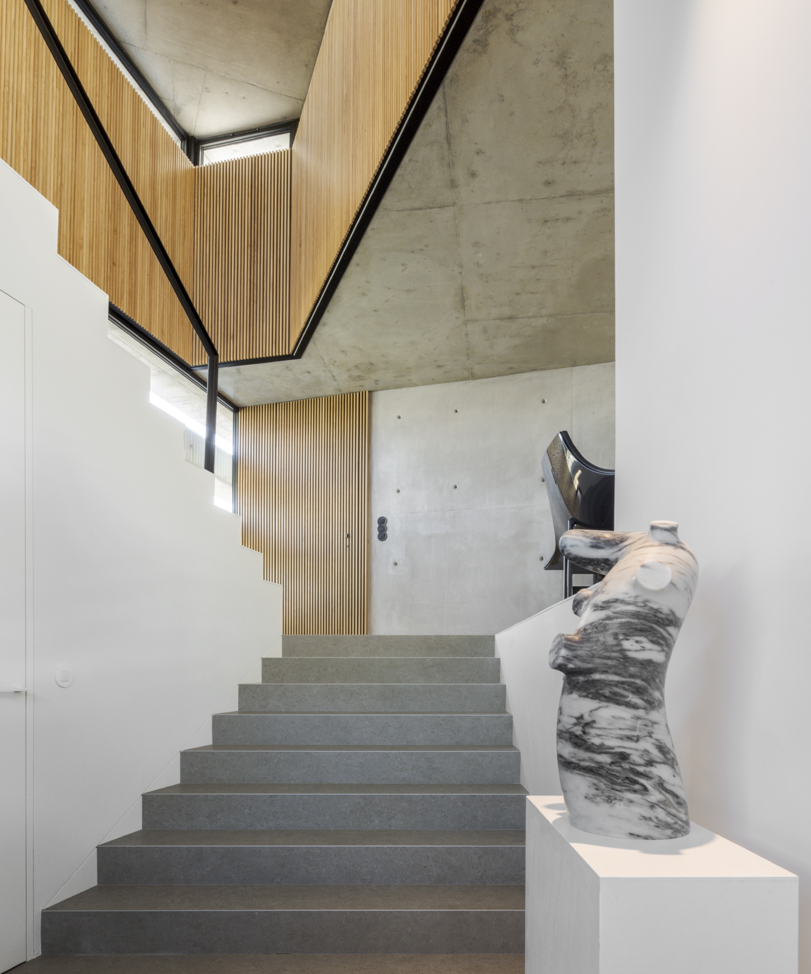 The structure and the concrete outer skin are felt as a single body, rhythmic with 18 horizontal rings, a section corresponding to the height of 2 steps, which design the house in a game of full and empty, creating a protective filter, both solar and privacy, for those who inhabit it.