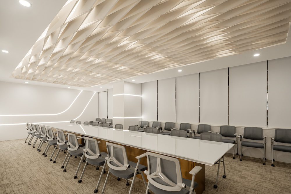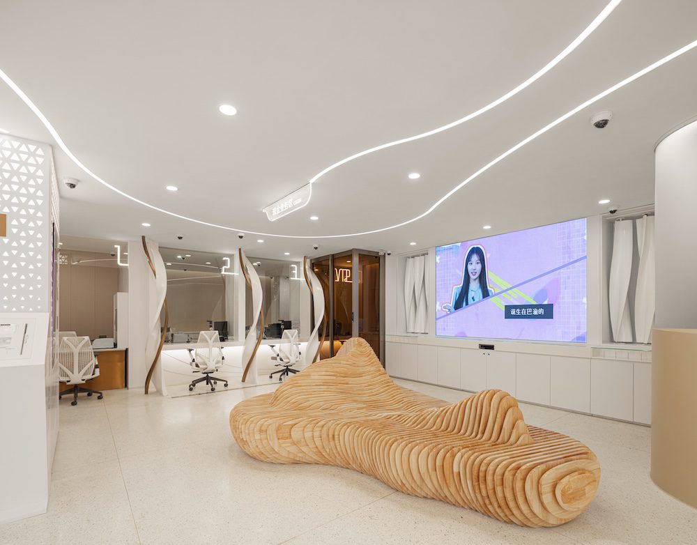Parametric motifs enhance the branch’s futuristic appeal, appearing in exterior and interior elements like seating, wall panels, digital signage, and glass partitions. The vertical parametric partitions serve as subtle dividers between different functional zones, undulating with rhythmic, wave-like movements that maintain an open, organic flow without sacrificing privacy or coherence.