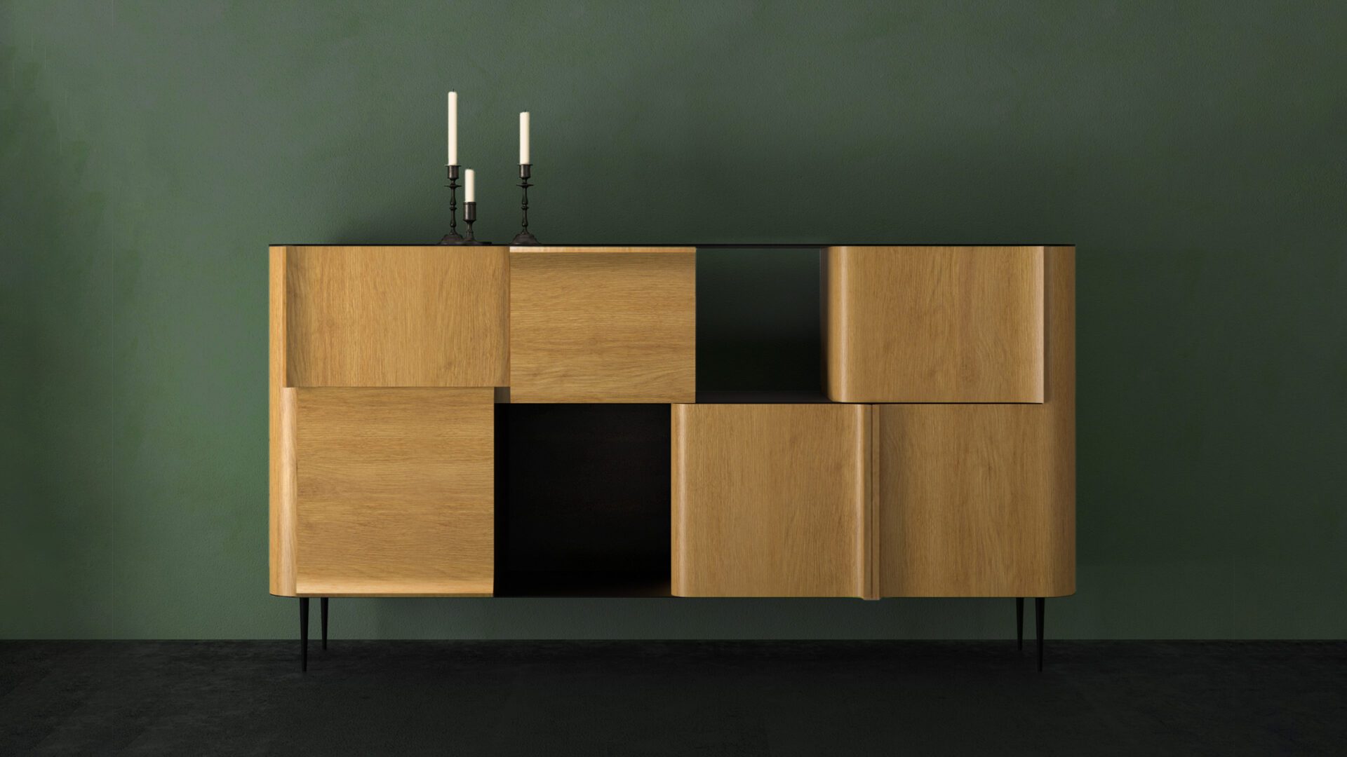 The design of the CURL SERIES draws inspiration from the fluidity found in nature, moving away from flat surfaces to introduce cabinet doors with curves that evoke a sense of movement and life. Inspired by the image of wind blowing across a sheet of paper, the cabinet doors convey a feeling of lightness and flow, as if frozen in motion. The panels’ subtle undulations enhance the visual appeal while doubling as integrated handles, providing an innovative solution that reduces the need for additional materials and enriches the furniture’s aesthetic impact.