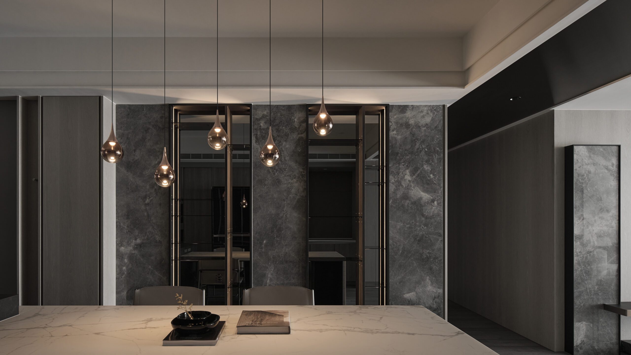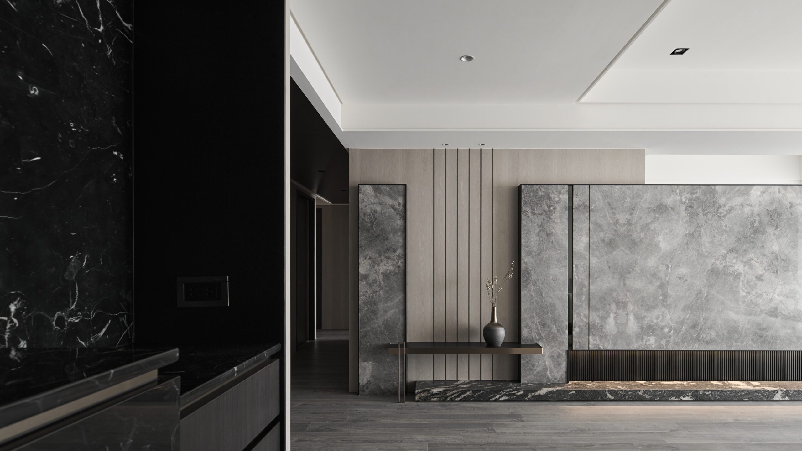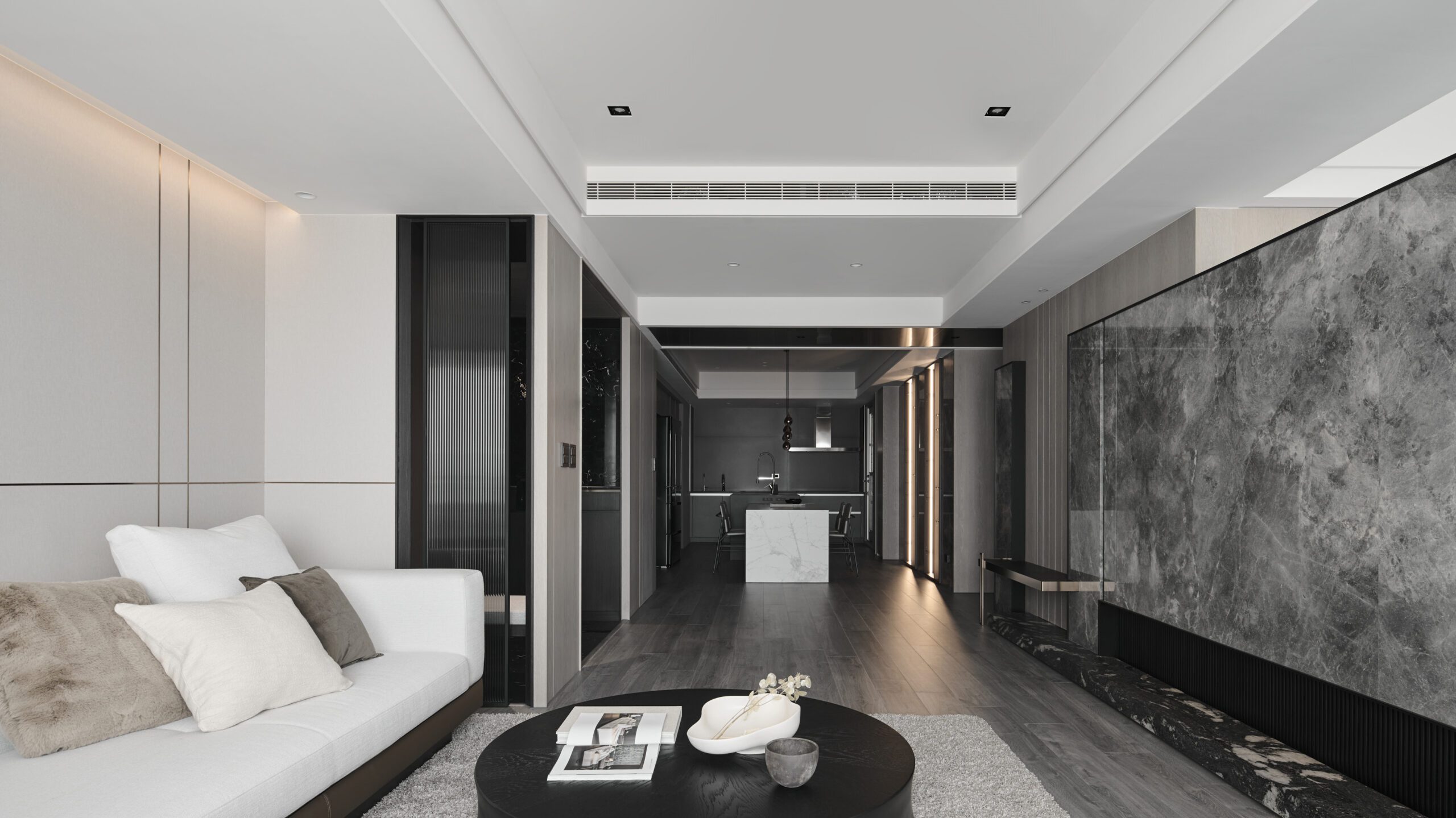 The dark-toned entranceway delineates the boundary of the space clearly through compressed wood veneer ceilings and stone floors. In terms of color, the elegant living room contrasts sharply with the entranceway. As the focus of the open space, the feature wall reserved appropriate white space to draw a visual balance and use lines and geometric techniques to depict the outline of the space. Drawing the flow of air and spatial rhythm, the designer created a spatial volume with both aesthetics and function.