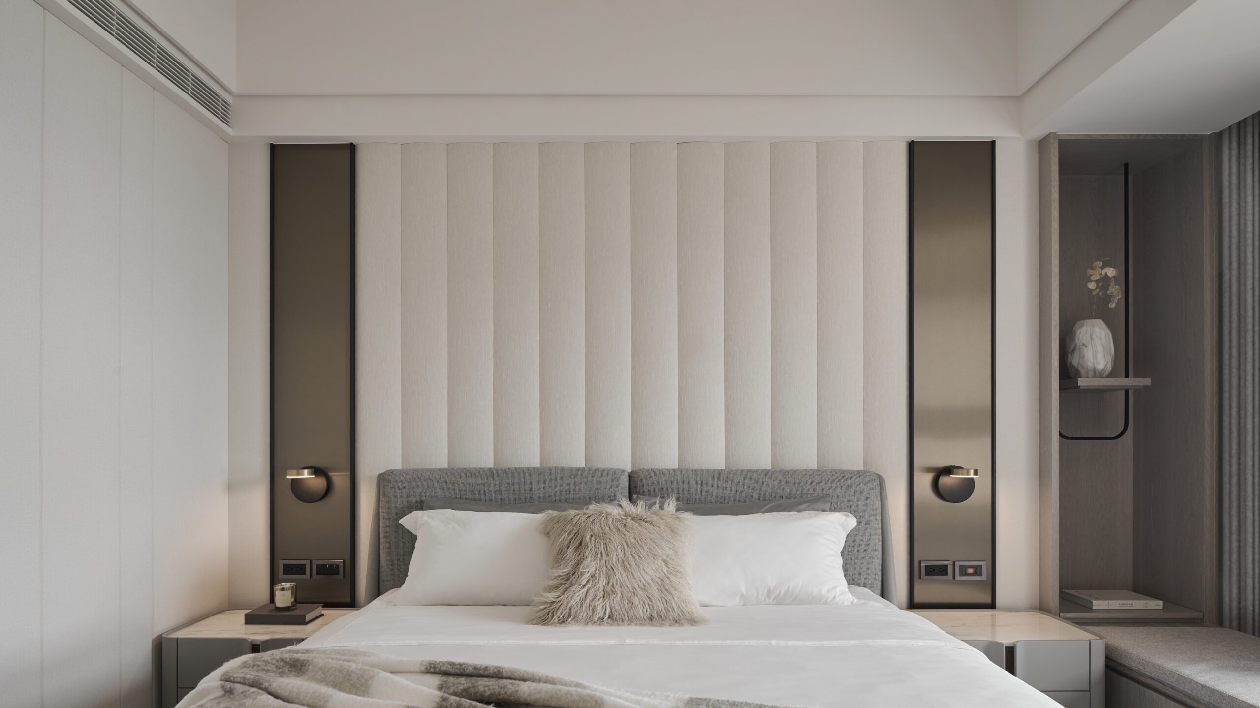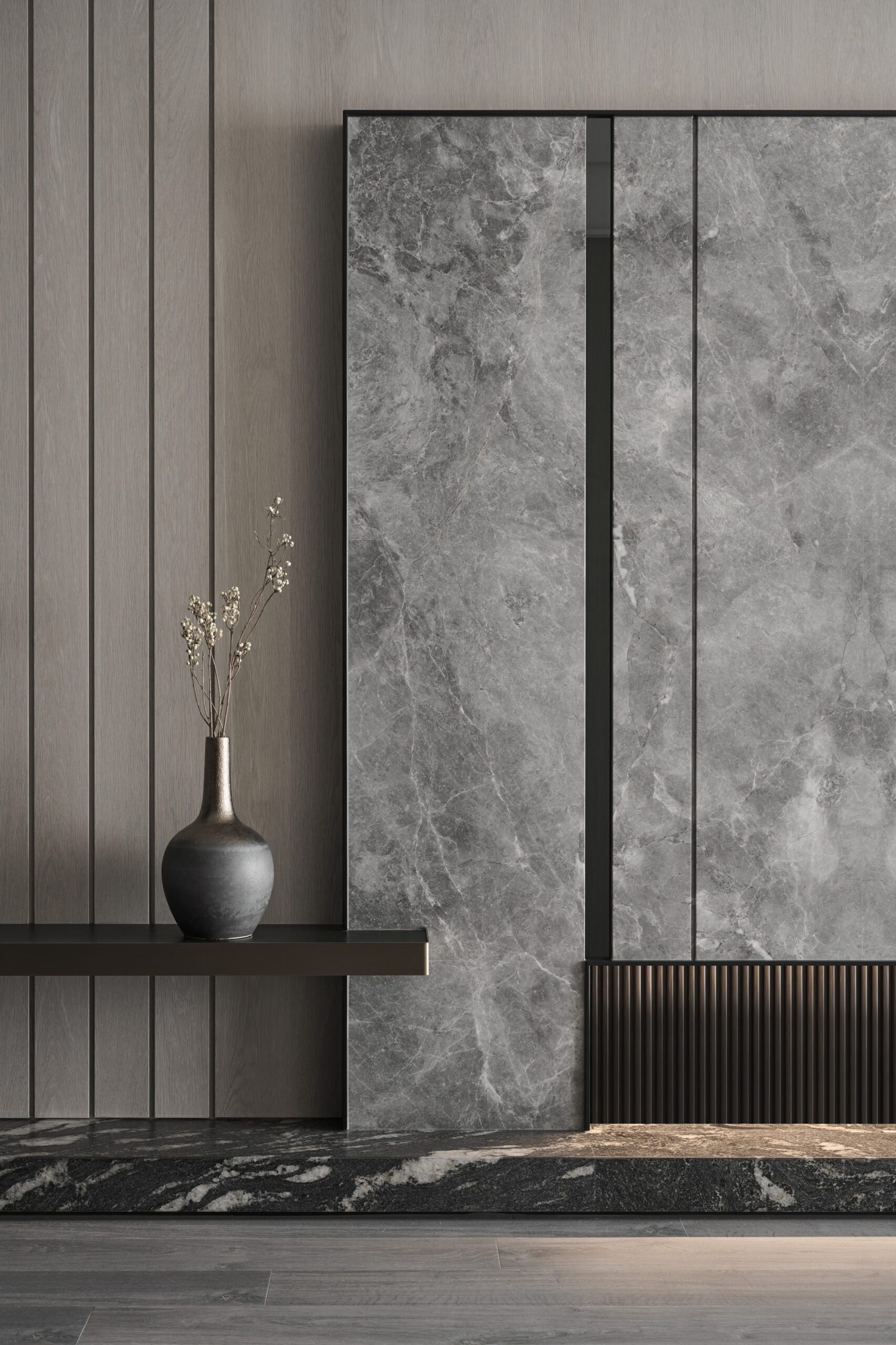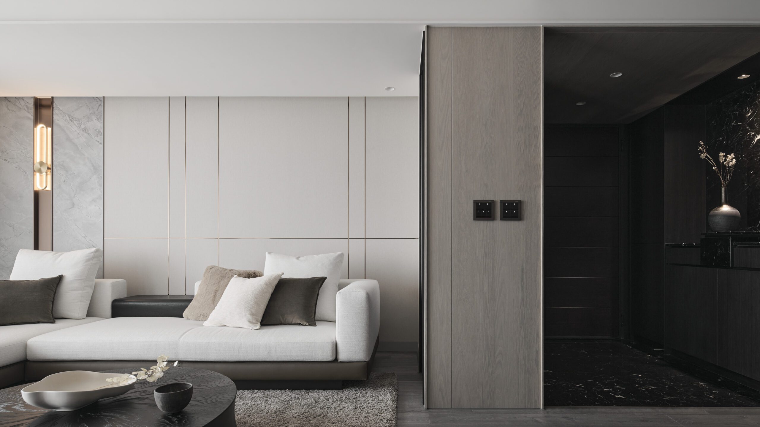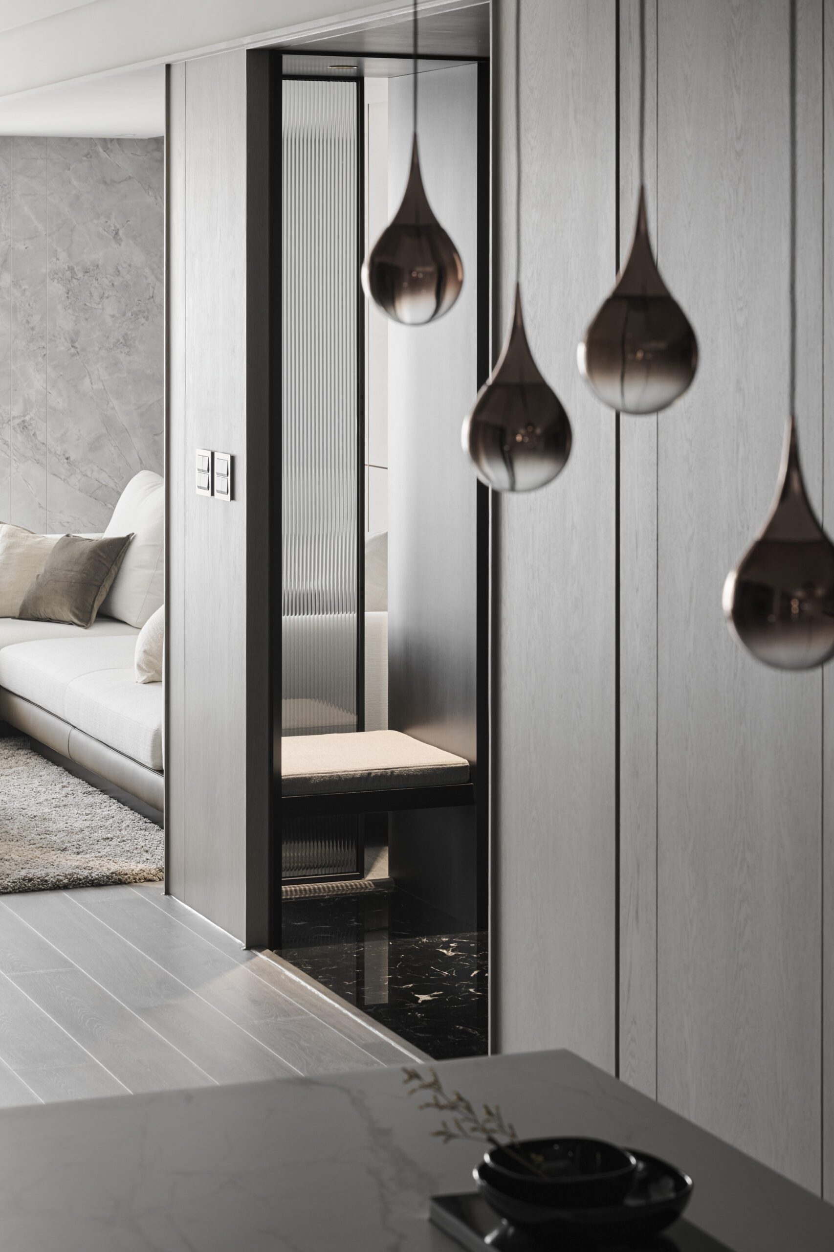 The dark-toned entranceway delineates the boundary of the space clearly through compressed wood veneer ceilings and stone floors. In terms of color, the elegant living room contrasts sharply with the entranceway. As the focus of the open space, the feature wall reserved appropriate white space to draw a visual balance and use lines and geometric techniques to depict the outline of the space. Drawing the flow of air and spatial rhythm, the designer created a spatial volume with both aesthetics and function.
