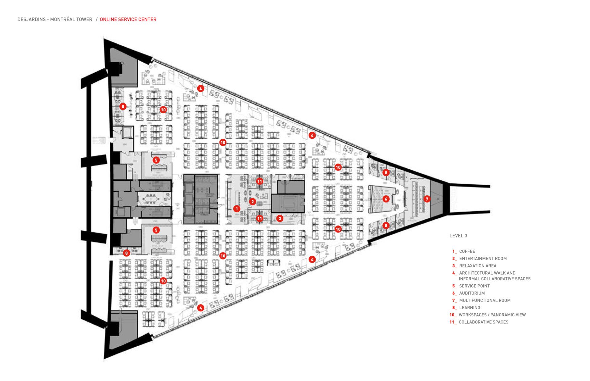 Designed by architect Roger Taillibert in 1976, the inclined tower of Montréal's Olympic Stadium, one of the city’s iconic buildings, greeted its first tenants, the Desjardins Group, in 2018. A complete work of architecture and interior design was carried out, with the rehabilitation of the façades and the restructuring of the interior spaces. Driven by a simple yet ambitious objective - to inhabit a symbol and its history - the design, adapted to the Olympic Stadium’s organic volumes, fosters interaction and creativity with ultramodern offices that act as a work tool. With the selection of historical references to the stadium’s primary vocation, the Olympic spirit stays omnipresent. The streamlined contemporary style inspired a strong sense of belonging, moving beyond the creation of a workplace to that of an animated, living space.