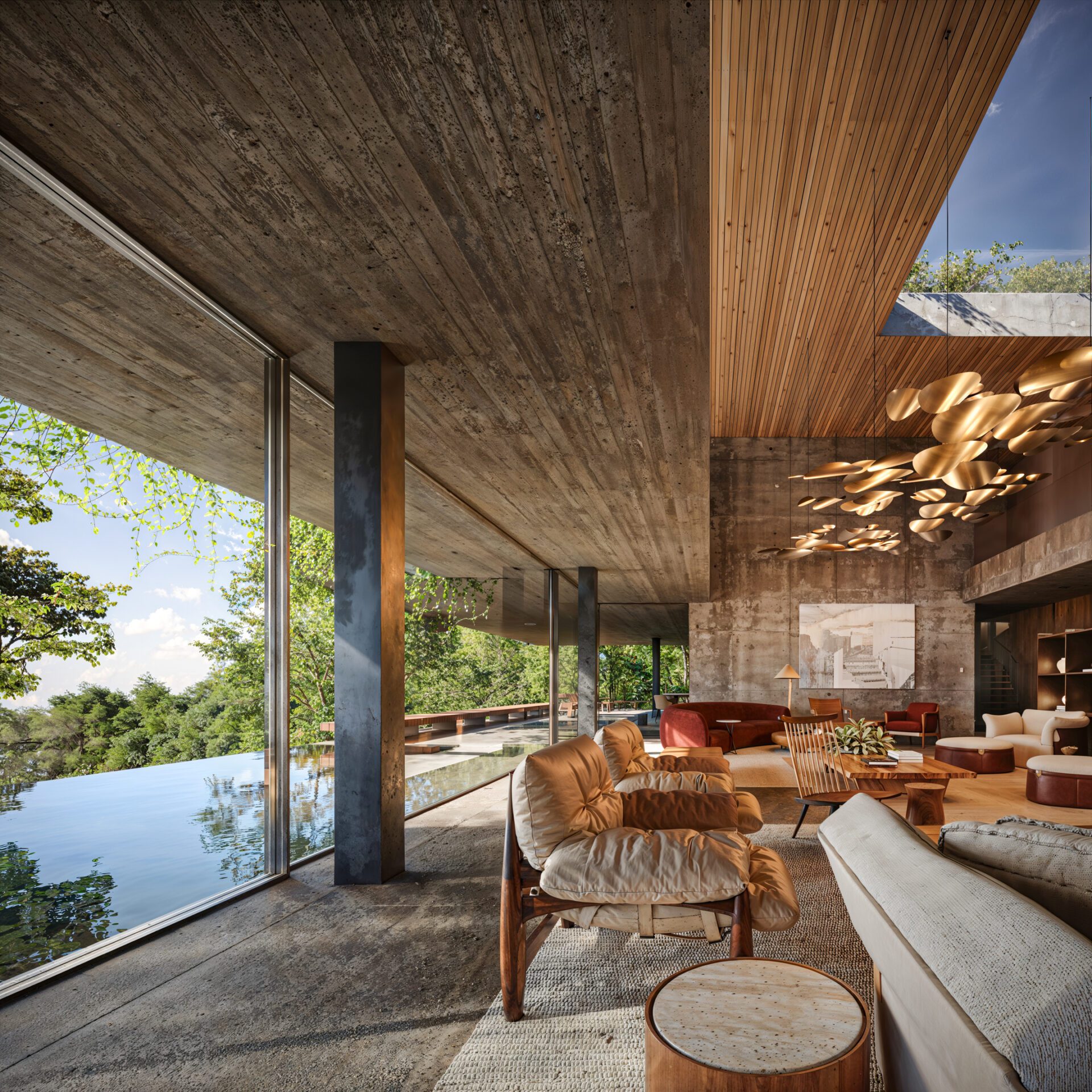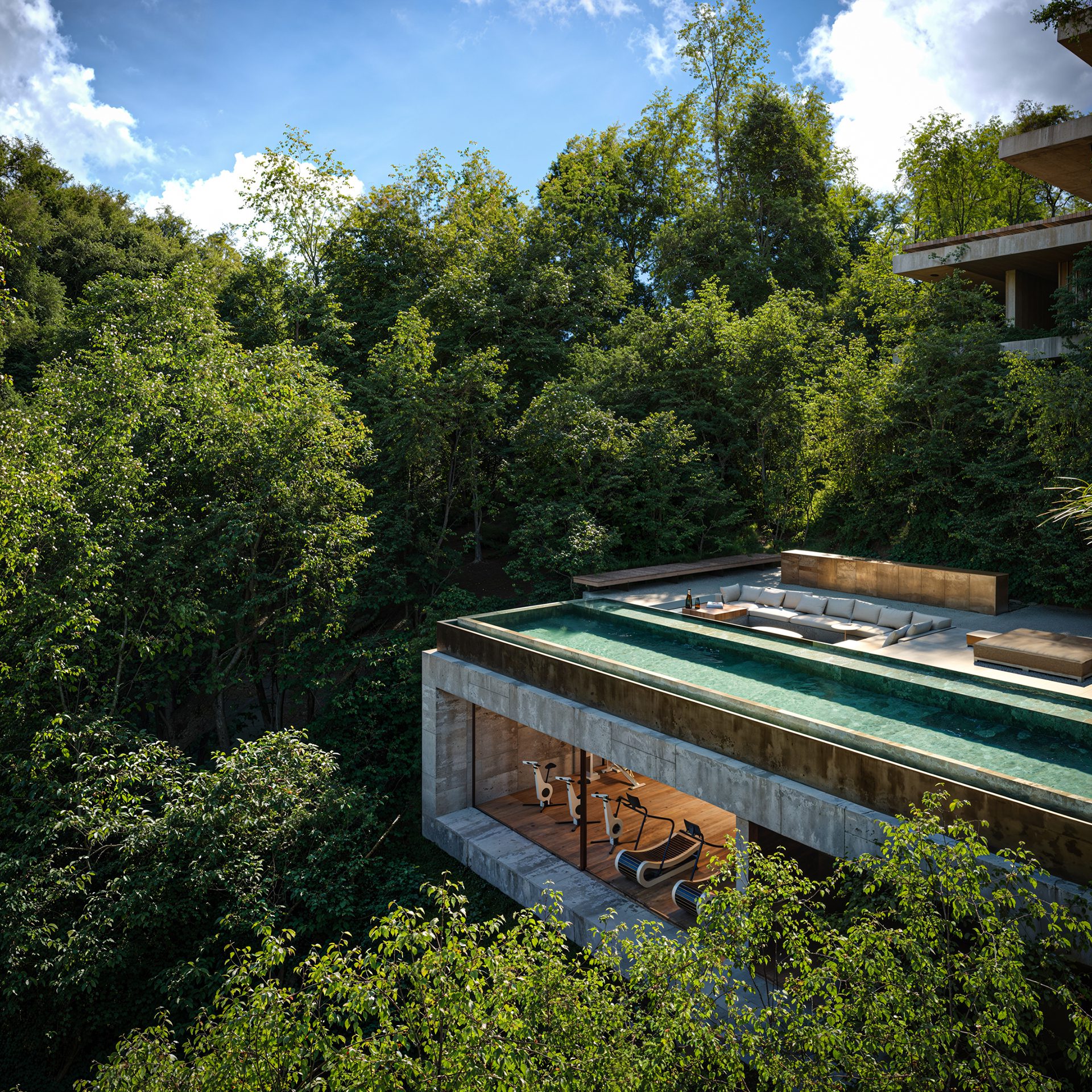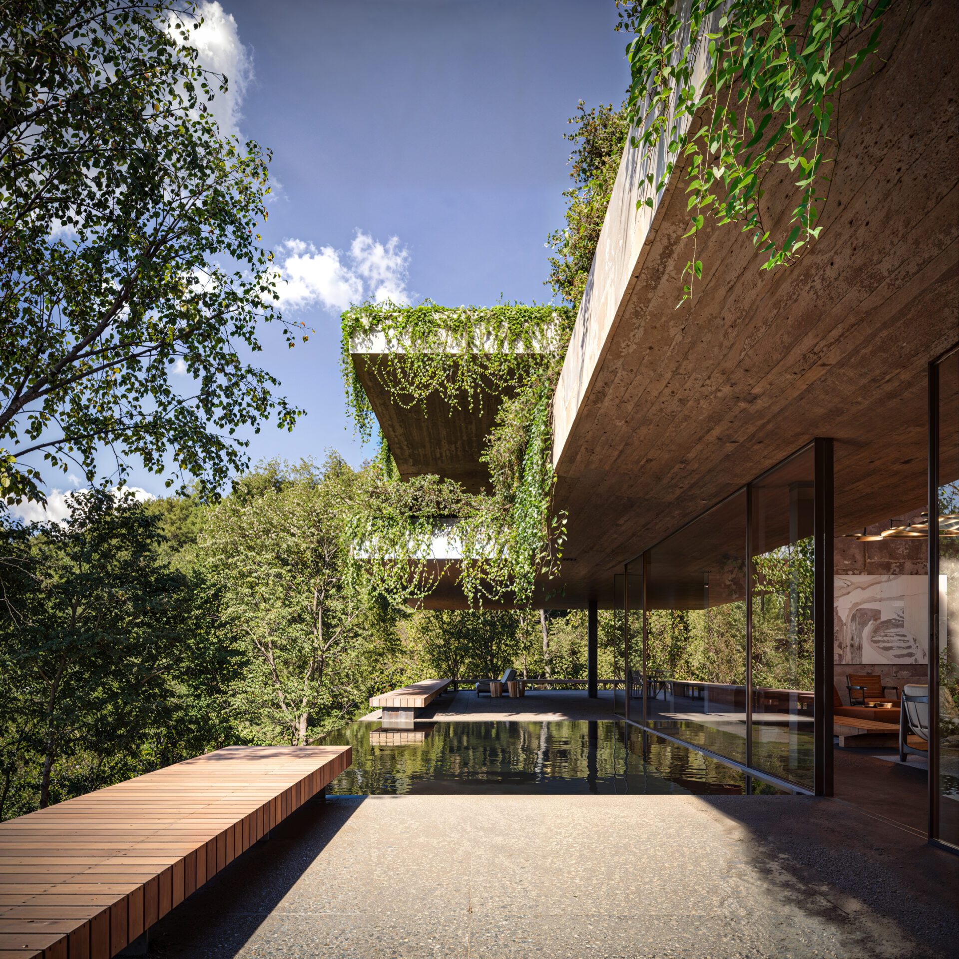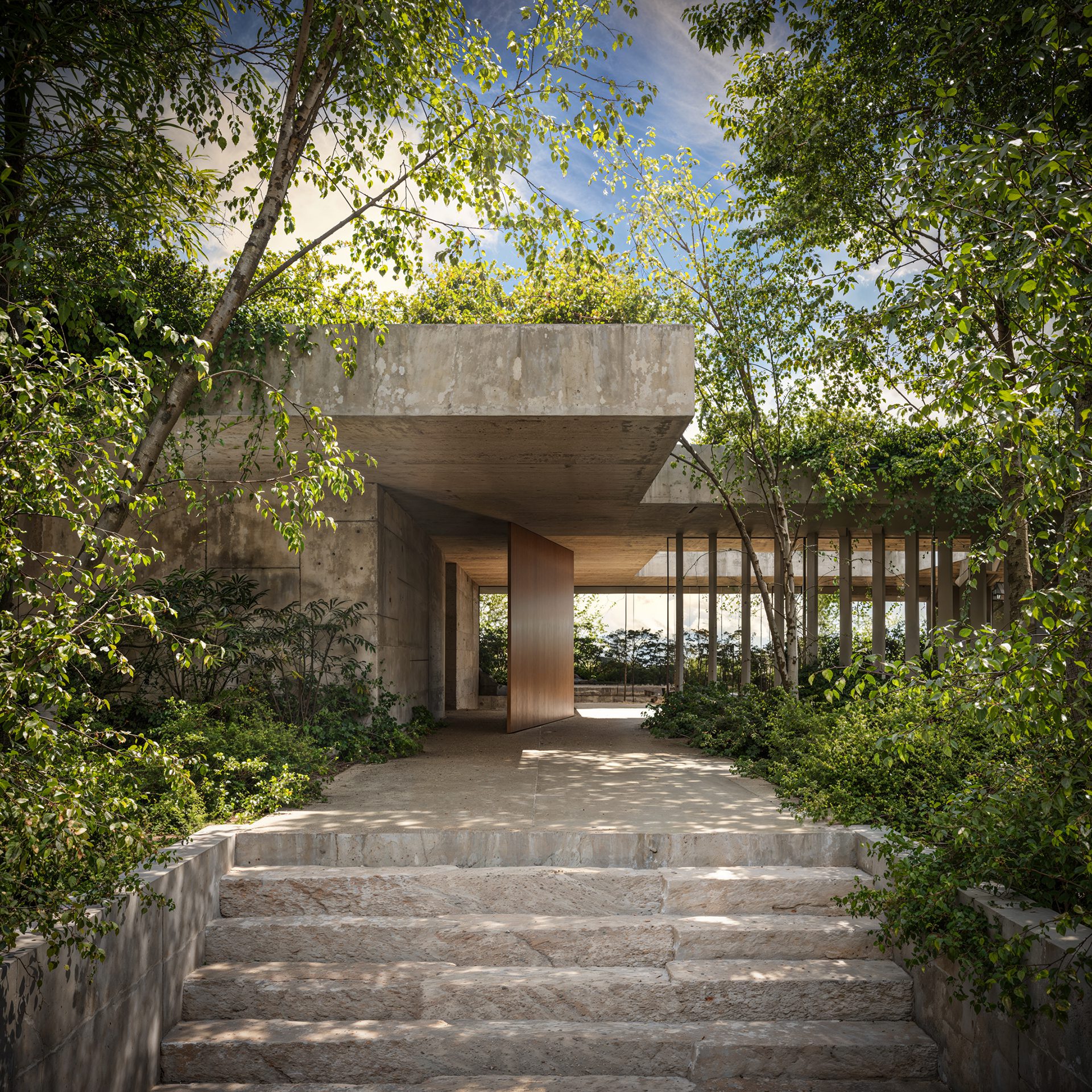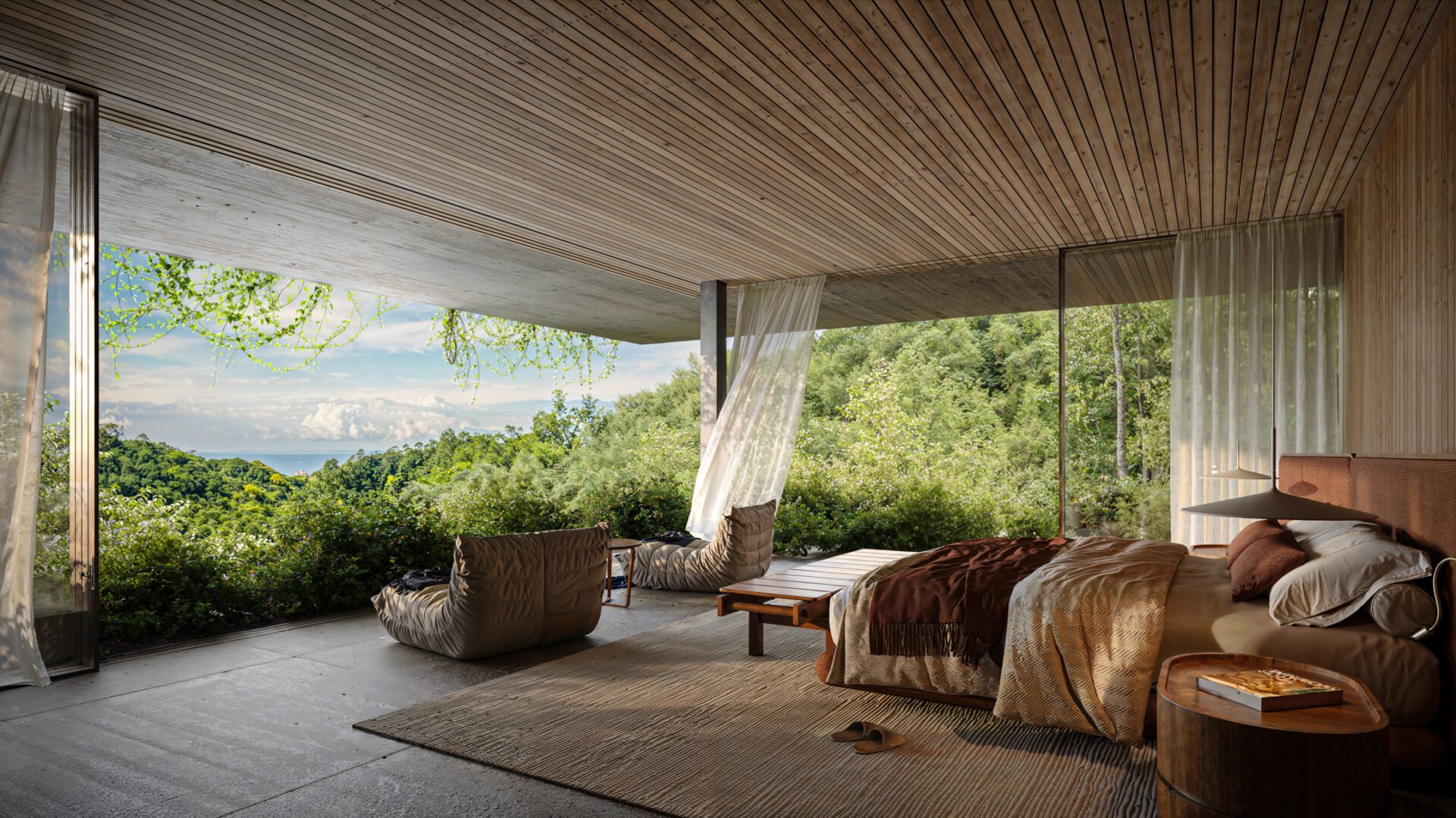 The inspiration was to create a peaceful, welcoming refuge for the client and his close circle of friends and family—used for rest, reconnection, and creativity. The house is a personal retreat that combines raw natural materials with ultra-high-end comfort. It should feel timeless, solid, and adaptable, with a potential nod to Mexican Brutalism, while still maintaining warmth and intimacy. The architectural narrative is driven by the desire to host, relax, and be immersed in nature—with open windows, breezes, and shifting light contributing to a calm, sensory-rich atmosphere that blends seamlessly with the surrounding landscape.