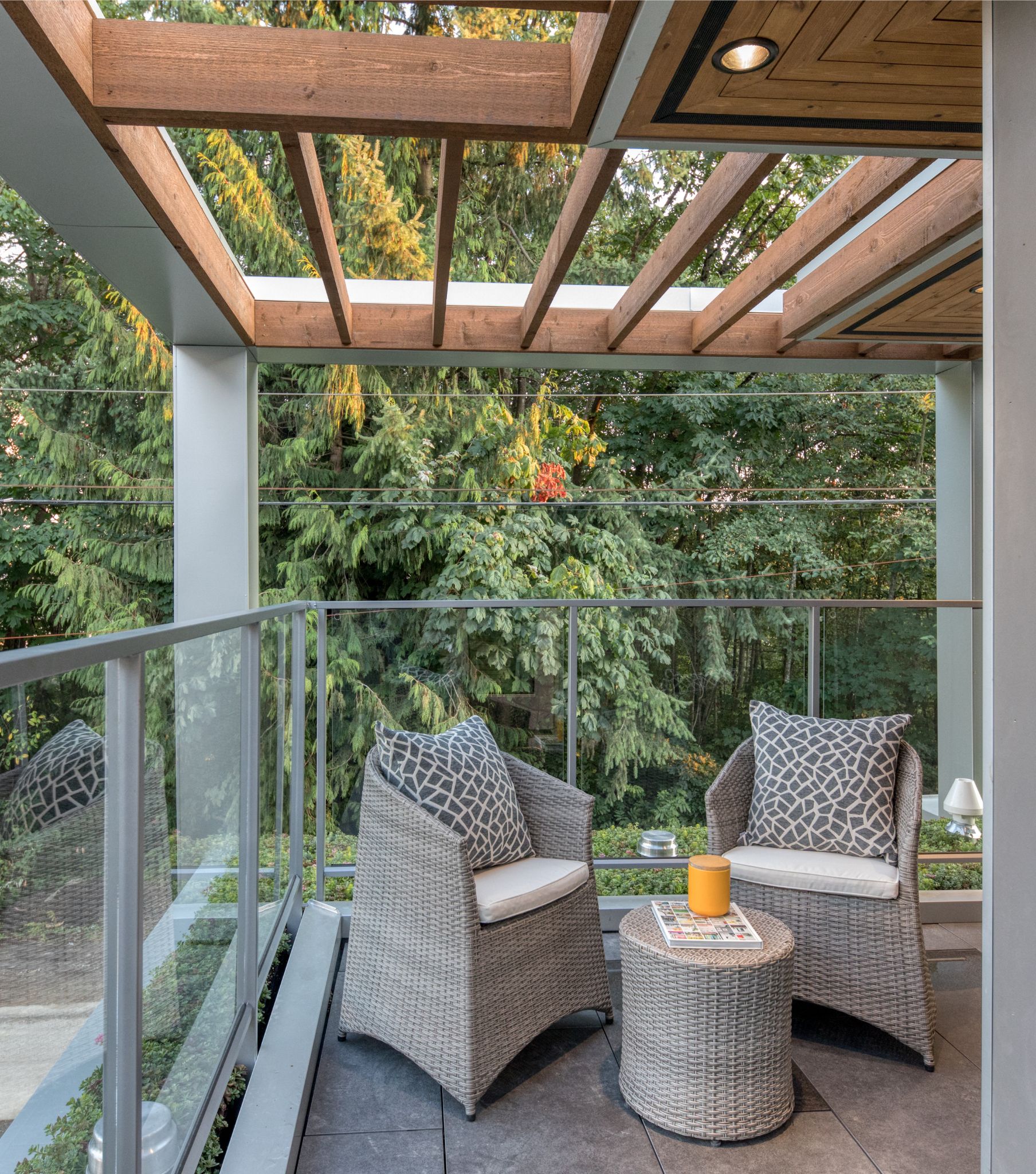 Upstairs, both bedrooms share a thoughtfully designed jack and jill ensuite bathroom. The primary bedroom opens to a rooftop deck framed by a live roof and cedar trellis, blending greenery with privacy and passive cooling.
