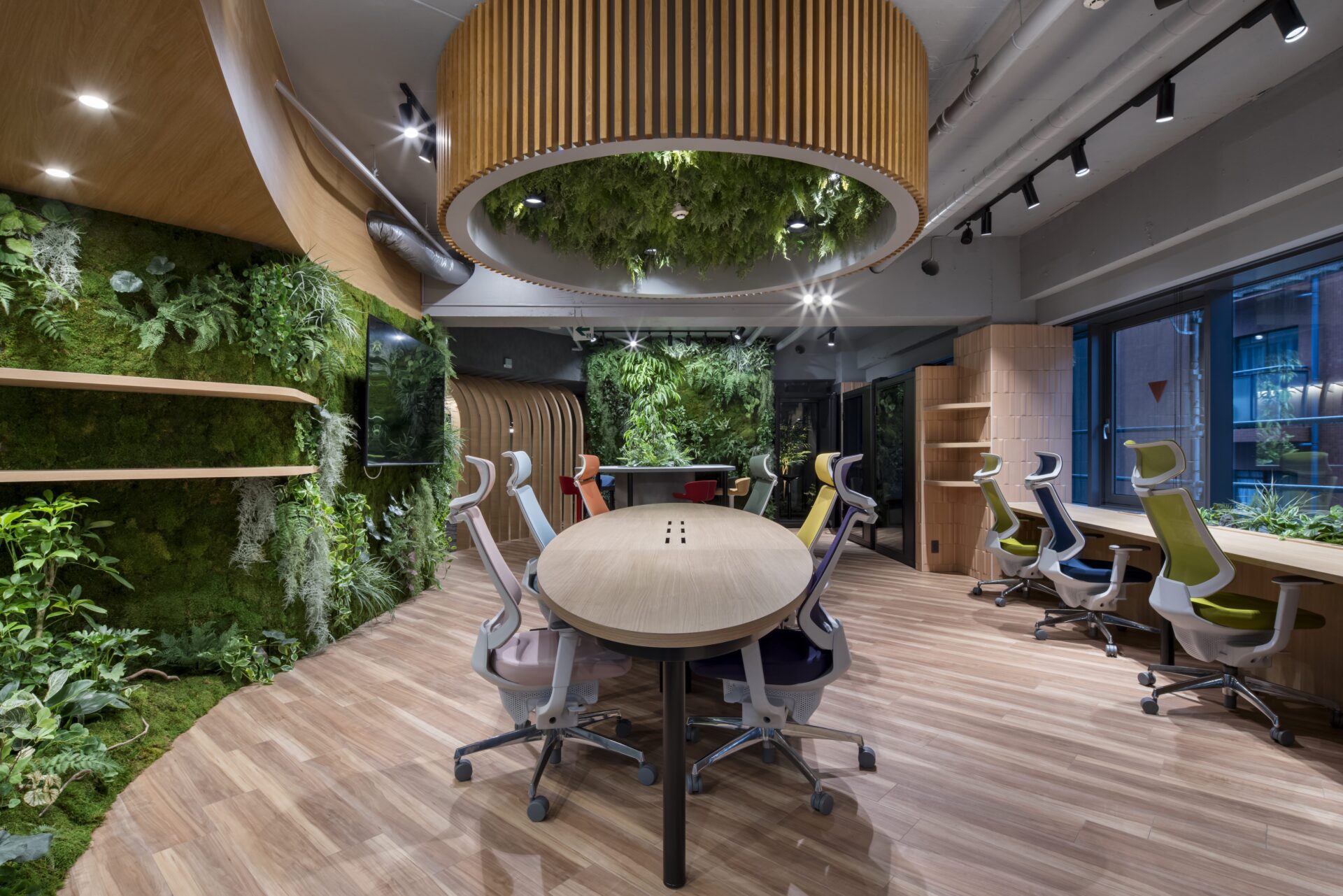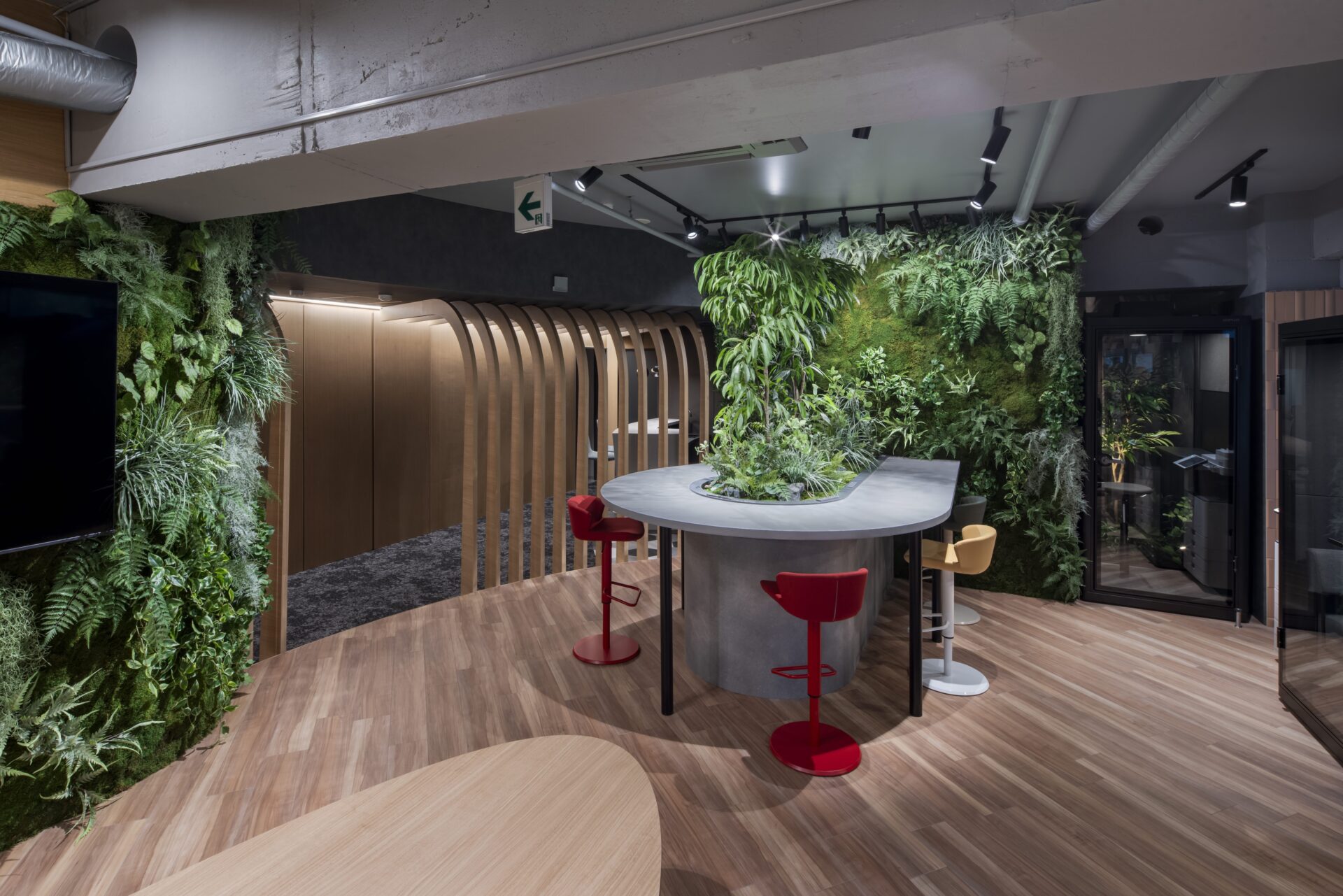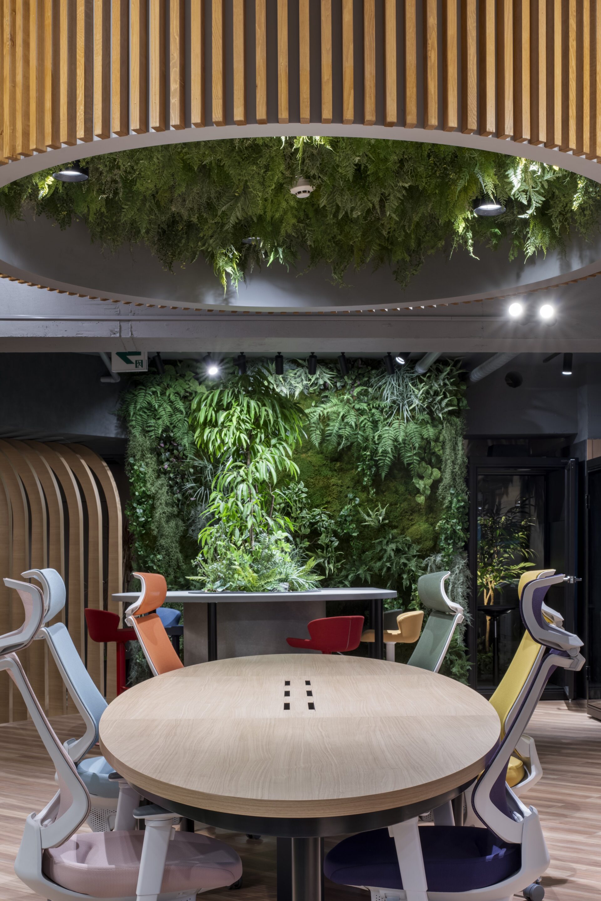 The main floor's entrance features an arch made of 24 panels that pays homage to a large tree. Passing through this arch invites visitors inside. Various greenery is used on the walls, floors, and ceiling, creating a modern space that maintains an exquisite balance with nature.