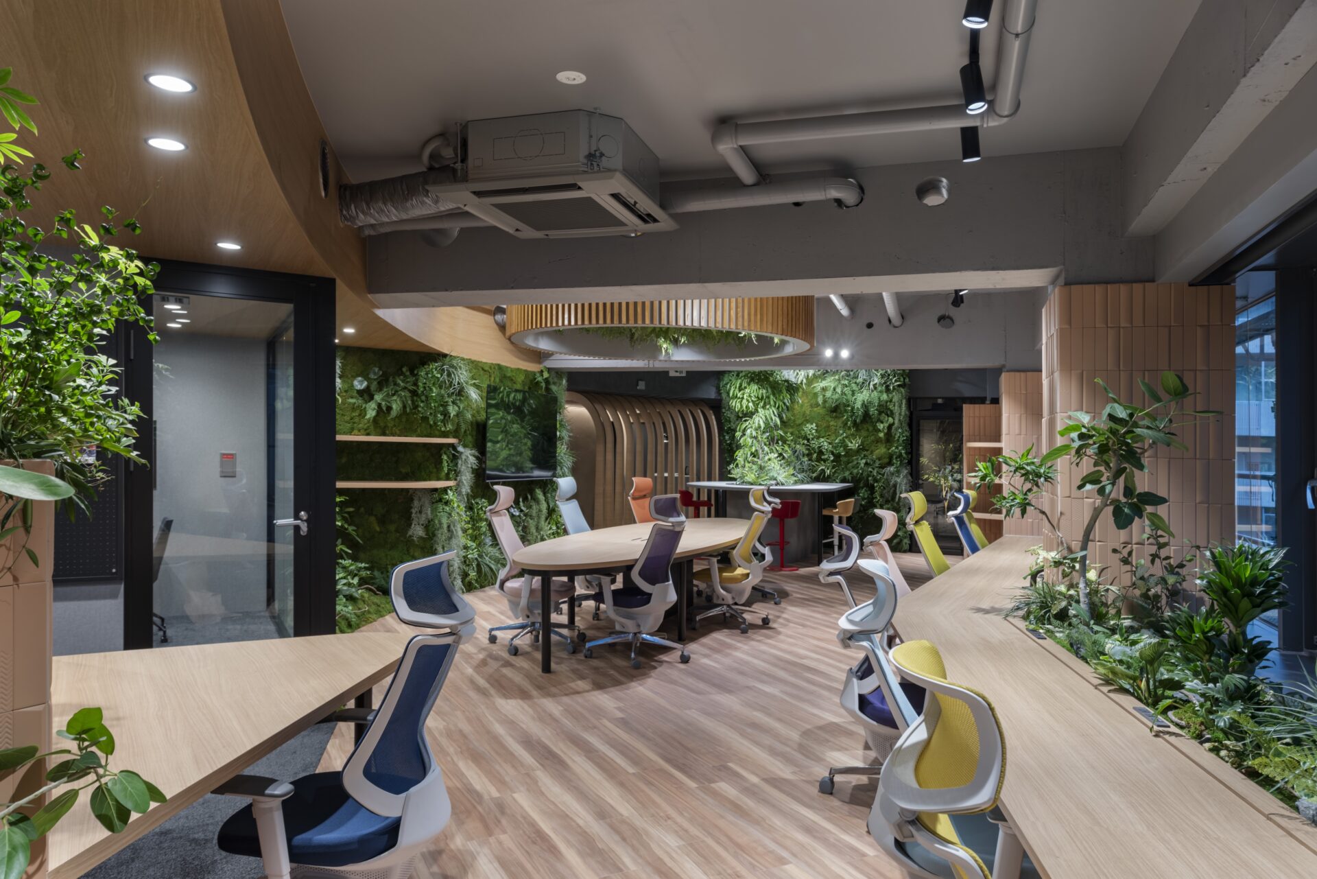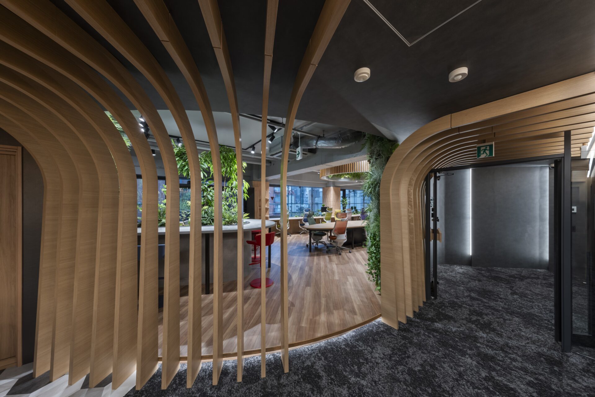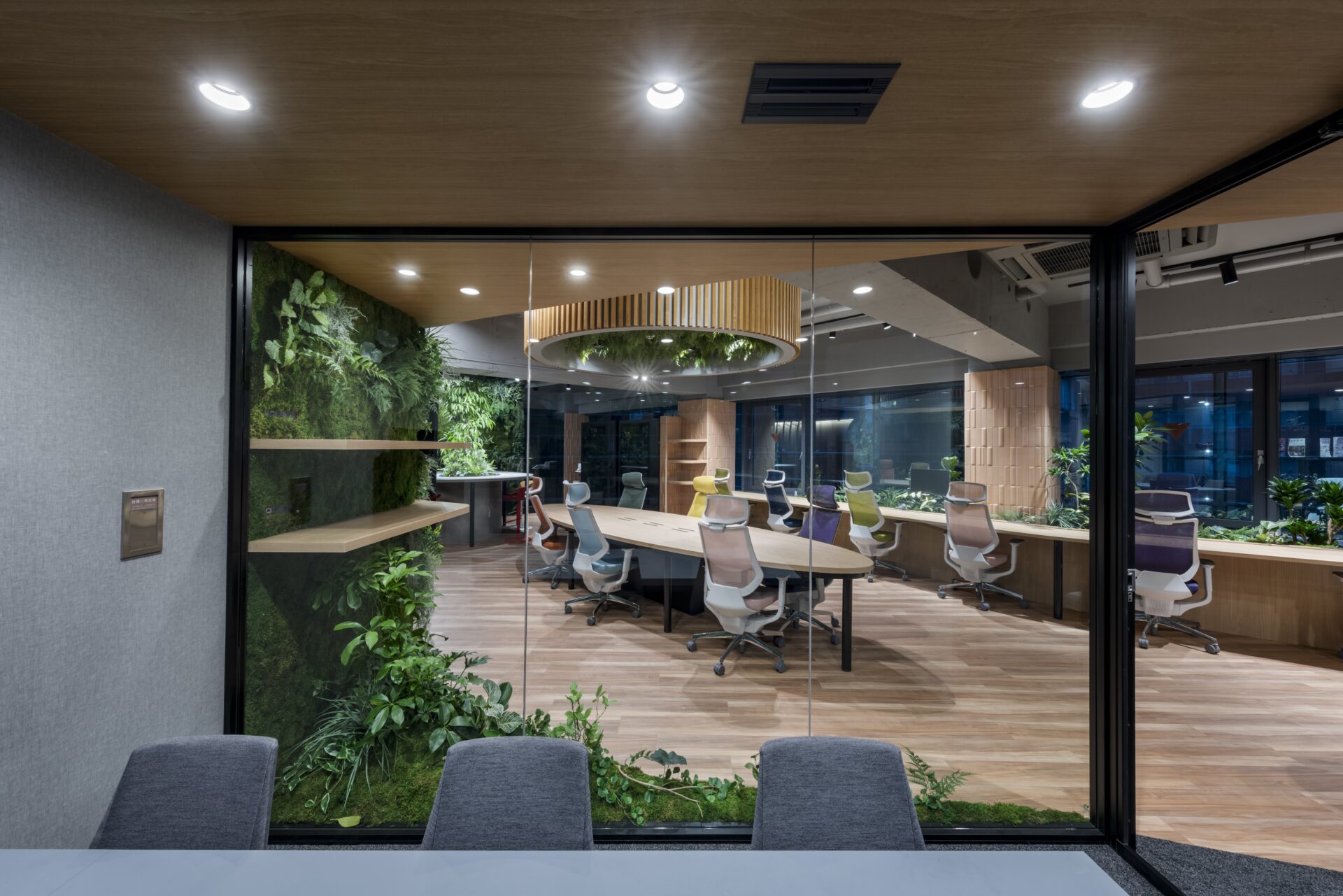 The main floor's entrance features an arch made of 24 panels that pays homage to a large tree. Passing through this arch invites visitors inside. Various greenery is used on the walls, floors, and ceiling, creating a modern space that maintains an exquisite balance with nature.