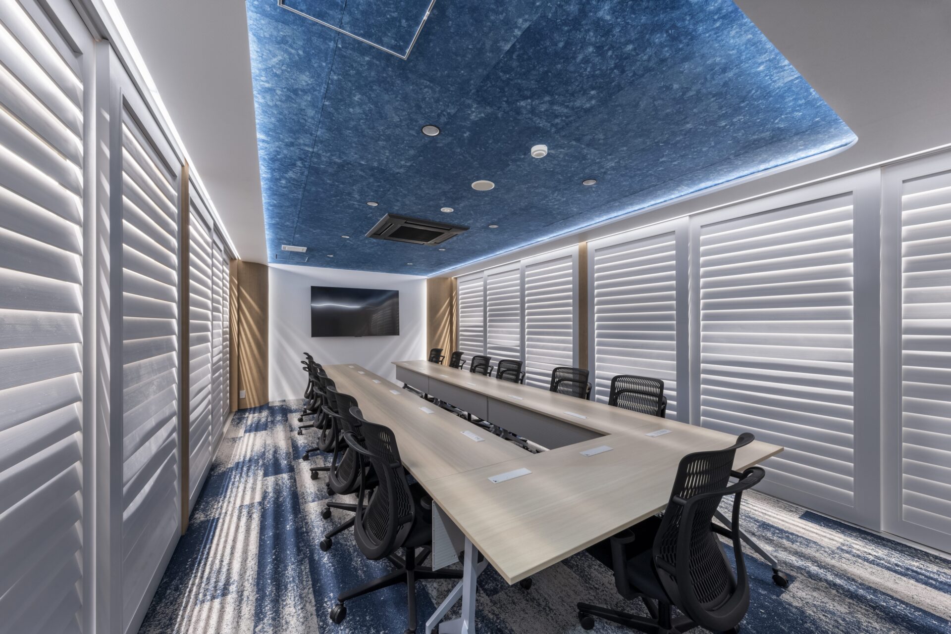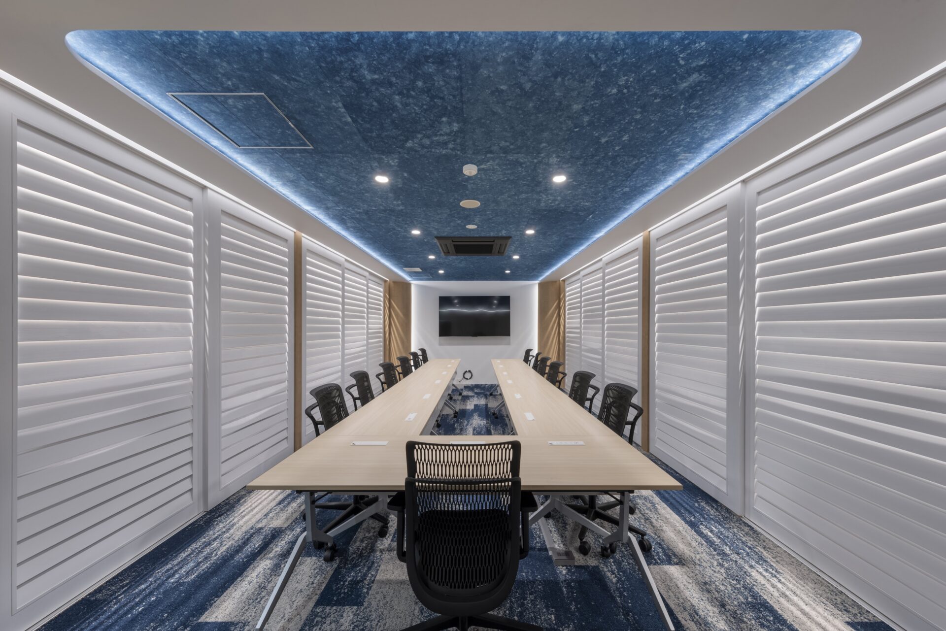 The sub-floor, inspired by a cruise ship sailing the open ocean, is a conference room with a blue and white color scheme that contrasts with the main floor. Louvered panels are installed on the floor, with indirect lighting behind them creating the impression of light filtering in through the gaps between the wings.
