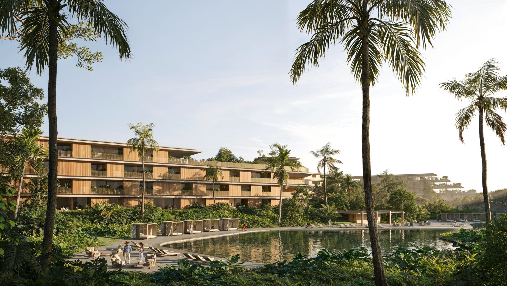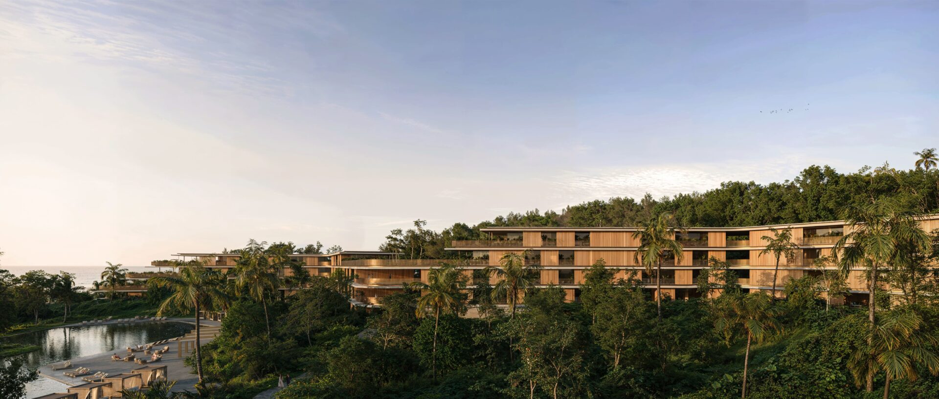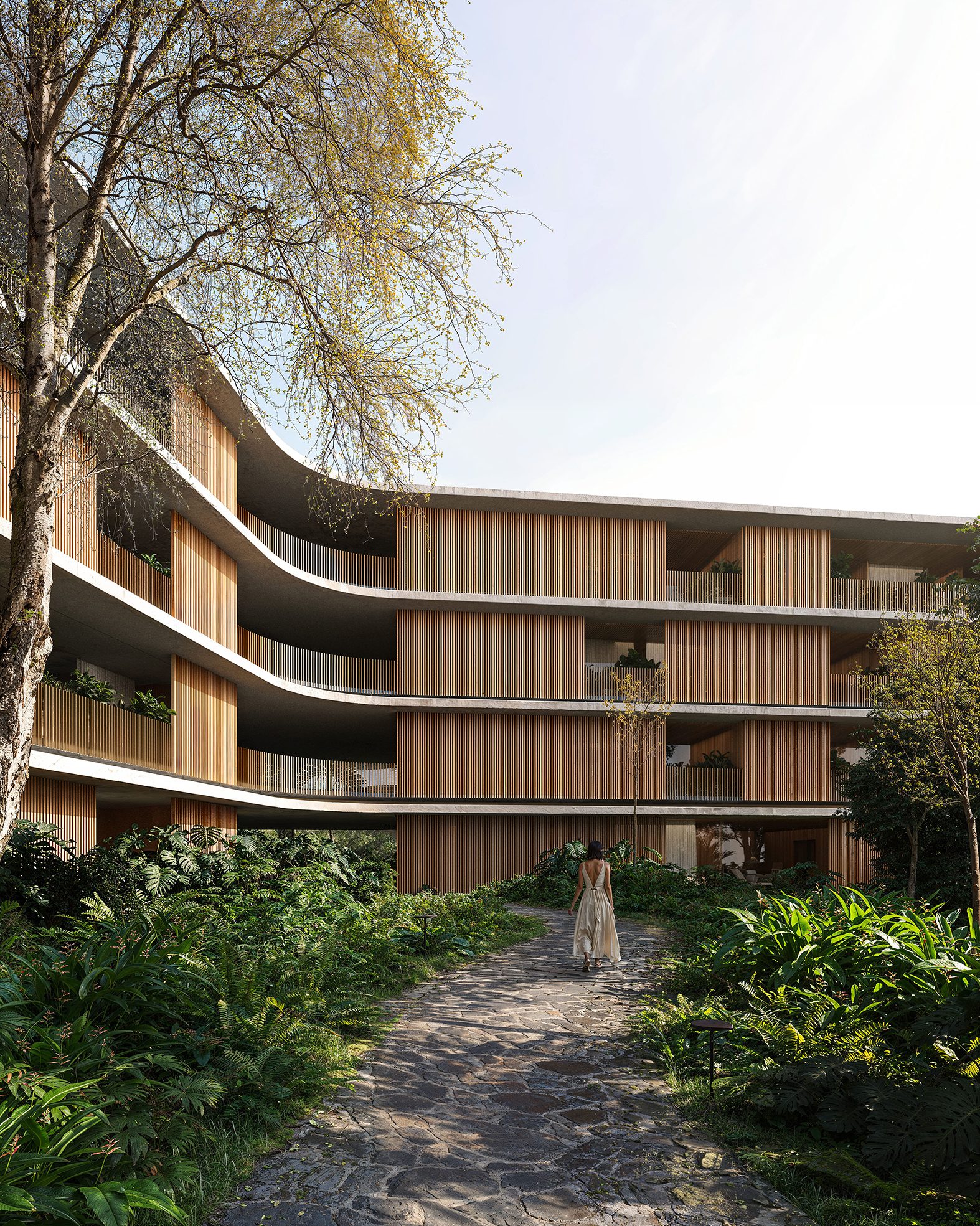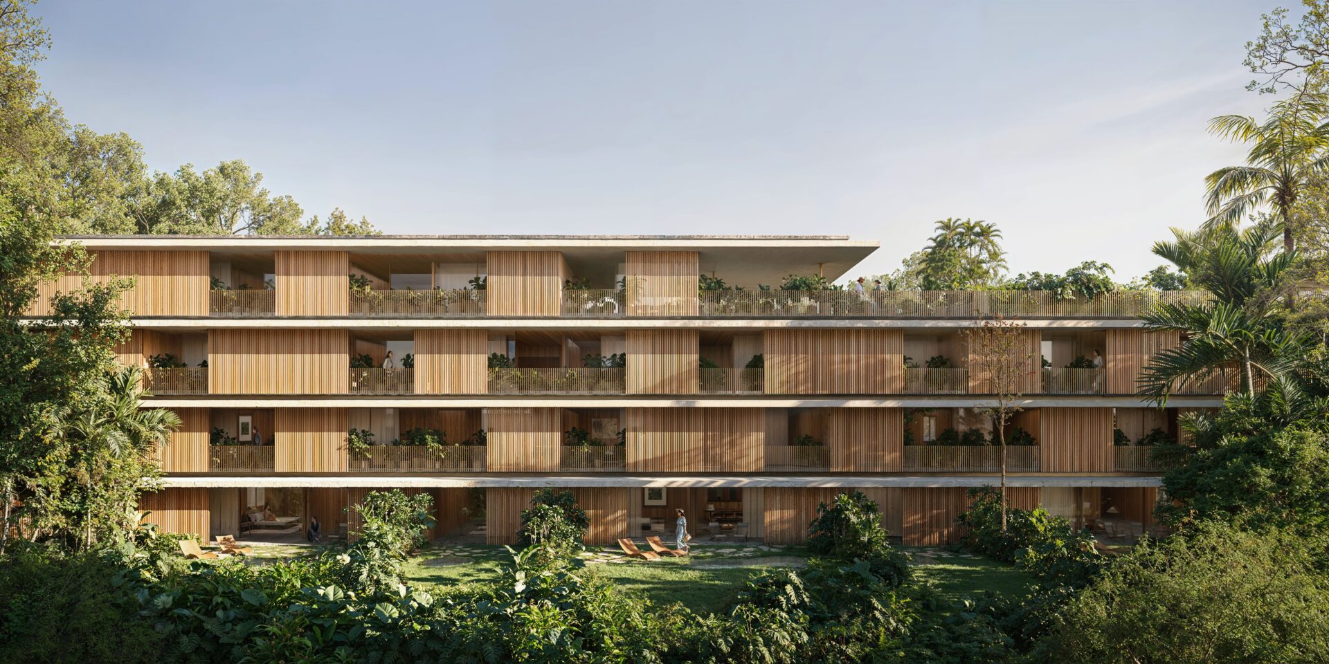 Ascending the hillside, a collection of twelve four-story dwellings reinterprets tropical living. Light concrete slabs define open-air apartments that dissolve the boundaries between inside and out, offering an ever-changing experience of the surrounding nature.