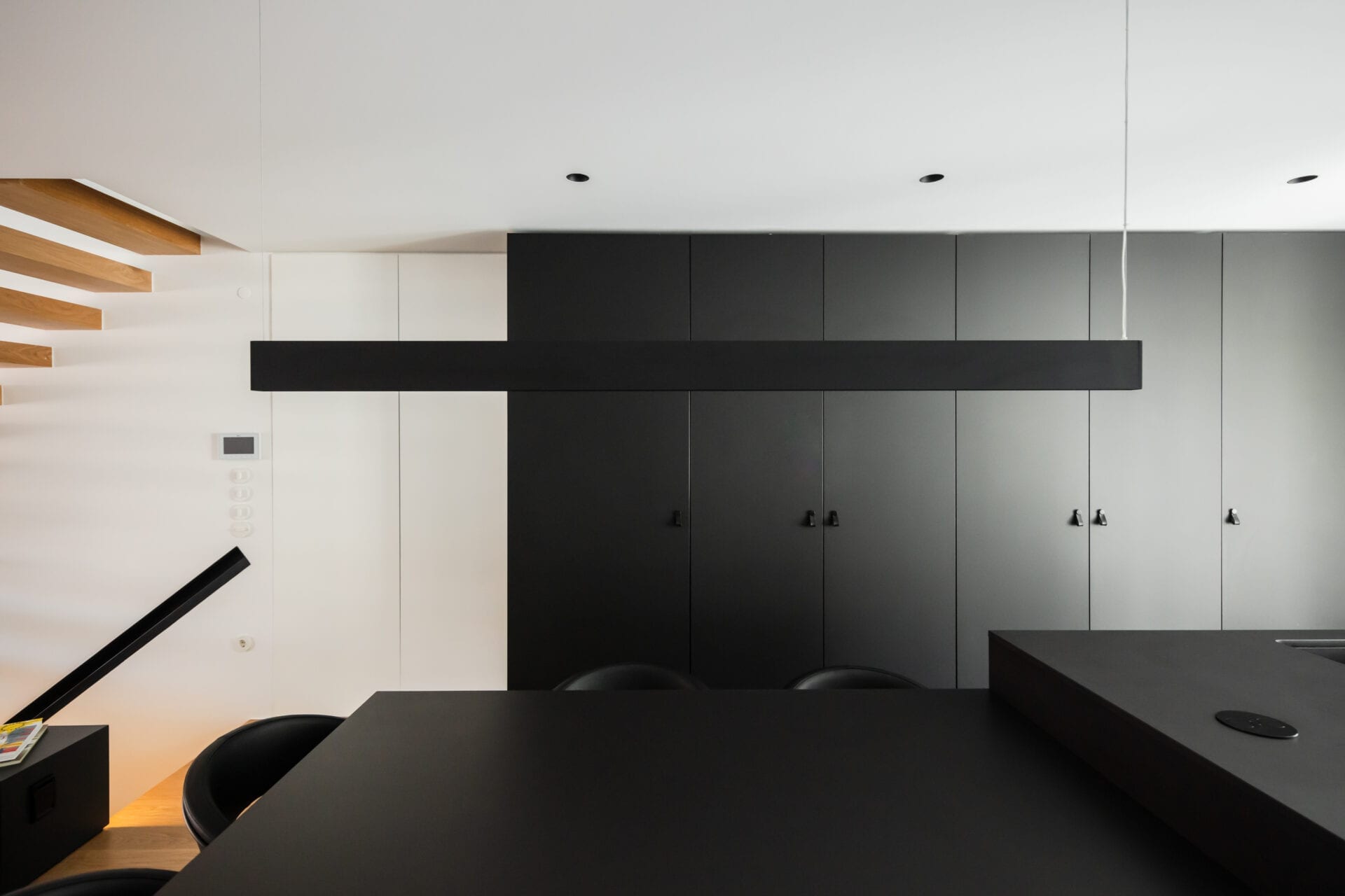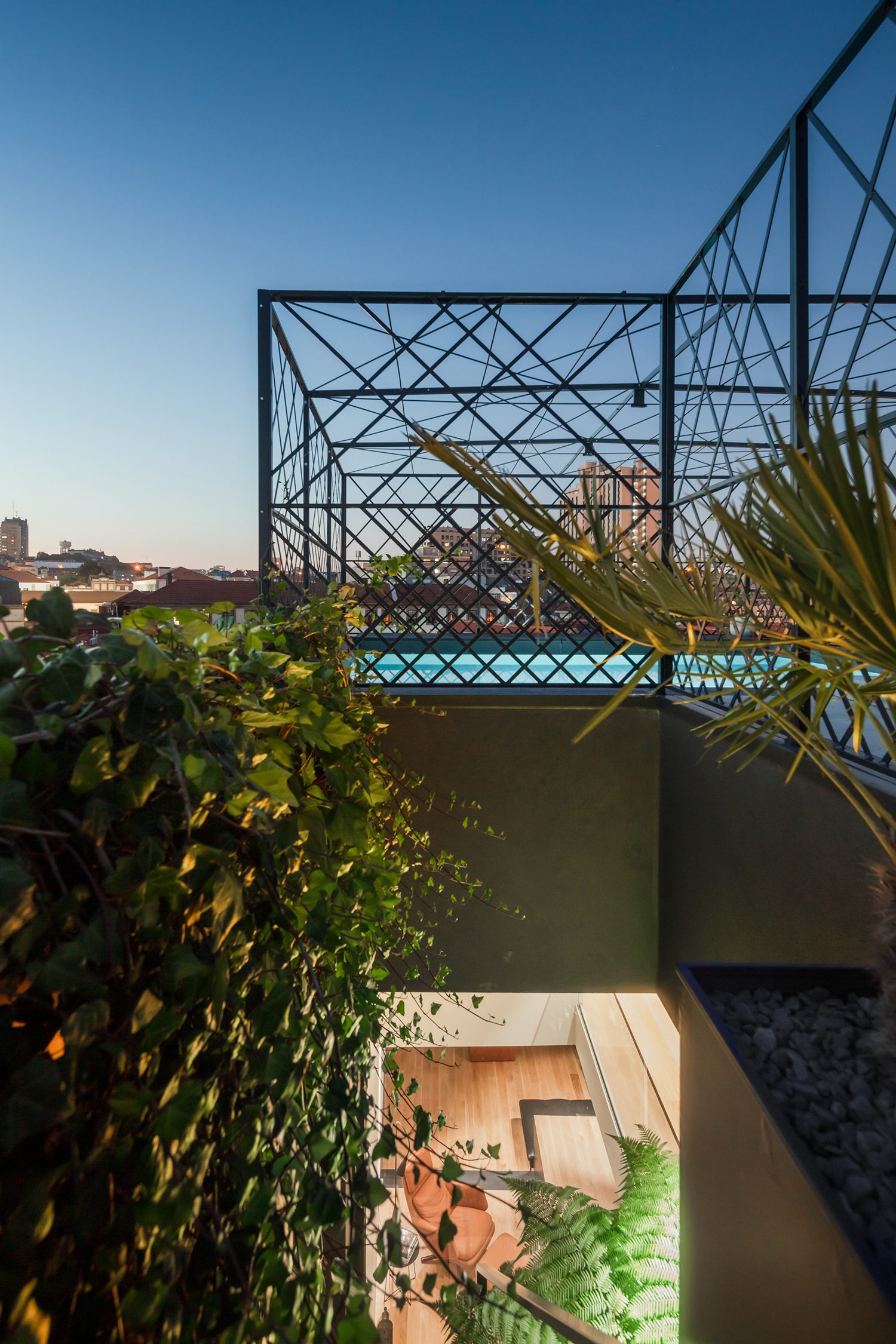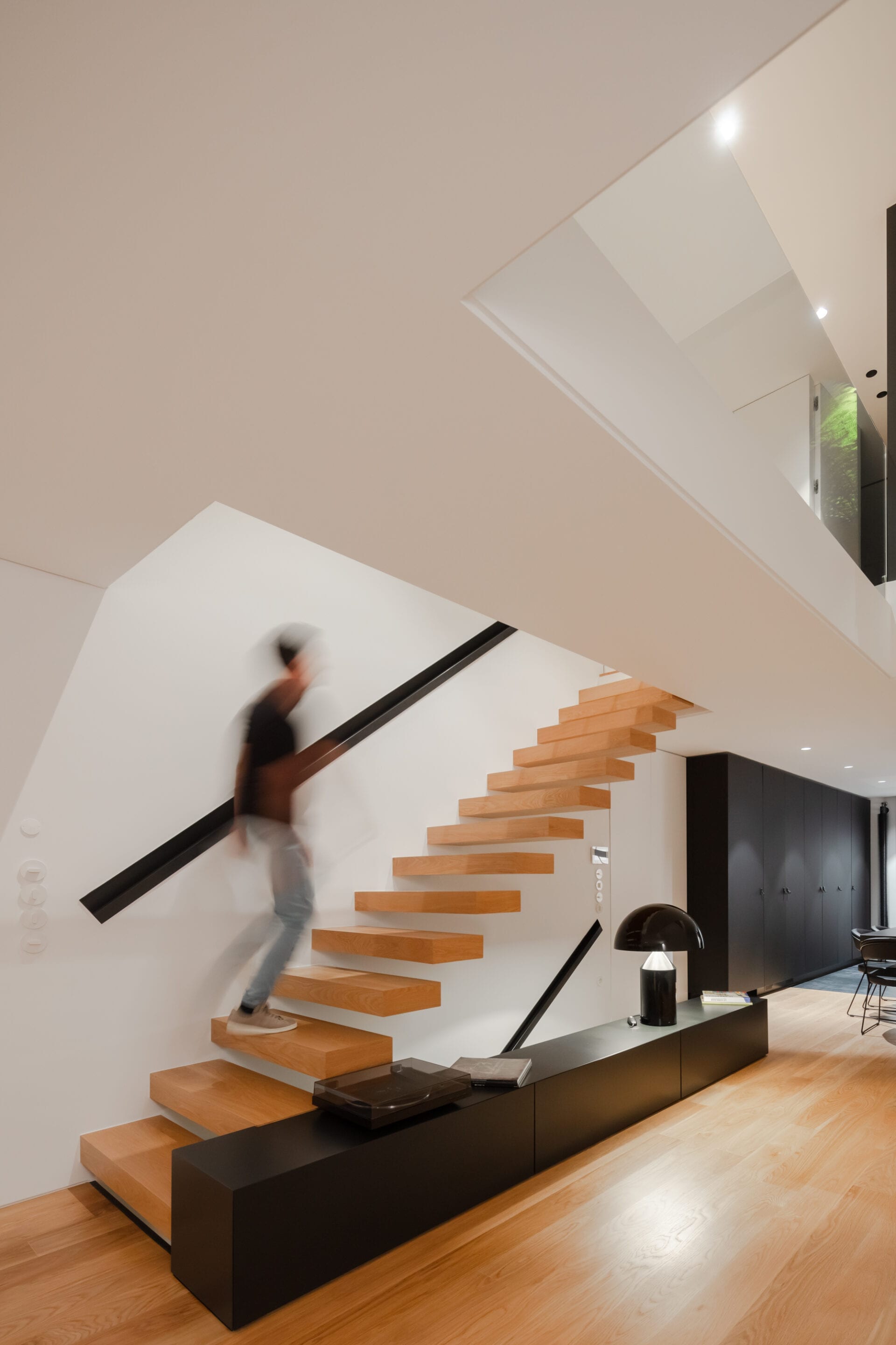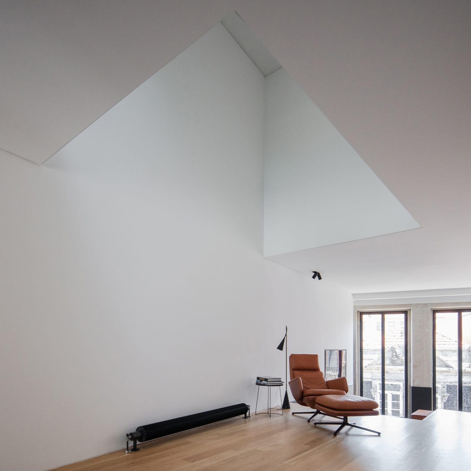 The Fernandes Tomás Apartment had origin in an unusual pre-existing building, part of the old and traditional Porto urban mesh, that was target of an urban rehabilitation exercise, which sought to explore a new spatial contemporaneity, providing strong sensations to the user. A building of longitudinal volumetry, with openings over the street and over the adjoining private exterior patios, typical of the city. The program arises from some concisely delineating intentions, such as the creation of a space based in searching for light, of minimalist raw spaces, and outdoor spaces such as a patio and an access to the roof with its swimming pool. Thus, seeking a disruption with the traditionally attributed conception to what a city apartment is, to create an idea of “villa” in the middle of the urban density. The essence of the project emerges from this outline of concepts, in the search for the creation of distinctive sensations camming from different environments, between light and dark, large volumes, outdoor spaces inside the house. The itinerary starts at the façade facing the street, rehabilitated with contemporary notes, where very distinct composition elements appear. The entrance, highlighted by the access volume in the background and in the foreground by the contemporary railings inspired in traditional design, resulting from an abstraction of Portuguese tiles, in the existing upper floors of the façade the design was simplify through the windows frames composition, and finally, in a recessed volume, the vertical extension of the building.