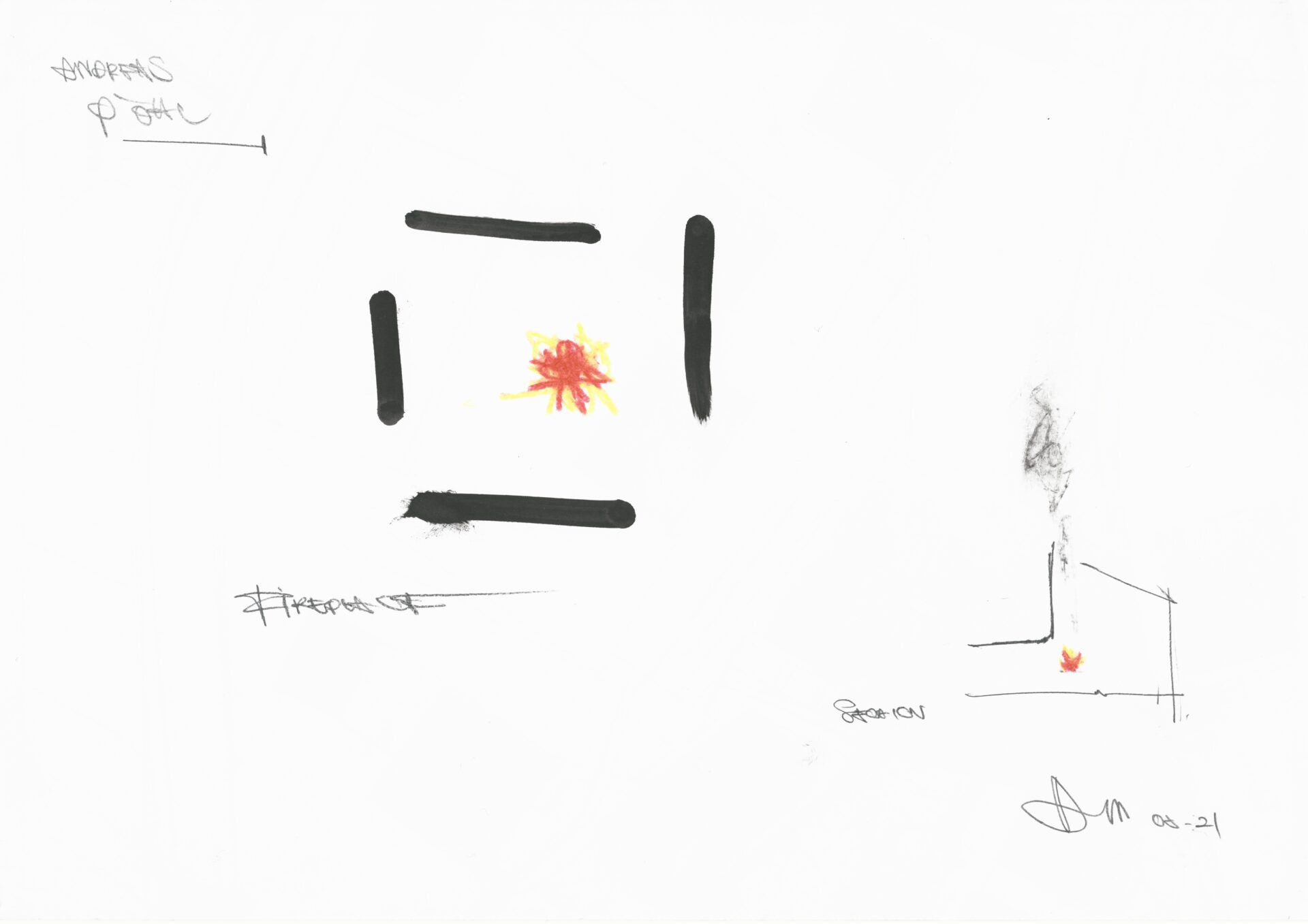 An open hearth – gathering site to mankind since the beginning of time - stands at the center of the showroom, becoming its essential element. Four charred wooden stage walls laid-out orthogonally around the fireplace form the backdrop for the displays of stoves and tiles. In their midst, sits complacently heavy the hearth’s monolith rock – whispering tales of times long past – almost unprocessed, primal and raw. Rising above, the exhaust hood waits patiently its turn only to surrender to the chimney.