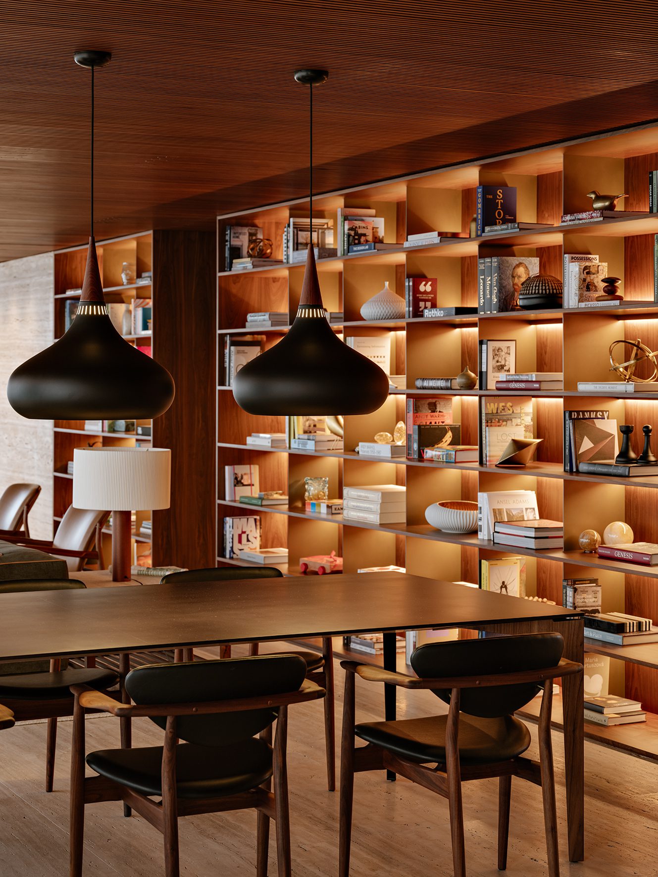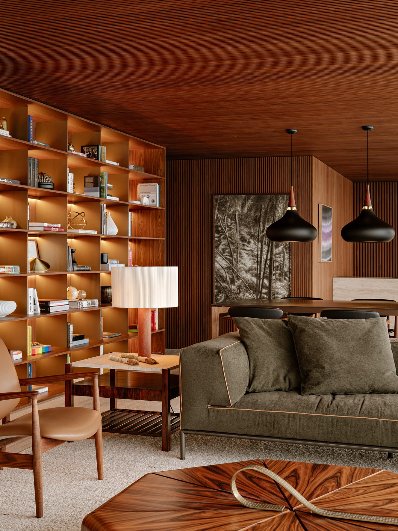 Furniture selection bridges eras, with a harmonious mix of Brazilian modernism and international design. Iconic pieces like the *Pétala* coffee table by Jorge Zalszupin converse with contemporary works by Jader Almeida, while classic armchairs by Gio Ponti and Finn Juhl introduce a refined global sensibility.