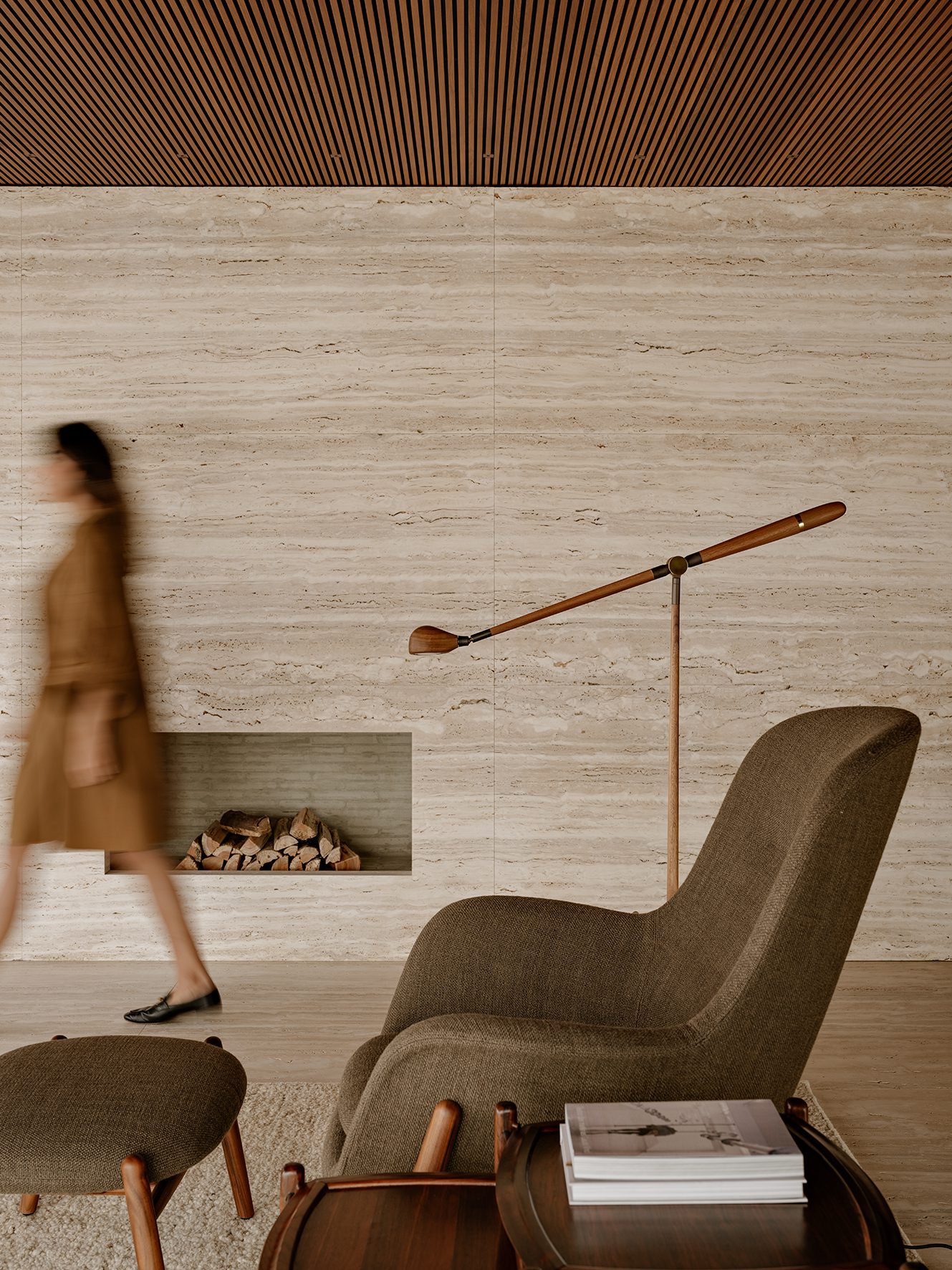 The open social area is articulated through subtle zoning: two neutral-toned rugs delineate three distinct settings; an intimate fireplace nook, a central living space, and the dining room. Each zone is furnished with carefully selected sofas, armchairs, side and coffee tables, and floor lamps, creating a layered dialogue of scale, texture, and height.
