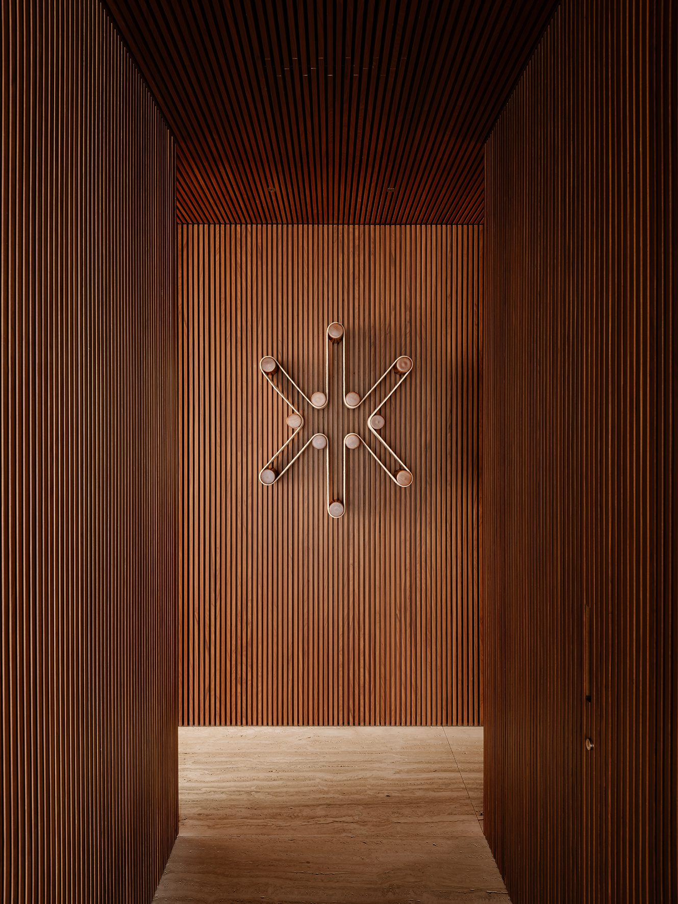 Art anchors the space. Two sculptures by Artur Lescher punctuate the layout; one, suspended near the glass panels, explores tension and lightness; the other, a fluid form, complements the rhythm of wooden slats in the corridor. A kinetic artwork by Abraham Palatnik adds color and motion beside the kitchen, turning a transitional wall into a vibrant focal point.