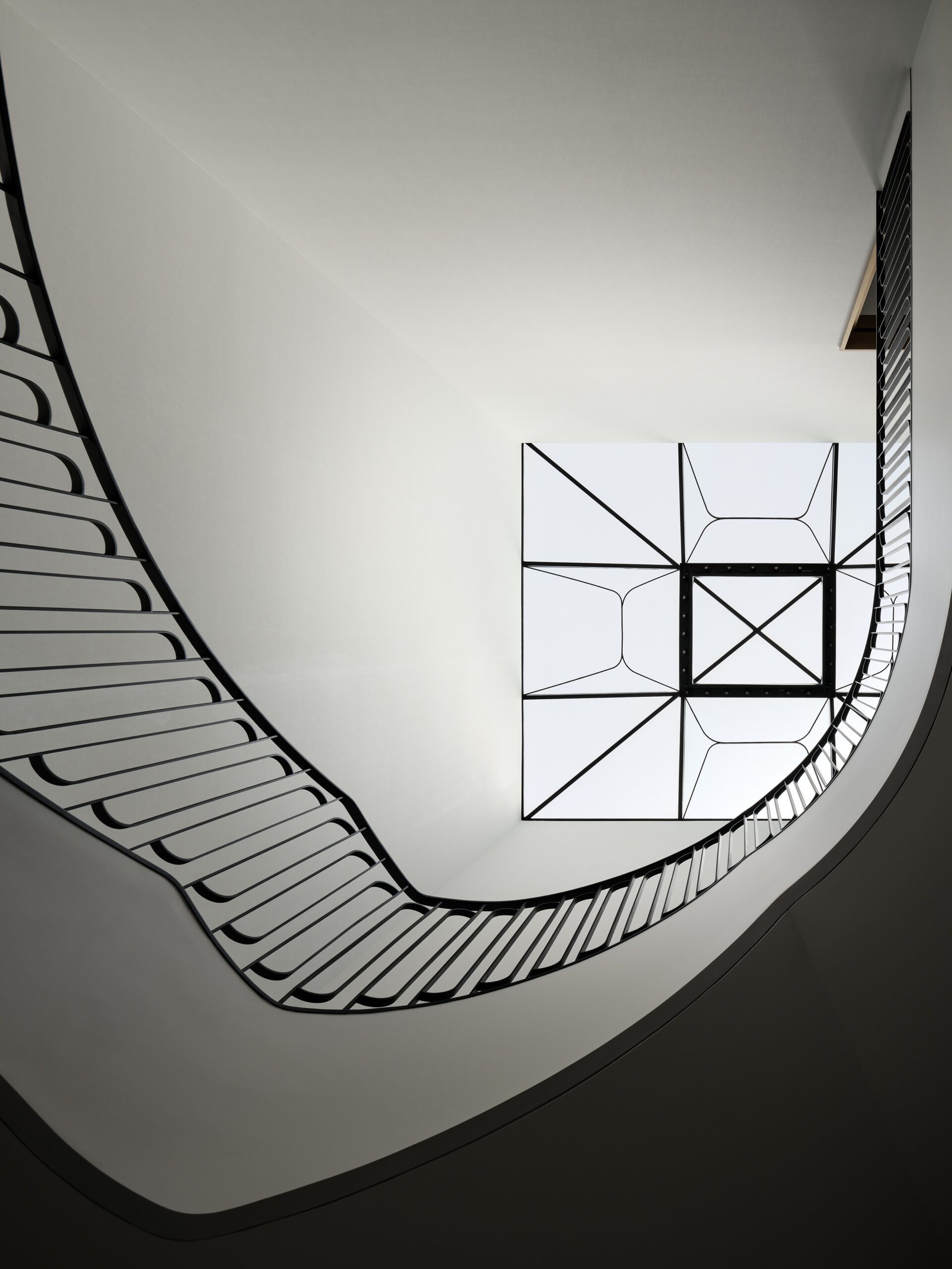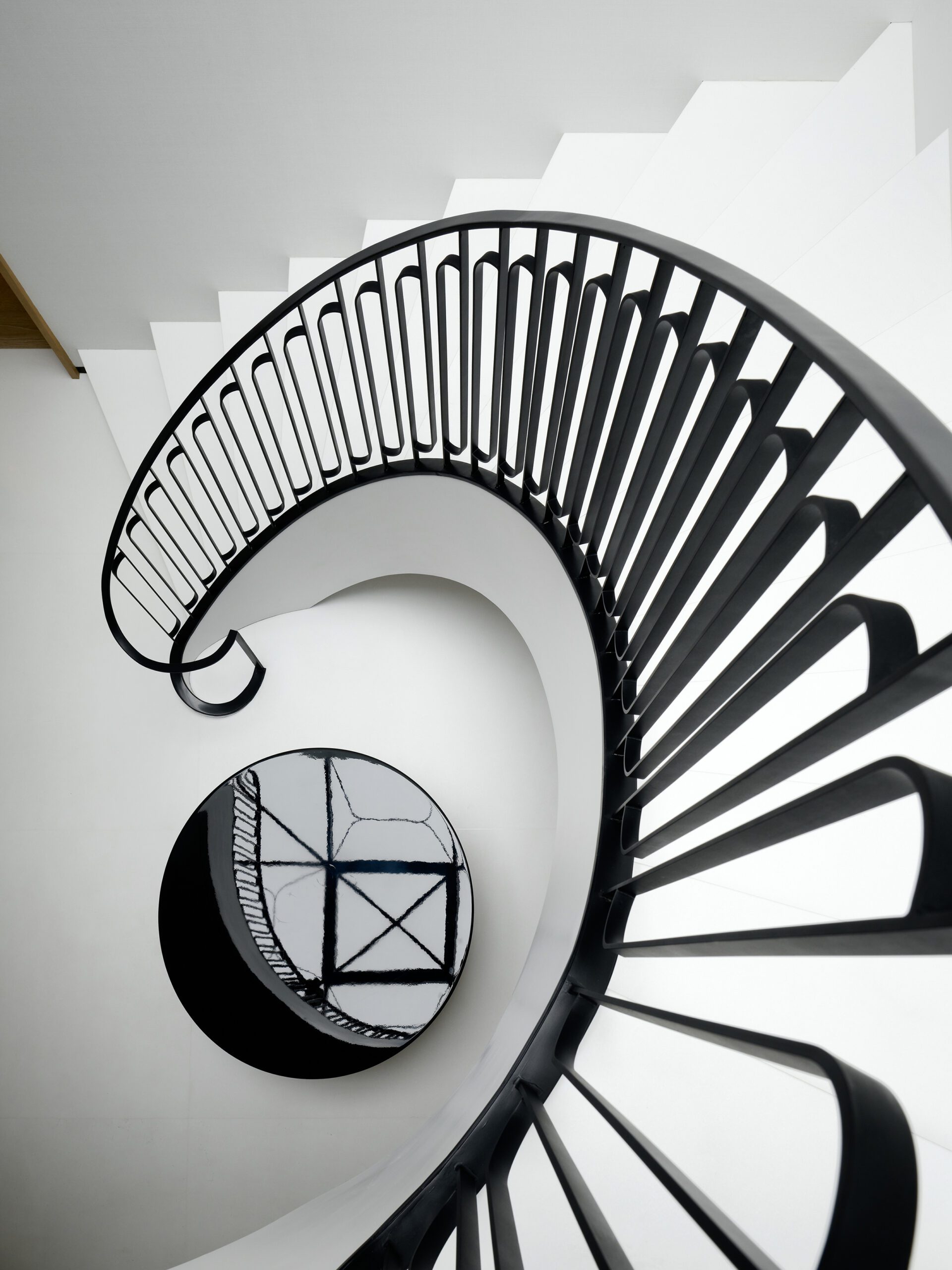 At the house’s core is a Thassos marble spiral staircase bathed in natural light from a pitched skylight and featuring a designed blackened steel railing, which draws the eye to the second-floor landing to a three-dimensional artwork by Dennis Lin.