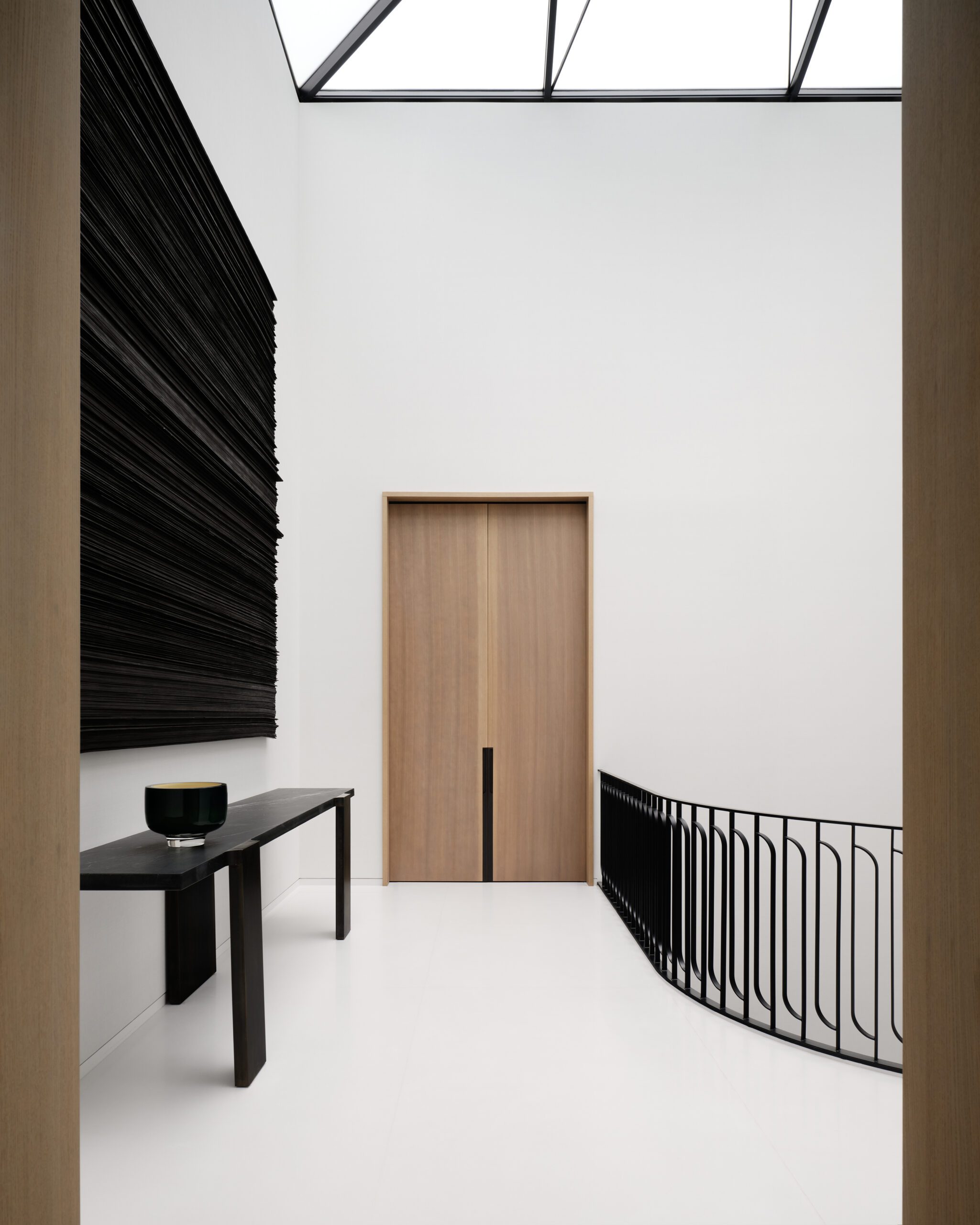 The risk on this occasion was to allow the designers to be as reductive as possible by removing such standard fixed elements as baseboards, moldings, wall scones, and door handles. Various living spaces throughout the main level are divided not by doors but by ample thresholds that reach the ceiling. Clean, seemingly naked walls read more as stretched canvases designed to catch changes in light throughout the day.