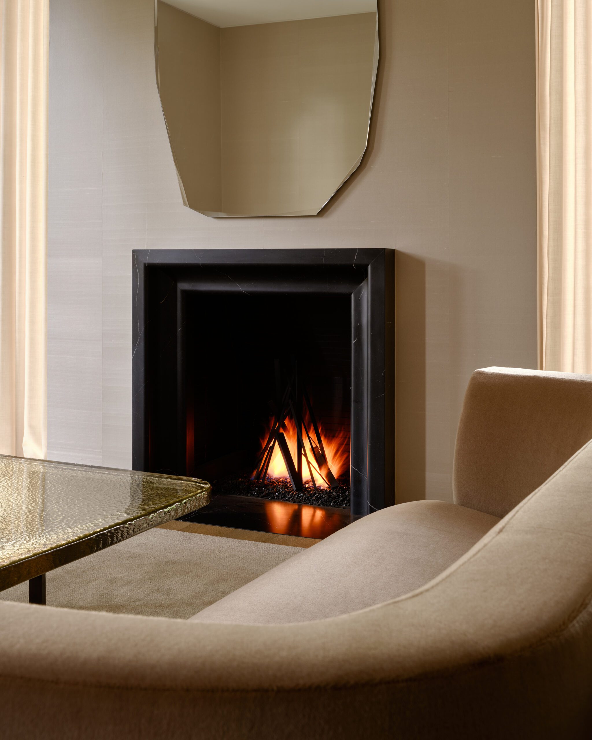 This pared-back approach could be described as creating an “interior skin” for each room. When surface changes do occur, they are expressed in a new and subtle way. For example, the two-inch gap at the base of the wall is treated as though a piece of built-in furniture by cladding it in bronze.