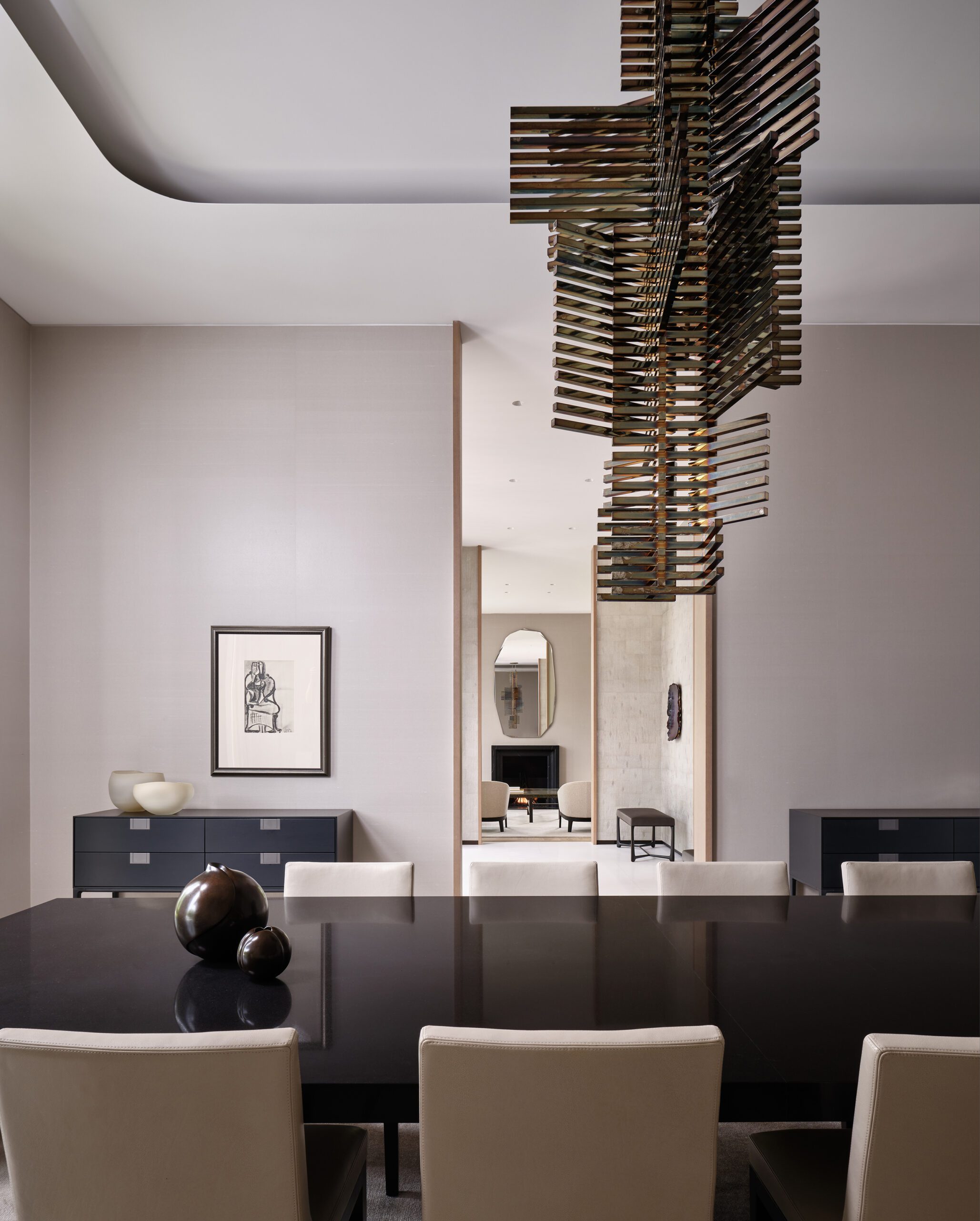 Other furnishings are carefully curated to create unencumbered focal points. In the formal dining room, the custom table’s reflective surface, plays off a stunning silver chandelier designed by Milan architect Vincent De Cotiis.