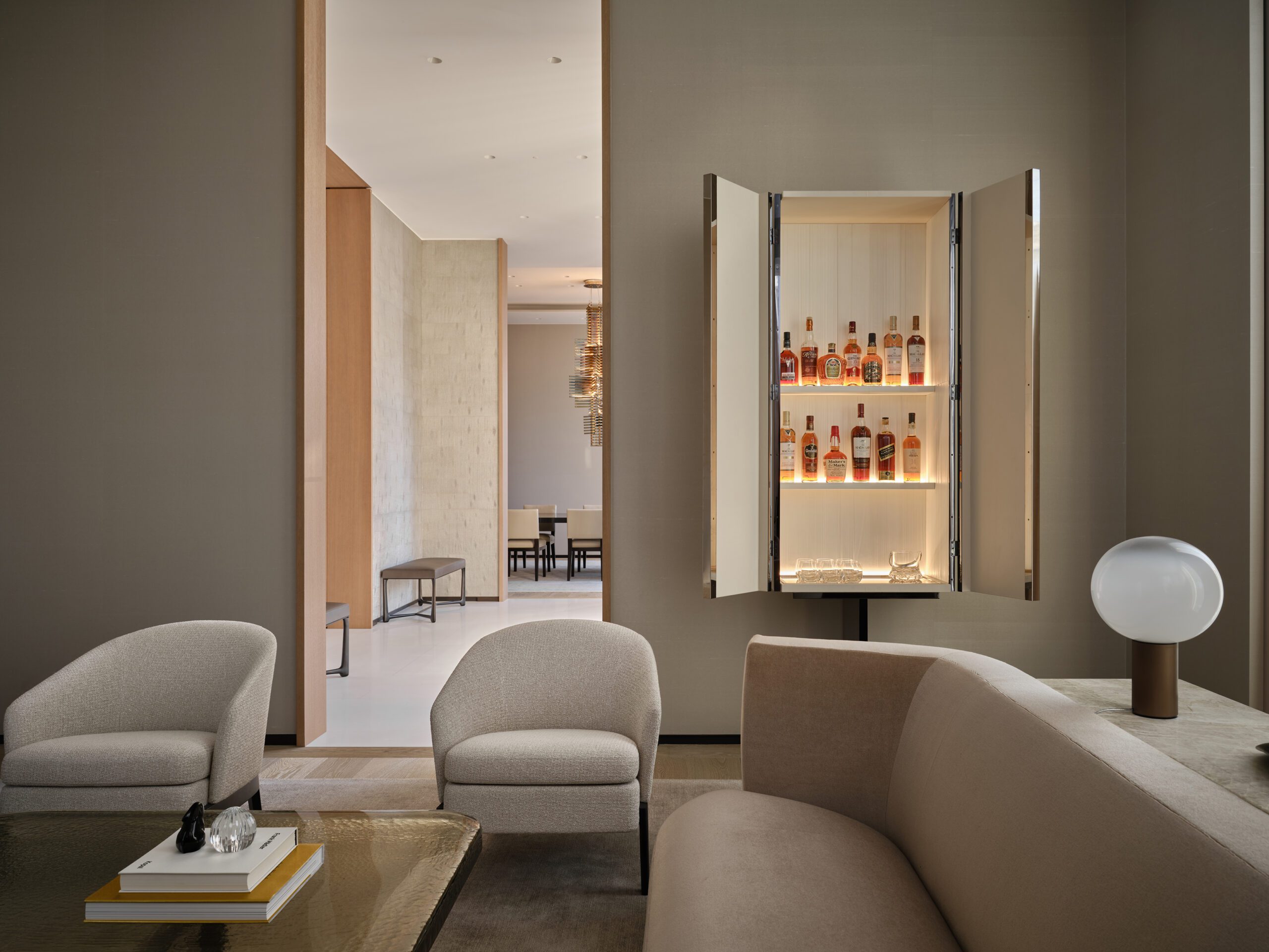 Furnishings throughout the house, a mix of curated pieces and custom designs, add a final layer of atmospheric continuity and comfort. The overall effect of the entire house is dry, luxurious, and embracing of a sense of warmth and calm serenity.