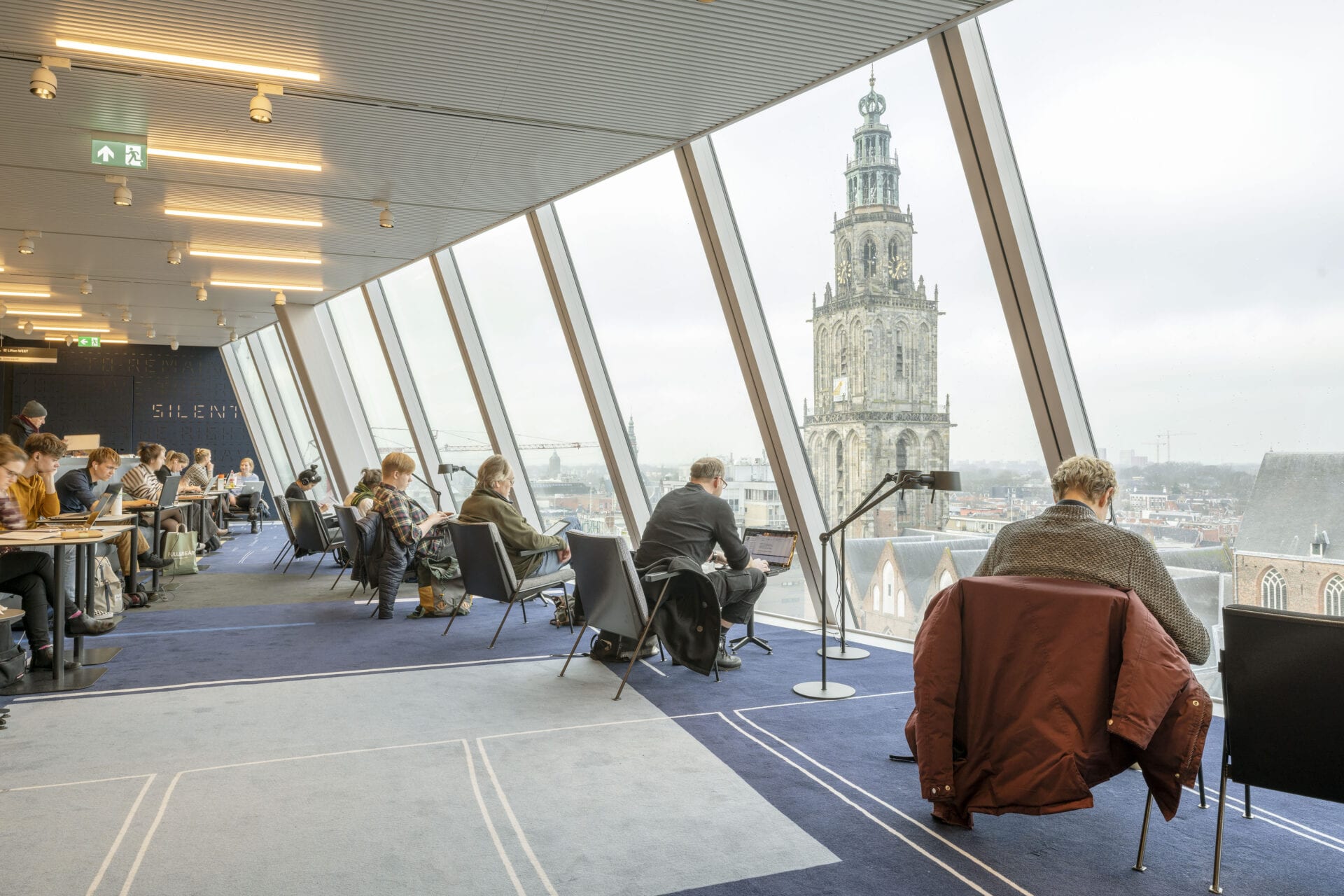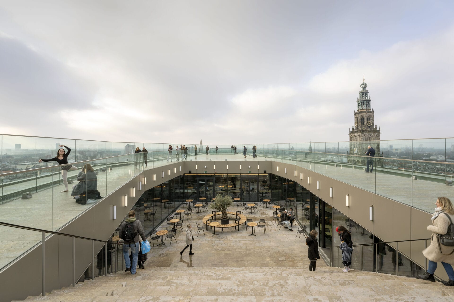 Forum Groningen is a new multifunctional building in the center of Groningen, a cultural ‘department store’ filled with books and images, that offers exhibition spaces, movie halls, assembly rooms, restaurants. The Forum has become a platform for interaction and debate, a ‘living room’ for the city. Forum Groningen is NOT a library, NOT a museum, NOT a cinema, but a new type of public space where the traditional borders between these institutes is dissolving. Information is be presented thematically in a way that transcends the different media. Forum Groningen features an exceptional central space, an innovative atrium that with its horizontal ‘tentacles’ forms the pumping heart of the venue. The void works as a spatial interface that binds all functions, and as such catalyzes the exchange of knowledge and ideas. A series of stacked ‘squares’ emerges that can be experienced as the continuation of the network of open spaces in the city of Groningen. The specific layout offers changing perspectives on the surrounding city and culminates in the roof terrace, a viewing platform and outdoor theater. Forum Groningen has been engineered “to accommodate finding not searching”.