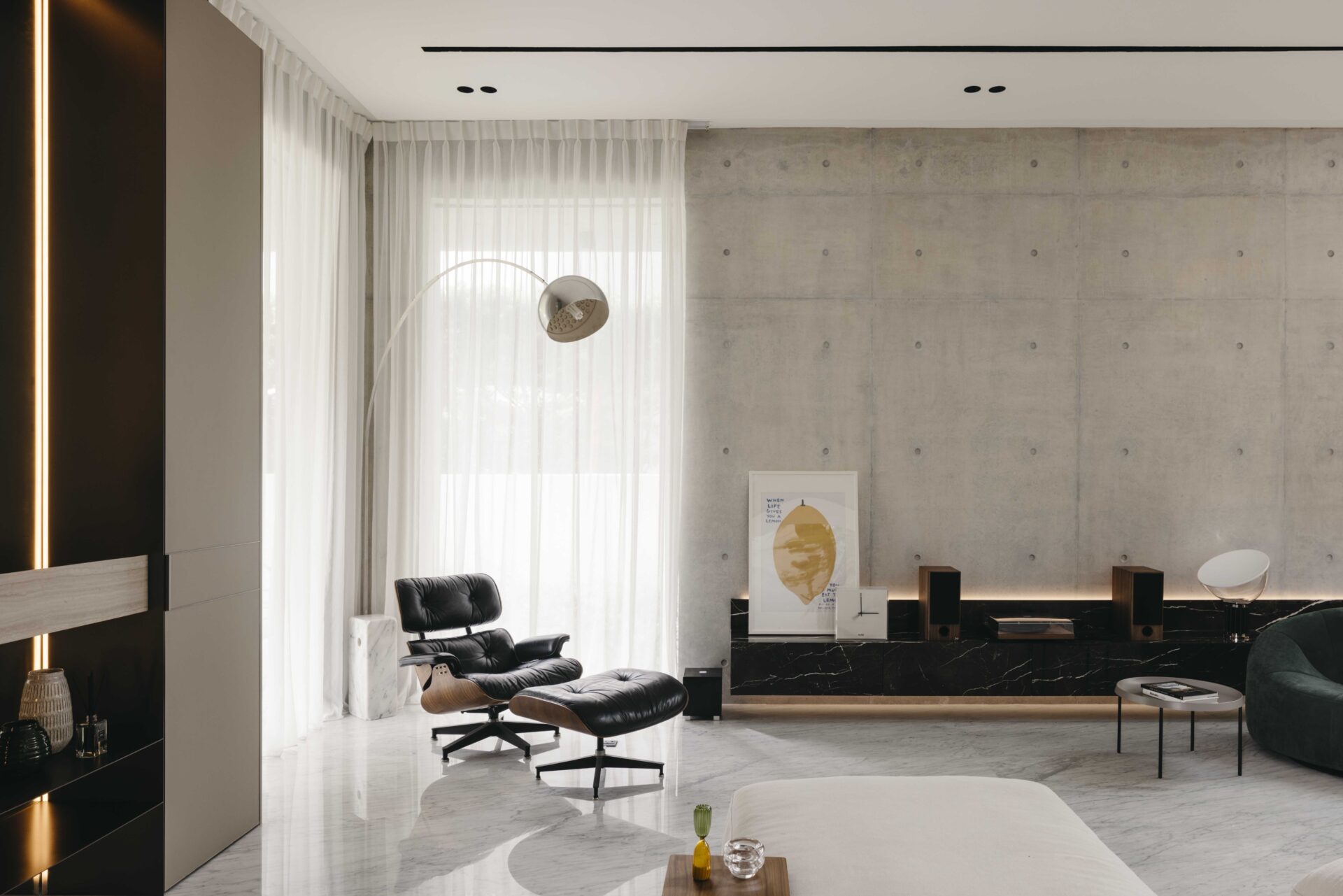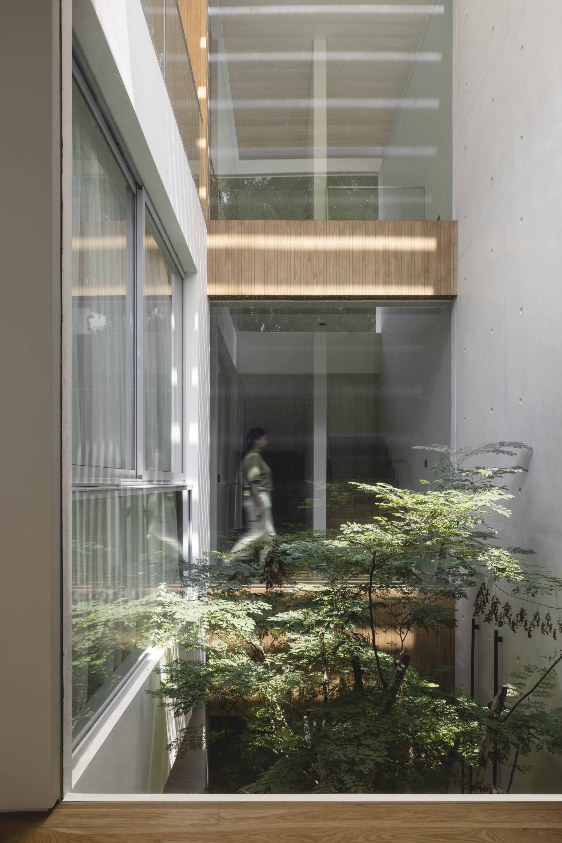 The layout is orientated around an internal open courtyard, upon which the living and circulation spaces are centered on. In this way, the house acts as a buffer and shields the occupants from the main street, creating an inner oasis with views of lush landscaping and water to calm the senses of the occupants. Designed to rely fully on natural lighting in the day, The courtyard draws in daylight, breeze and ventilation deep within the house, and incorporates nature into the living environment, focused on a single Caesalpinia tree. During the day, the breeze rippling through the tree branches creates shifting shadows on the courtyard walls.