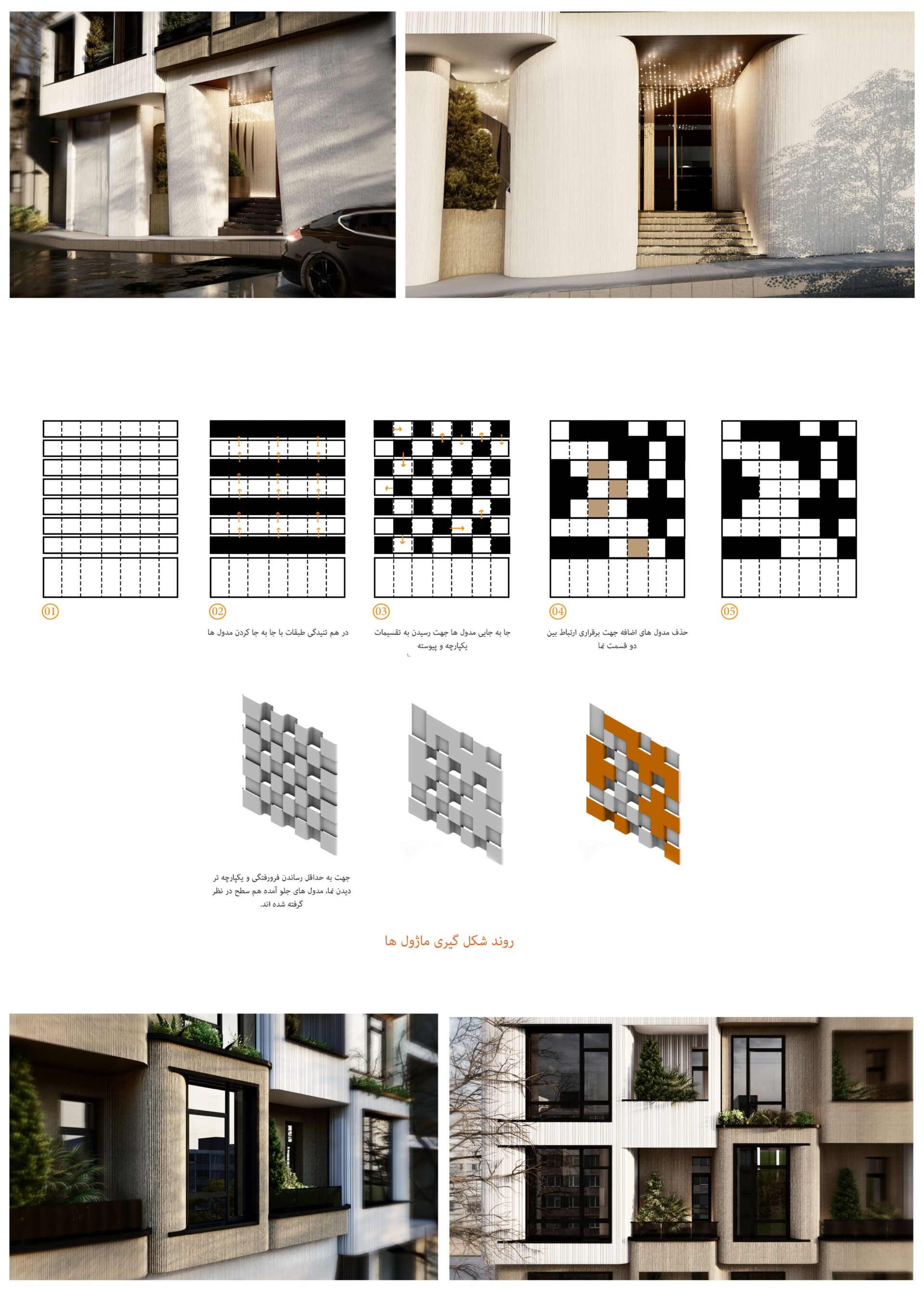 The Qeytariyeh project has been built on 7 floors of 6 units in the northern part of Tehran. In this project, the scenario that is intended for the access of the units is such that each unit has separate access and the privacy of each family is preserved. Also the crowds and noise of other units do not disturb the other units. Also, public spaces such as lobby, conference hall, meeting hall, cinema, cafe and gym are designed to improve and enhance the quality of life in a residential apartment where everyday life is evident. In the process of façade design, because the structure of the building was built, we faced limitations such as the existence of shear walls in the facade. Despite all the challenges, an attempt has been made to present a design that is most in harmony with its context and using the least materials. By multiplying a single module throughout the surface, we arrive at a regular structure and network that is at the same time rhythmic and balanced. This rhythm and balance is considered by seeing the material of the modules differently By releasing a single module throughout the surface, we achieve a regular structure and grid that is rhythmic and balanced at the same time. This rhythm and balance is considered by seeing the material of the modules differently.