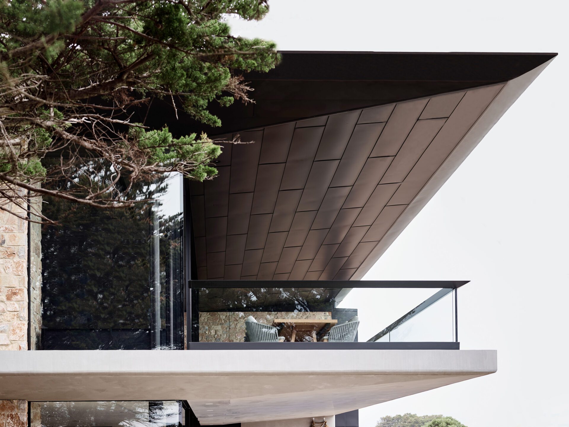With the nearby lighthouse such a prominent public attraction, low-reflective zinc was used as cladding to reduce glare, and to protect from coastal corrosion. Northern outdoor living areas are shaded from the floating roof and protected from the strong sea winds. Coastal plants and canopy trees surround the house for privacy.