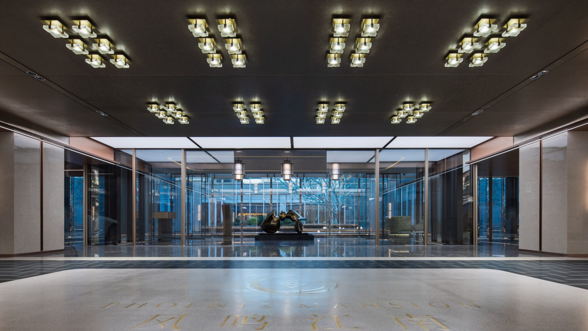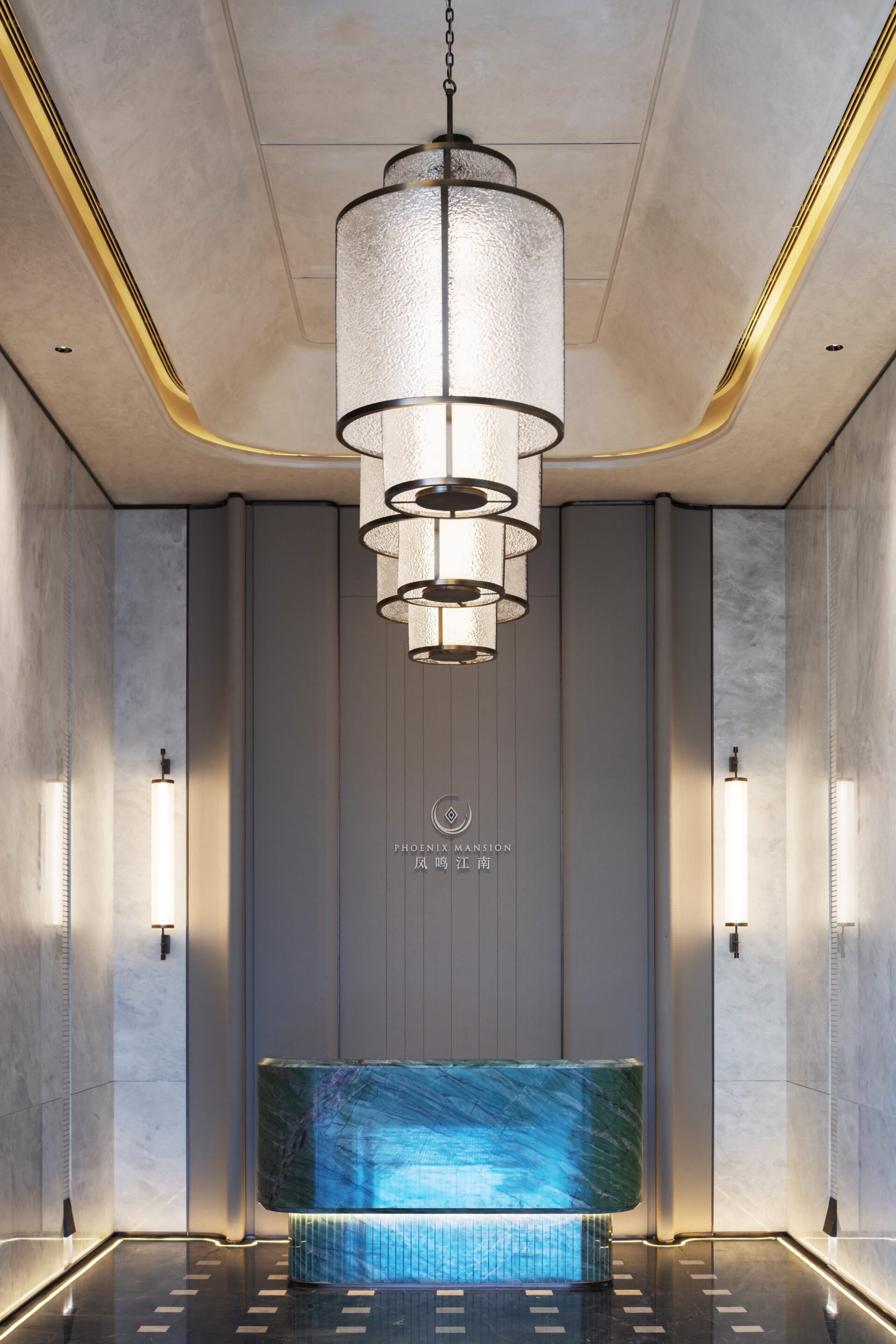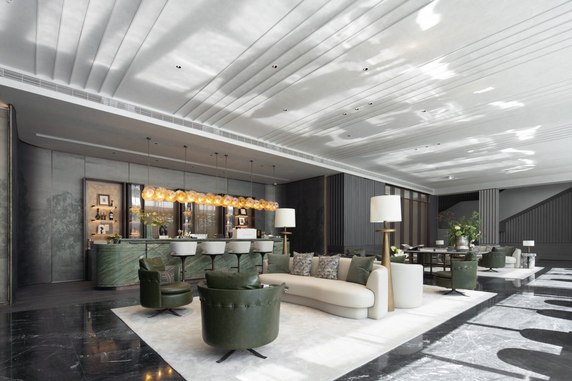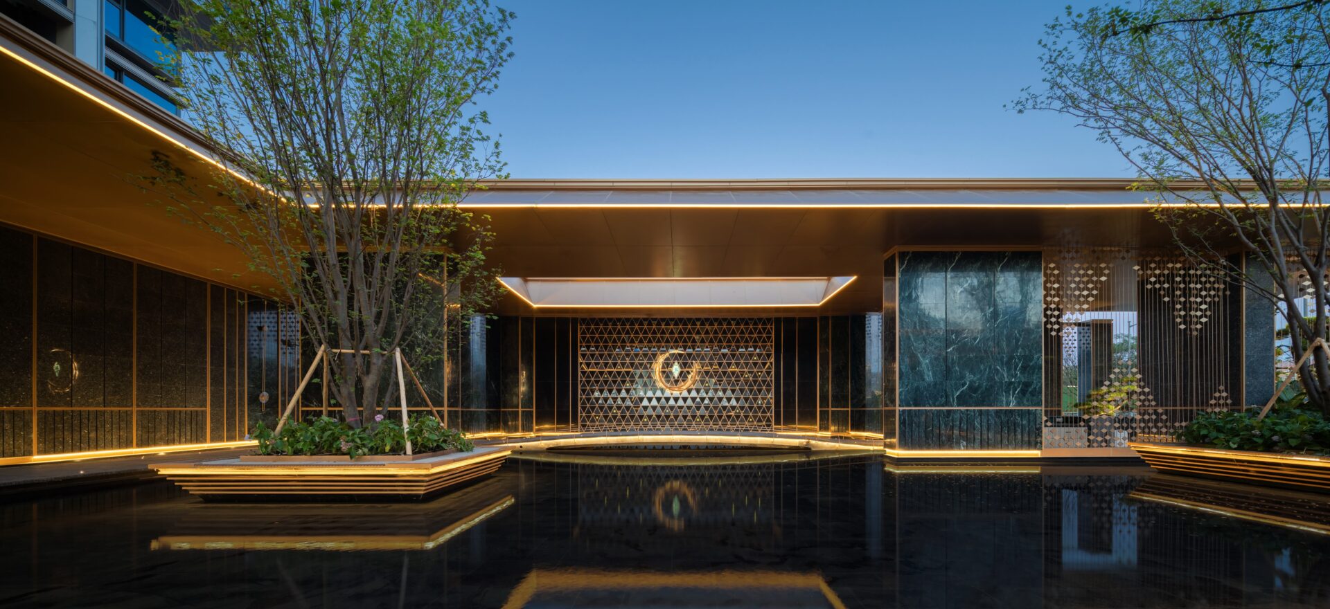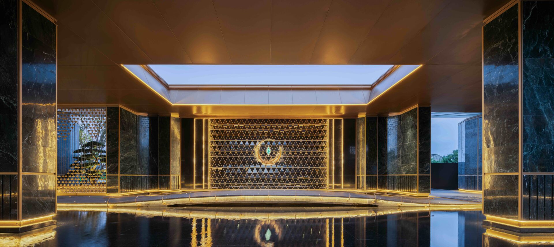 The space design extracts phoenix feather elements in details, incorporates emerald colors, uses stone and metal finishes to translate culture, and integrates the noble temperament of the flying phoenix into the venue. The indoor and outdoor spaces are separated by a glass curtain wall, which increases the dynamics and transparency of the space and extends the indoor space.