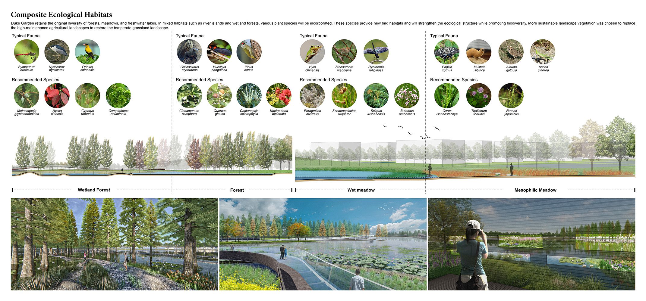 Duke Garden retains the original diversity of forests, meadows, and freshwater lakes. In mixed habitats such as river islands and wetland forests, a variety of plant species including Metasequoia glyptostroboides, Camptotheca acuminata, and Cyperus rotundus will be incorporated. These species provide new habitats for birds like Nycticorax nycticorax, Oriolus chinensis, and Alcedo atthis, and will strengthen the ecological structure while promoting biodiversity. To restore the temperate grassland landscape, more sustainable landscape vegetation was chosen to replace the high-maintenance agricultural landscapes.