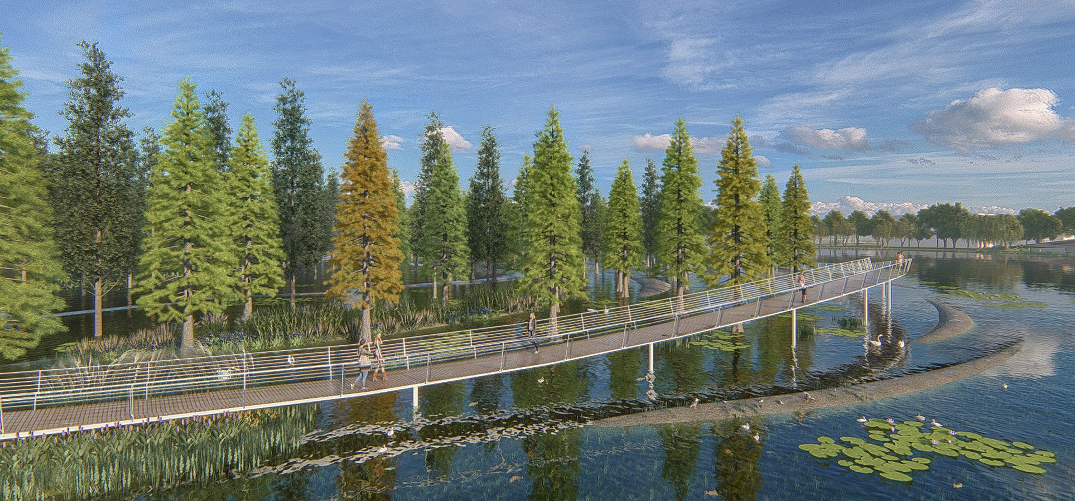 The Water Sleeve Bridge spans across varied landscapes including vertical flow wetlands, urban pastoral fields, and aquatic forests, each with distinct environmental experiences. This design invites visitors to immerse themselves in nature. Observation birdhouses are strategically placed for closer wildlife encounters and ecological education.