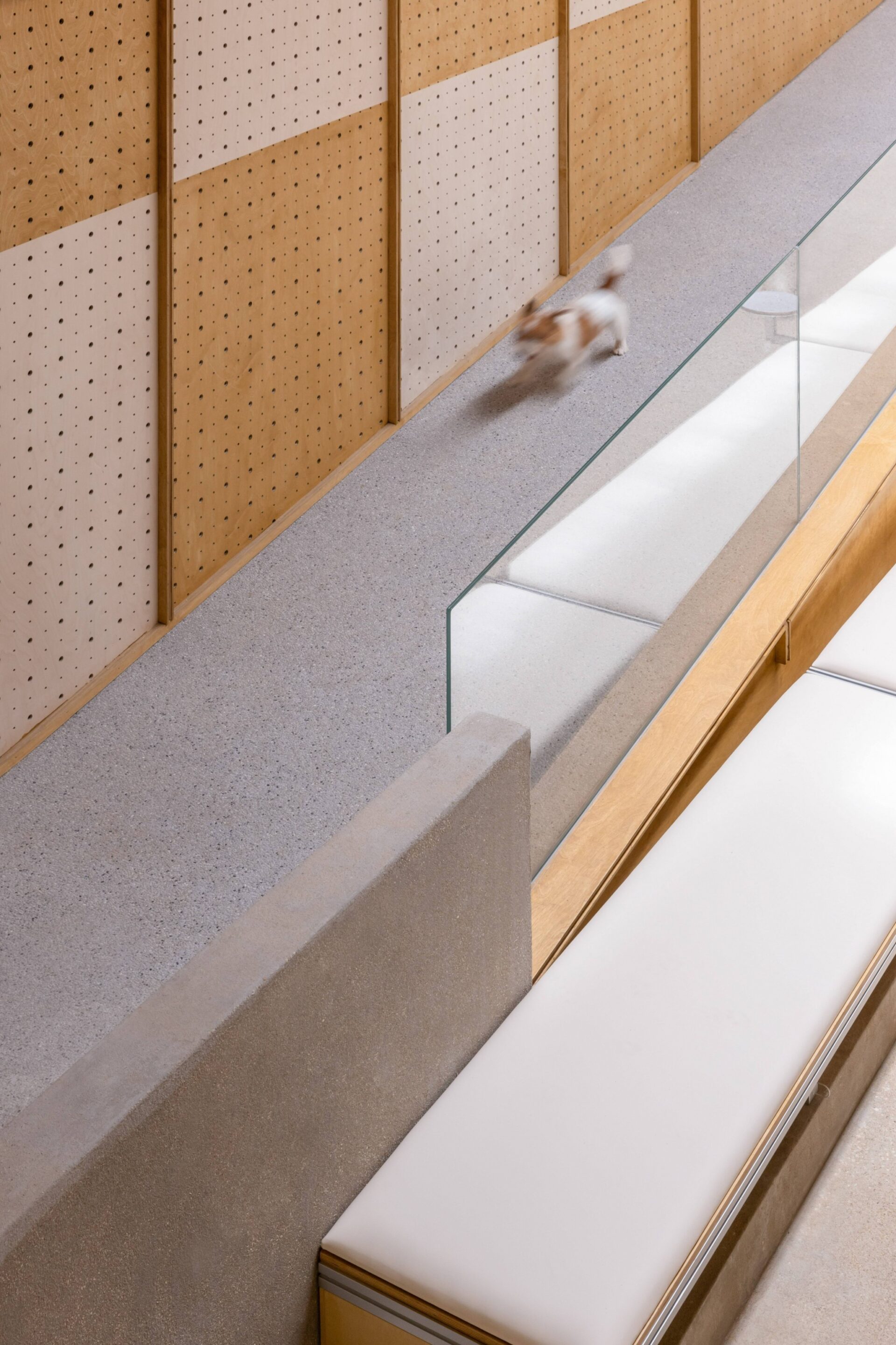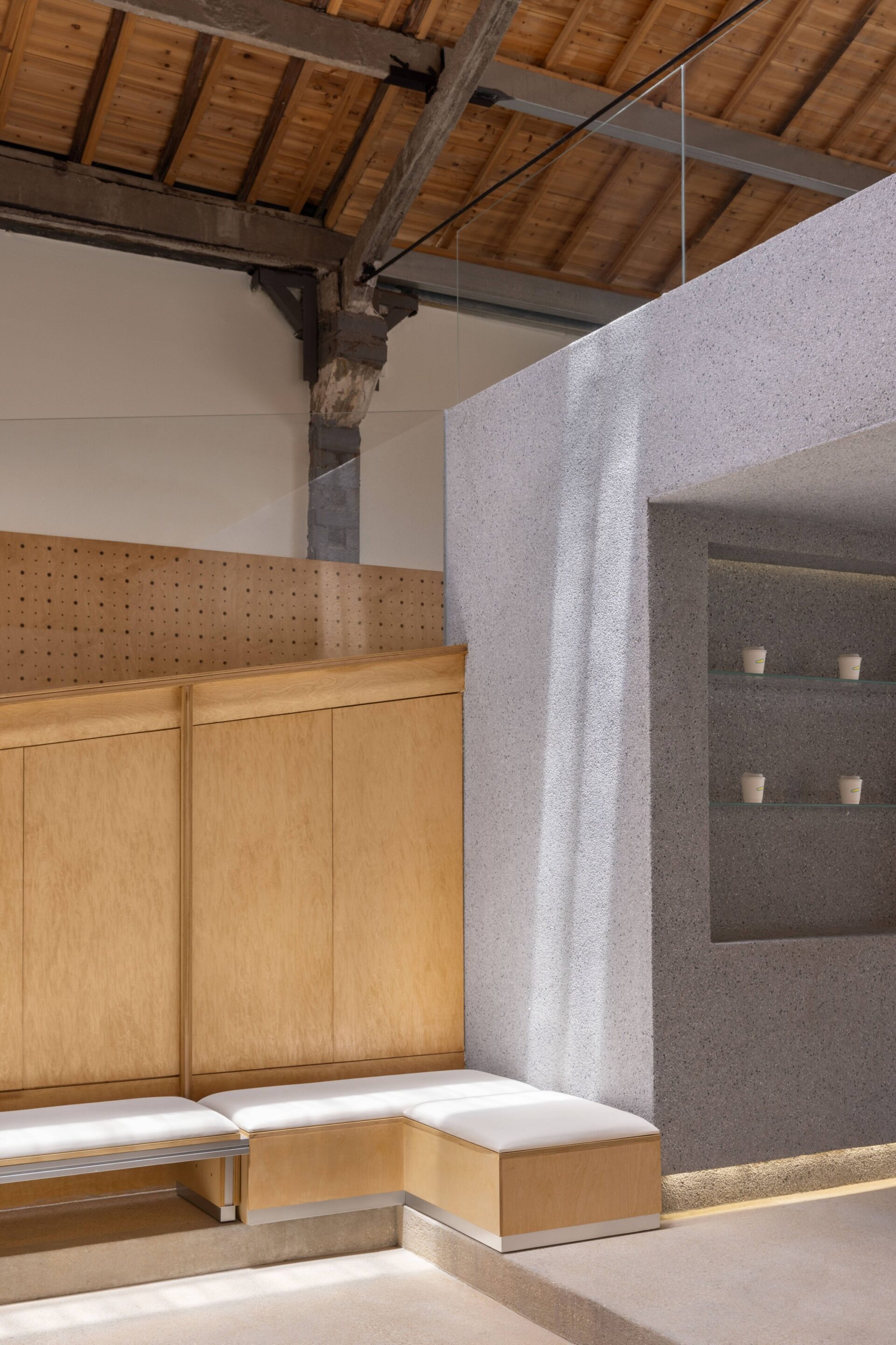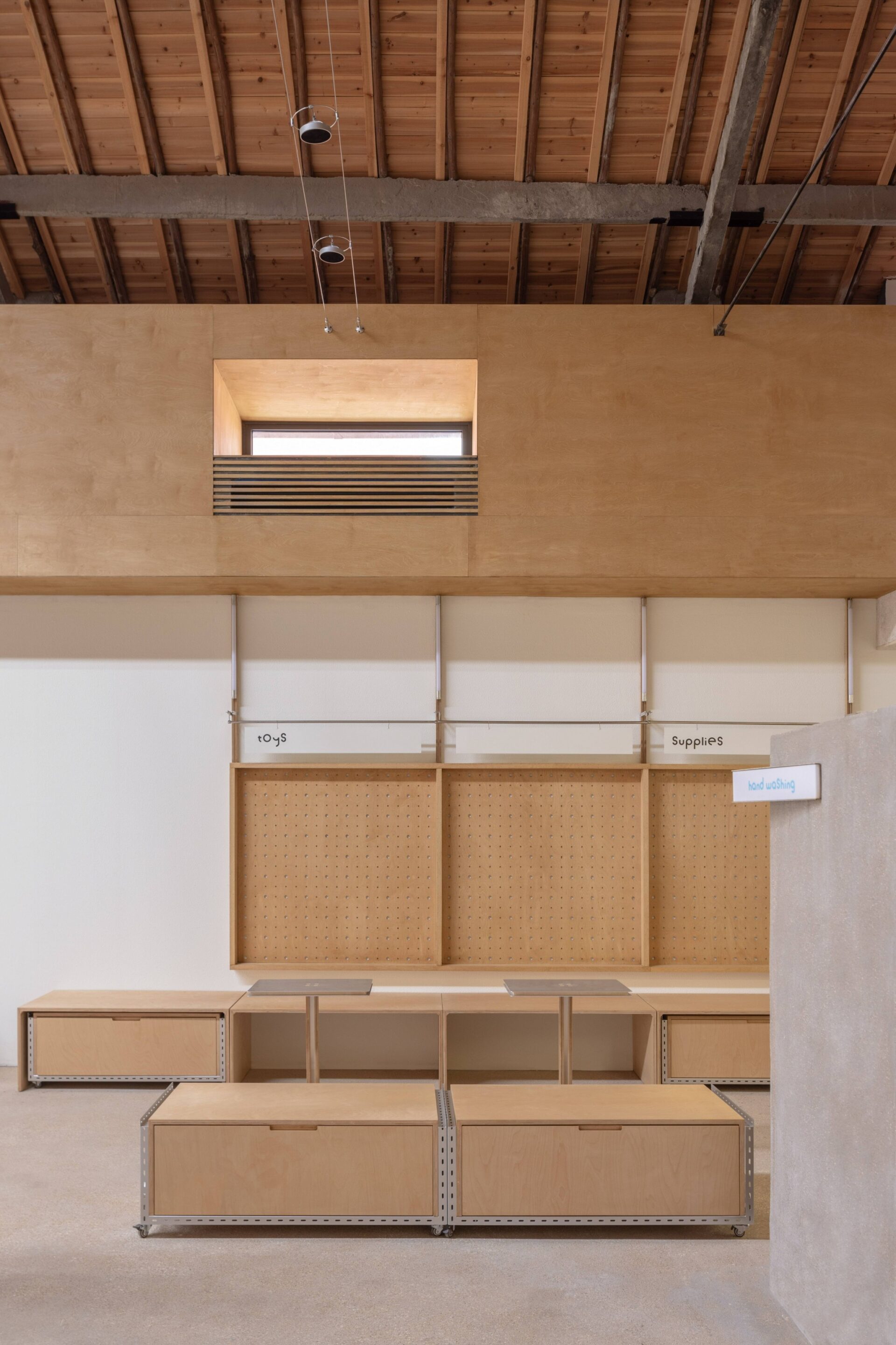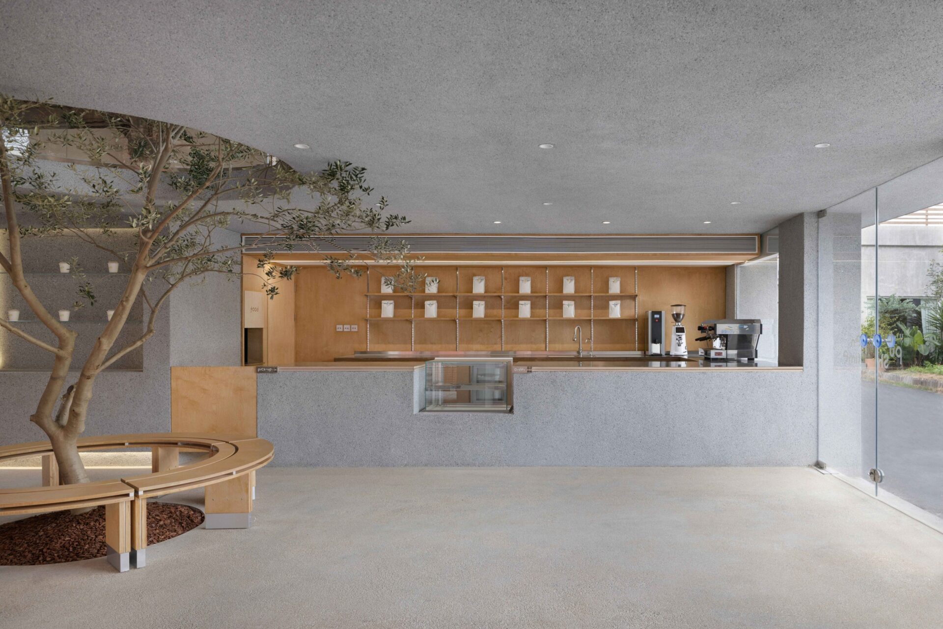 Rough washed stone is applied in the indoor bar, seats and the floor to create a natural sense of simplicity. The gravel-concrete floor and gray washed walls work in concert with each other for continuing to deepen the outdoor feelings of the space nature. The rough material can play the role of non-slip for pets, but also has the durability and stain resistance of outdoor natural materials. The entire space wall retail system and movable furniture system are constructed by using color-matching ocean panels to create a warm space atmosphere, which complements the original wooden roof. The clever selection of these materials and the natural weathering of the texture over time further enhance the architectural texture.