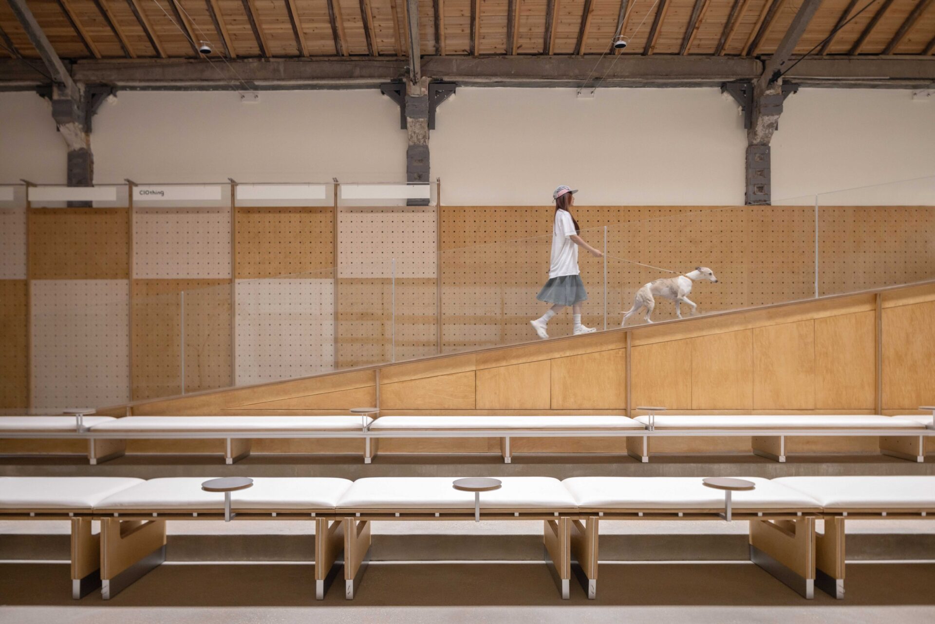 The furniture details on the space are created to provide a sense of security for the pets who come here for the first time, and the space below the seat will be left for the dogs to soothe their emotional state when they come to an unfamiliar space. The suspended design under the middle activity bench is only possible to reduce the obstruction of pet play, whether it is running or resting, to provide enough freedom for them. Fixed small round table and dog leash can free the hands of pet owners at any time to have free conversations and enjoy food. The large and small hole panels of the wall are scattered in the space, which can be used as retail displays and decorative symbols. The flexibility of the space will be well met by all movable furniture design, and the combination and layout can be changed according to different pet theme needs.