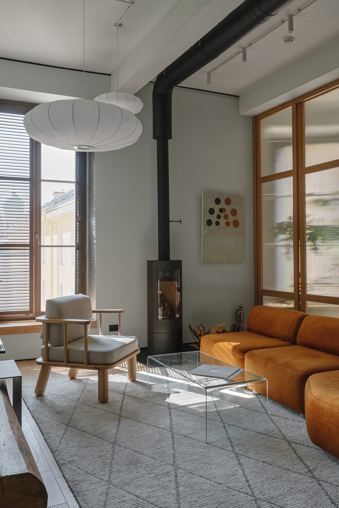 This residence combines an intimate, chamber-like atmosphere with expansive design elements. Elegant details create a sense of European refinement: double swing doors reminiscent of palace suites, a freestanding bathtub by the bedroom window, an antique stove, and a vintage armchair. Eucalyptus-toned walls and glass elements give the space a cinematic charm, akin to a film studio.