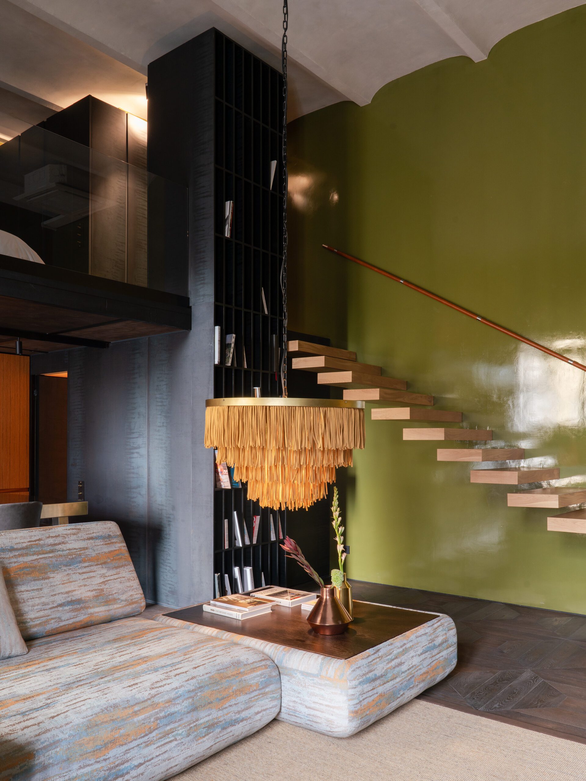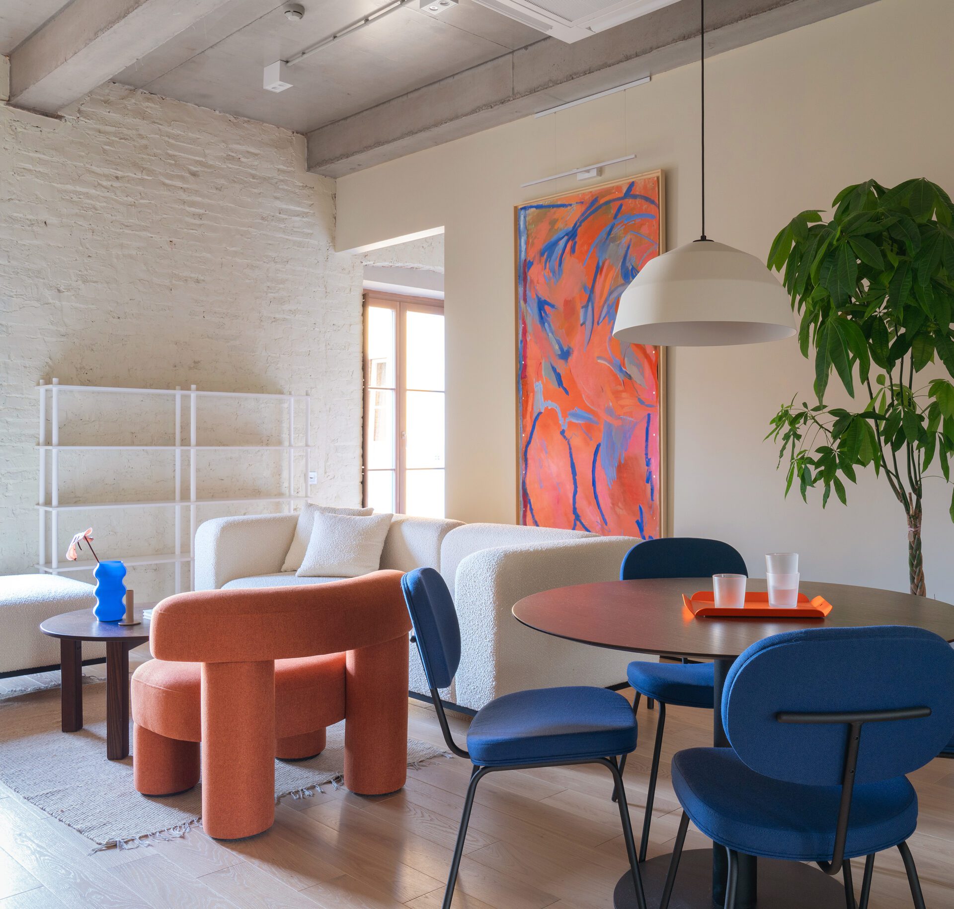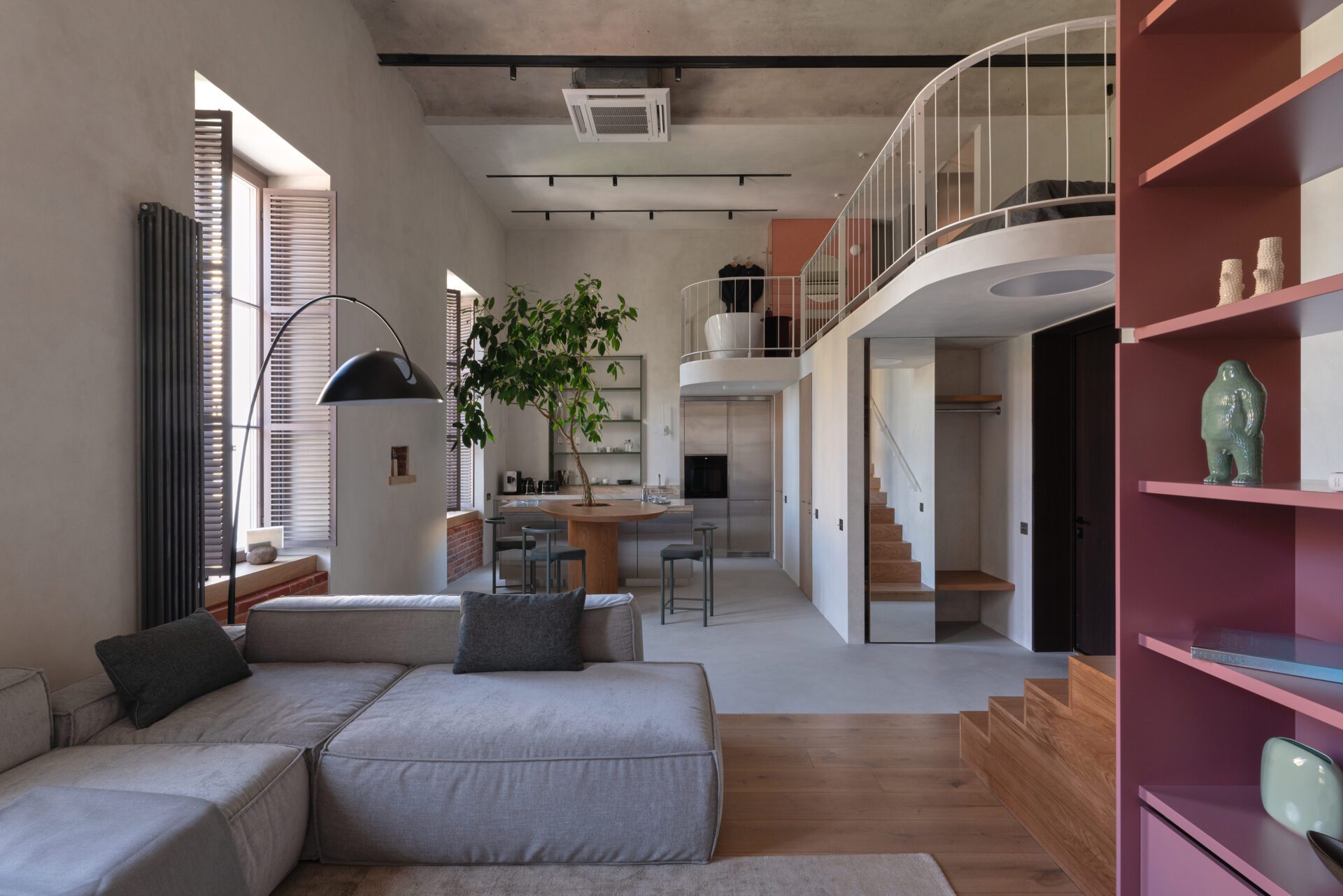Light, voluminous, neutral, and contemplative interior designed to emphasize your free nature without being intrusive. Leather sofas, delicate combination of metal textures and bricks, large canvases placed between the windows — all this create a vision of an art gallery and brings a modern interior magazine aesthetic. Live trees in the center of the hall adding vibrancy. Open-spaced bathroom located right by the bed, makes it curious and vivid.