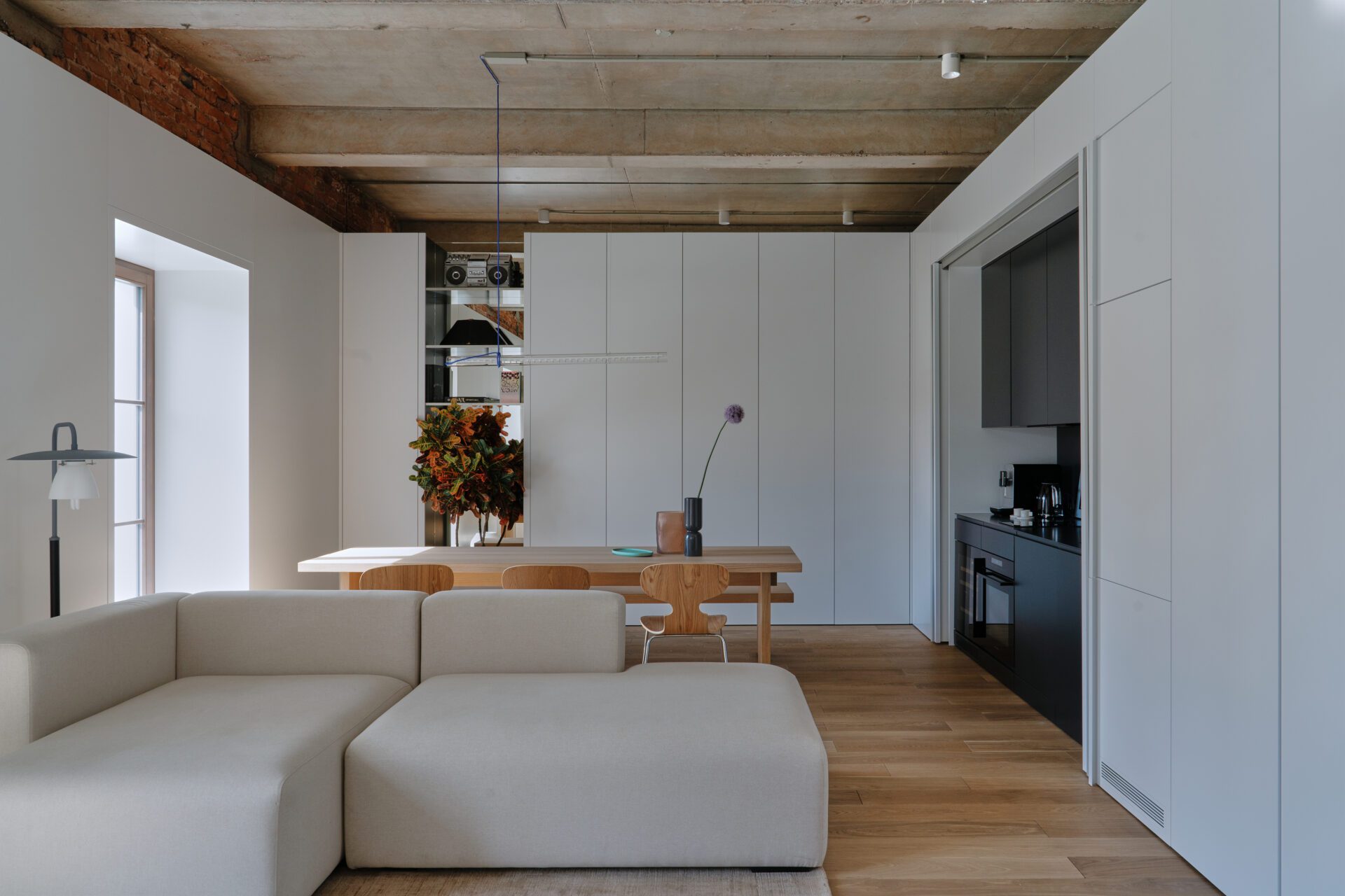 Heritage and modernity are in continuous dialogue in this residence. Big windows and restored brickwork show history of the building. A white-paneled design plays contrast with architectural details and cleverly concealing cabinets, a kitchen, and modern appliances