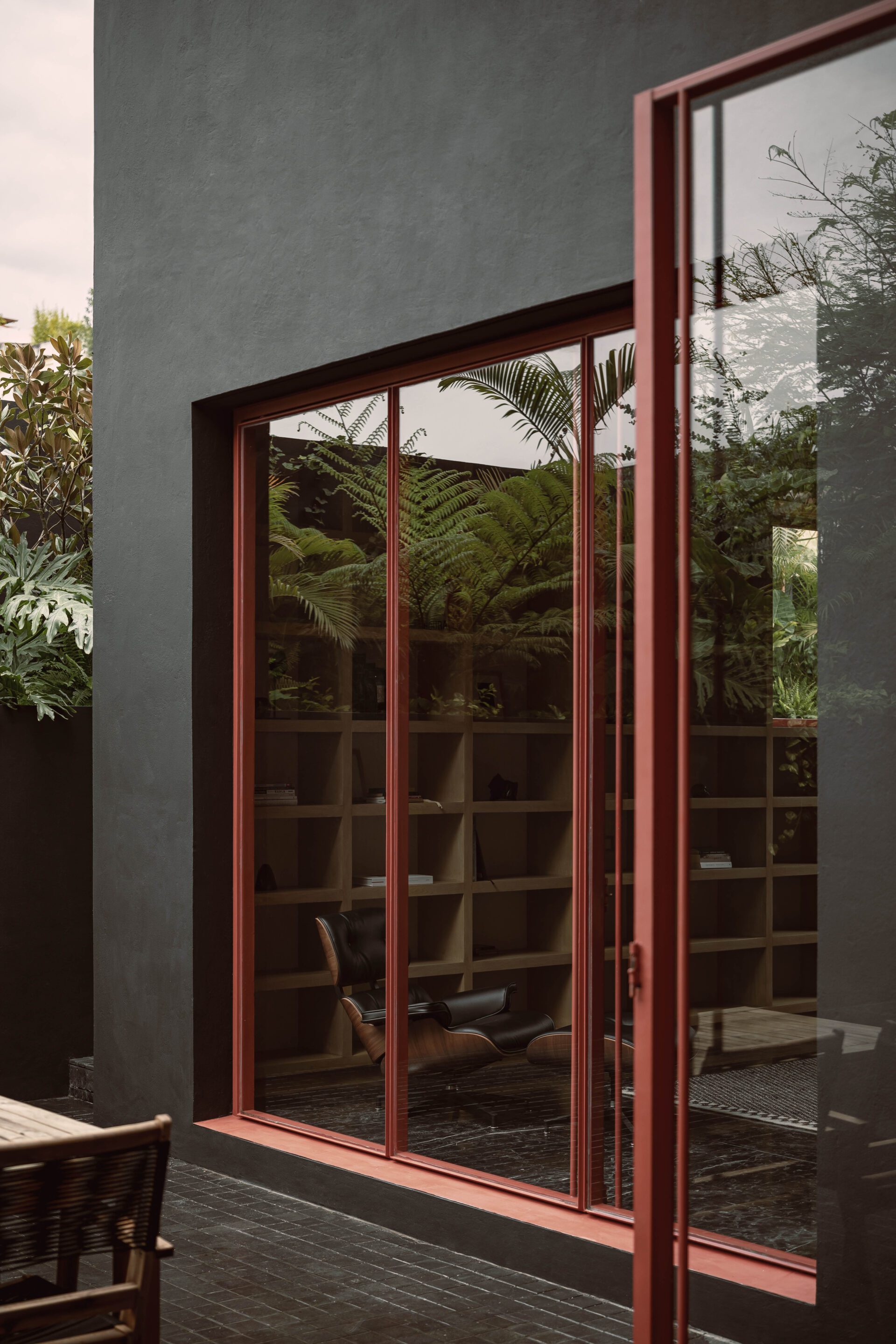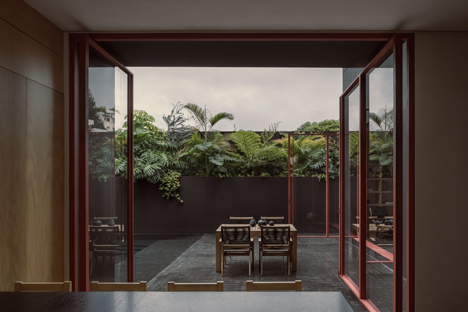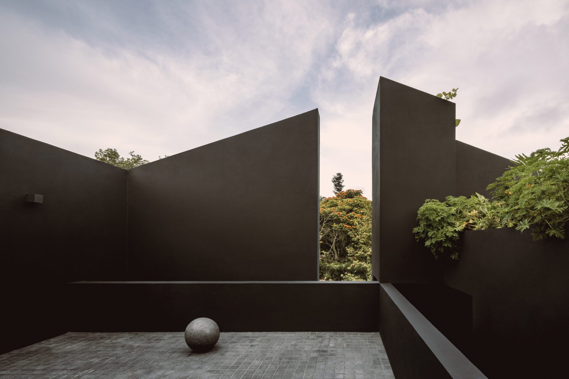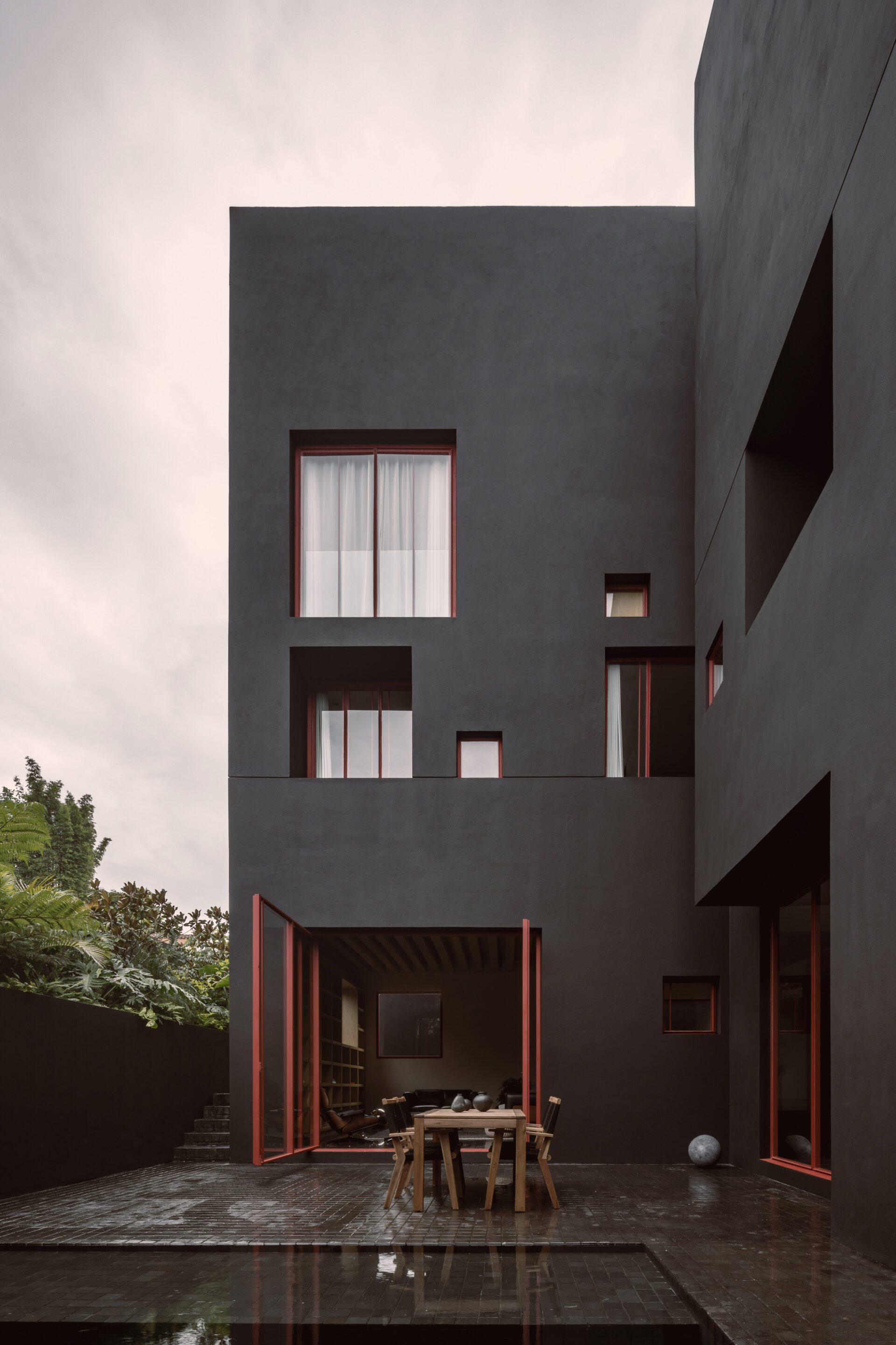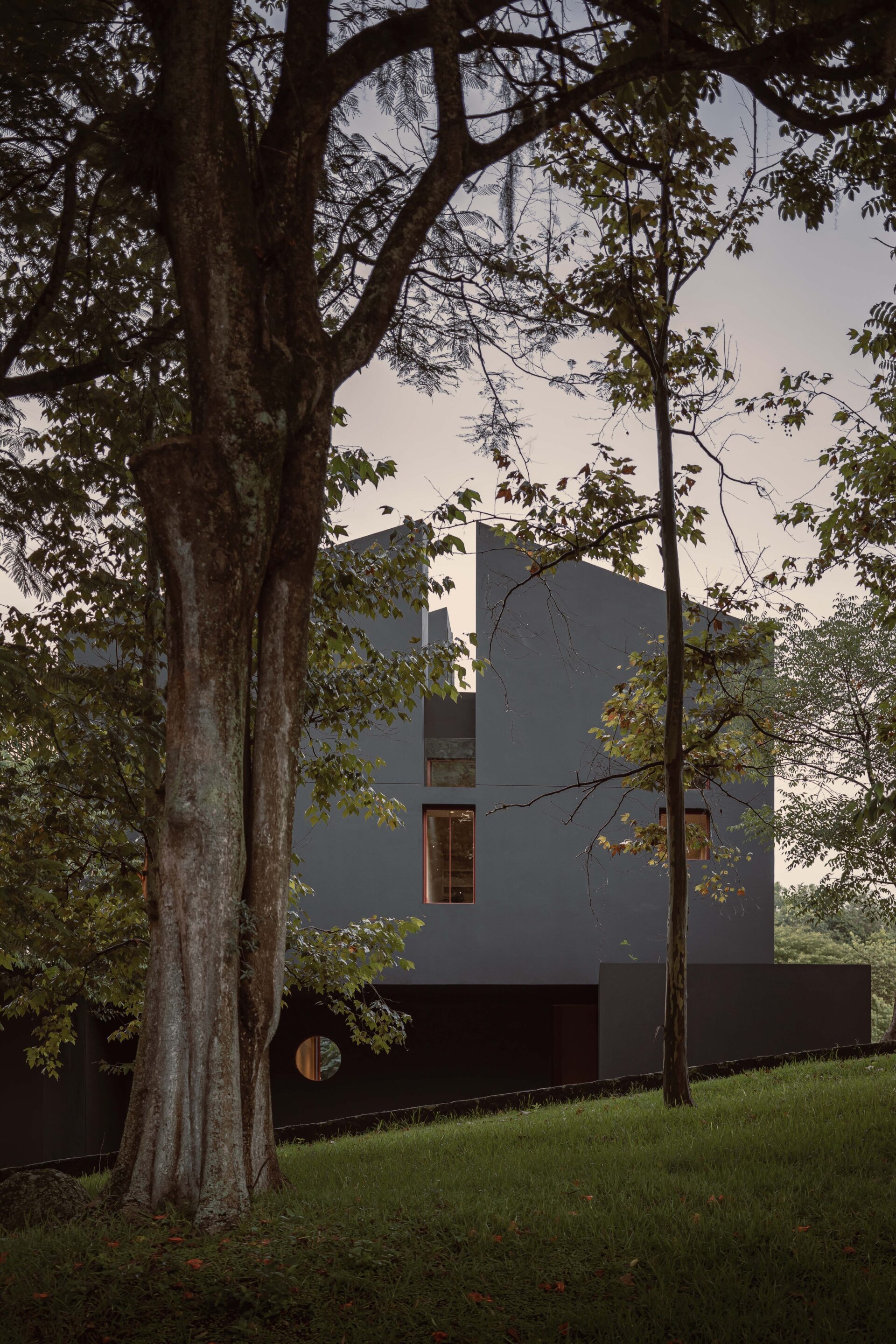 Terraces and windows allow for an evolving conversation with the ample vegetation that surrounds the grounds. In the house’s ecosystem, plants become protagonists, establishing a symbiotic relationship similar to the one mutually agreed upon between the moss or the amate tree with the rock. Inside, the differently sized and shaped windows become openings that frame natural elements, invite the viewer to contemplate the green color, and shed light to all life spaces. At the same time, these windows confuse the threshold that separates interior and exterior, generating an expanding sensation. Outside, once that the viewer overcomes the plants that surround and hide the building like a lost treasure trove at the bottom of a trunk, windows offer fleeting glimpses of life, if only a bunch of suggestions of what happens there every day. At night, the black house disappears into the darkness. What remains are small gaps of light revealing a series of quotidian pictures.