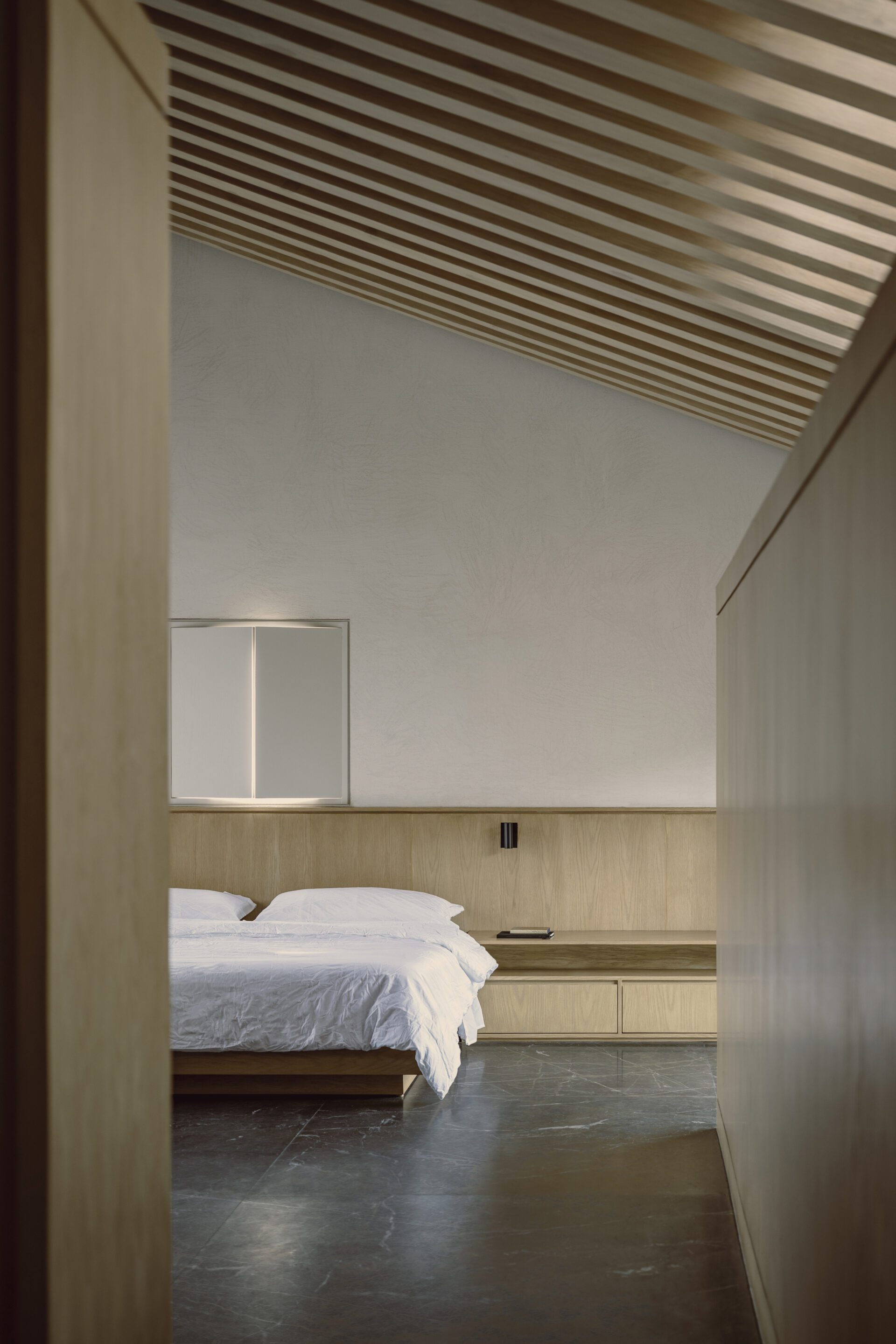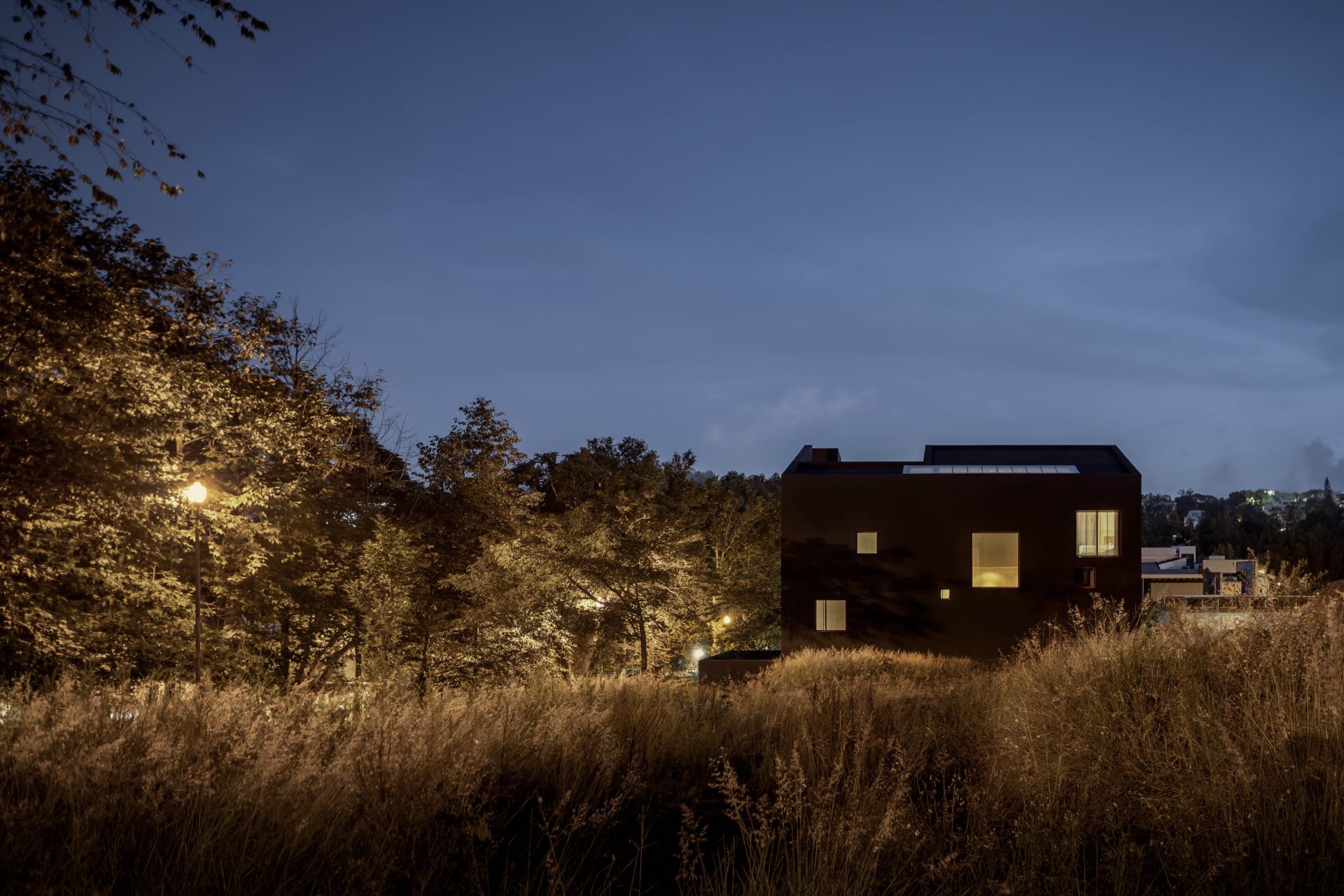 Envisioned for a growing family, the house proposes a form of dwelling organized around a continuous dialogue with the landscape in which it is located. The dark exterior grants it a solid stature, while simultaneously evoking the possibility of a home carved in the interior of a rock formation. Certain formal gestures complement this suggestion, like the sectioning of the house’s volumes that hints at the form of a crack, or the windows that appear sporadically, yet with a balanced rhythm, in different parts of the wall. Furthermore, the tour inside proposes a game of changing lights and shadows, with paths that open and close, tighten and widen, and flow into open spaces that secure both fresh air and privacy.