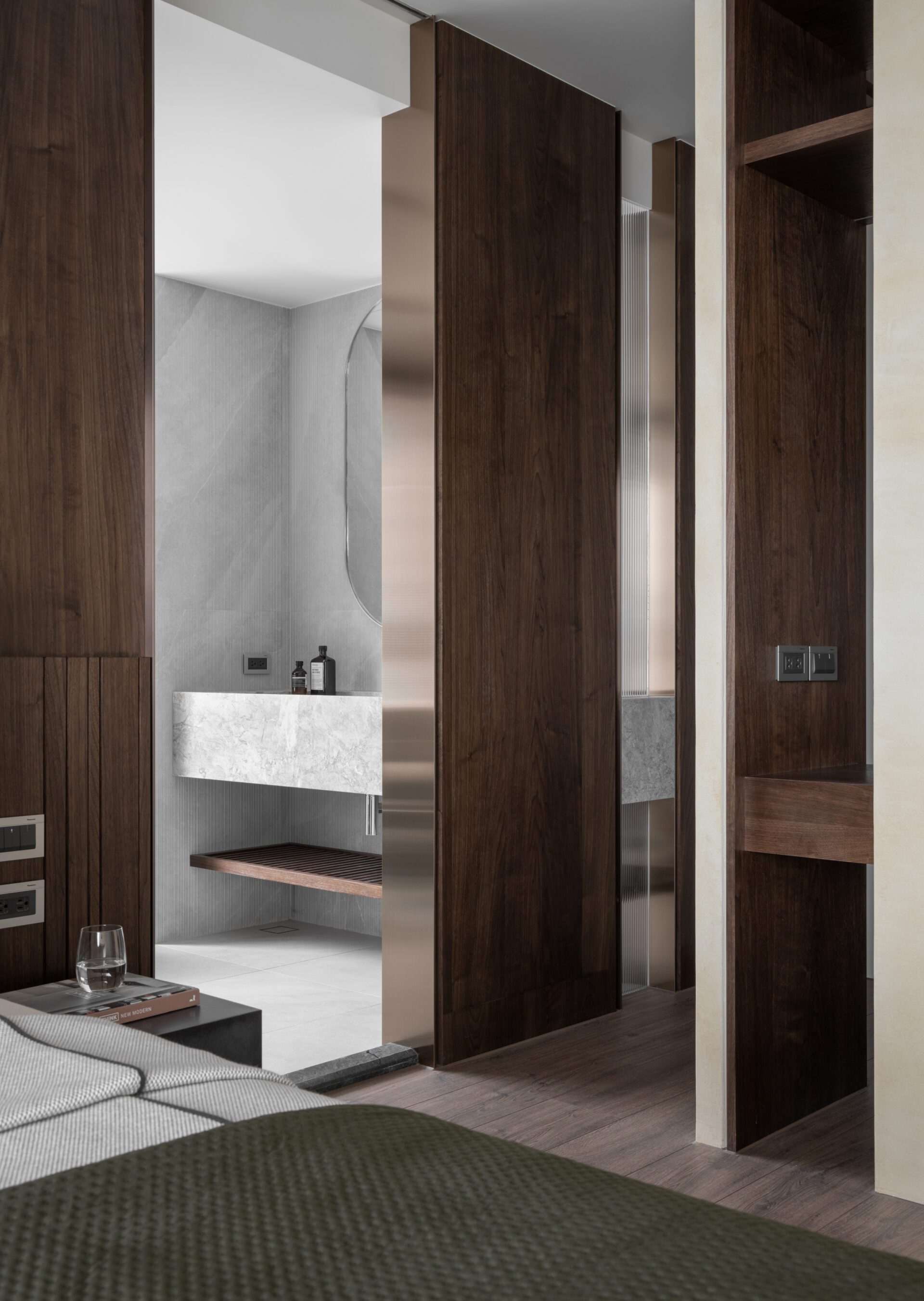The public space merges into each other, but one does not have the feeling of being in one large space. As the living and dining areas serve as the centerpiece of the house, where the owner can easily enjoy and serve it with more than 15 people. The space is characterized by curved walls that are covered with neutral tones of stucco and rose-gold titanium, contrasting against the stone-grey tiles. The sheer curtain creates soft sunlight, accompanied by the walnut along the wall and cabinets, to create a warm and inviting atmosphere.