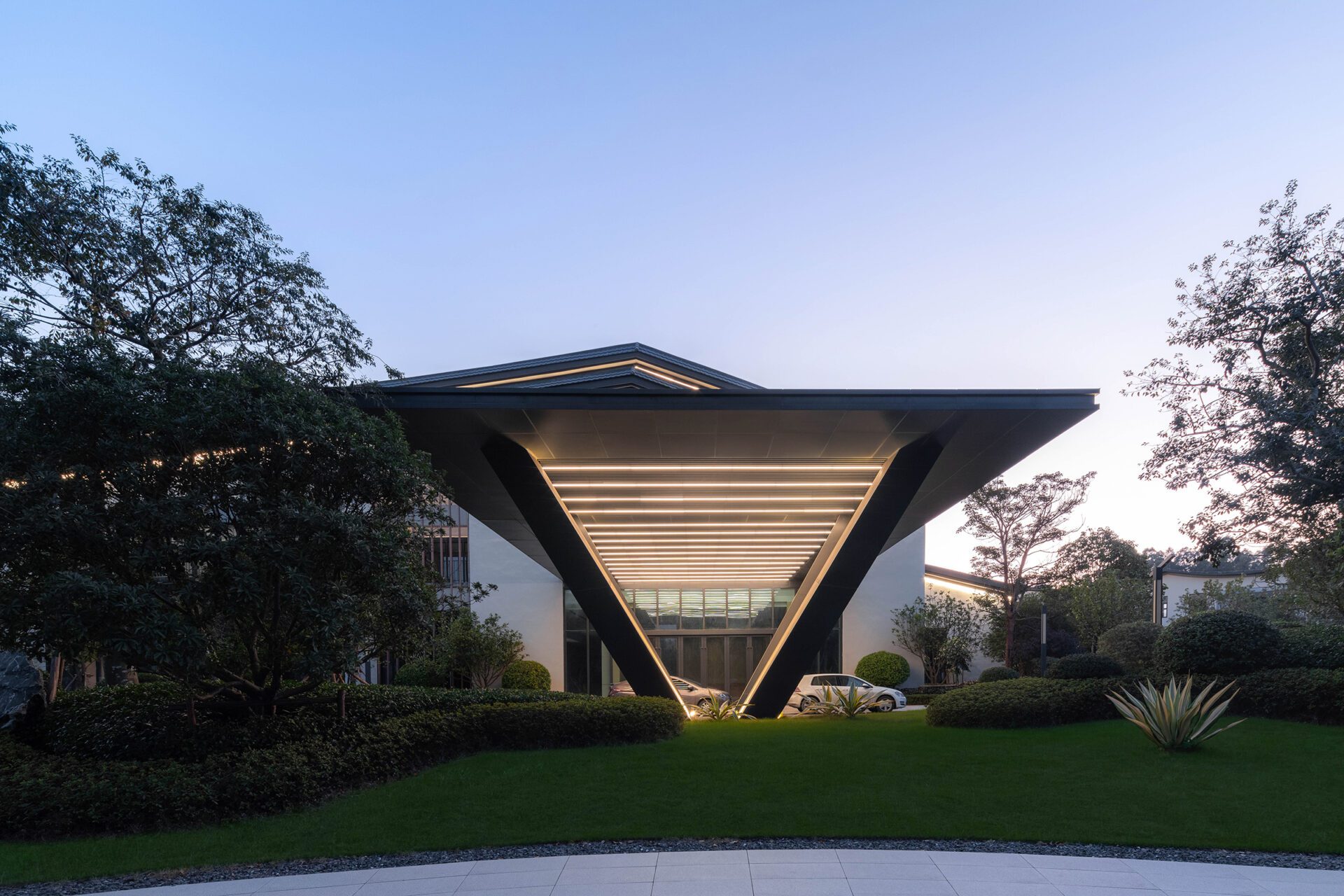 The layout takes full account of the combination of building volume and the natural environment. A balance between water and landscape is maintained by the design to make the building more airy and accessible. The design language is both abstract and meandering. Combining the volume of pieces enables the building to display virtuality and reality simultaneously. The appropriate use of solid walls and glass walls provides a combination of hardness and softness. The overall shape of the building remains balanced. However, the rooftop design gives the impression of a range of mountains.