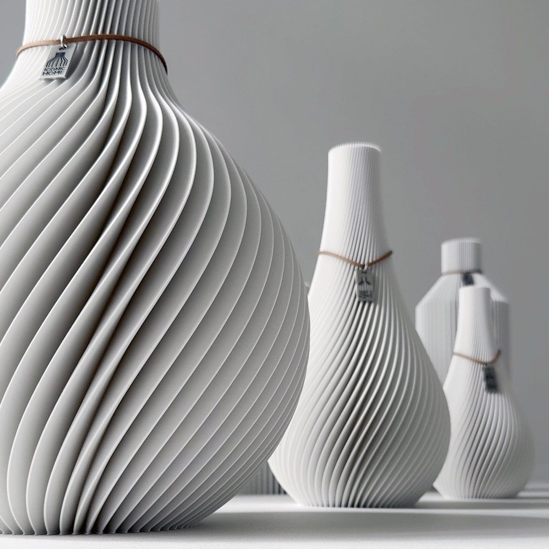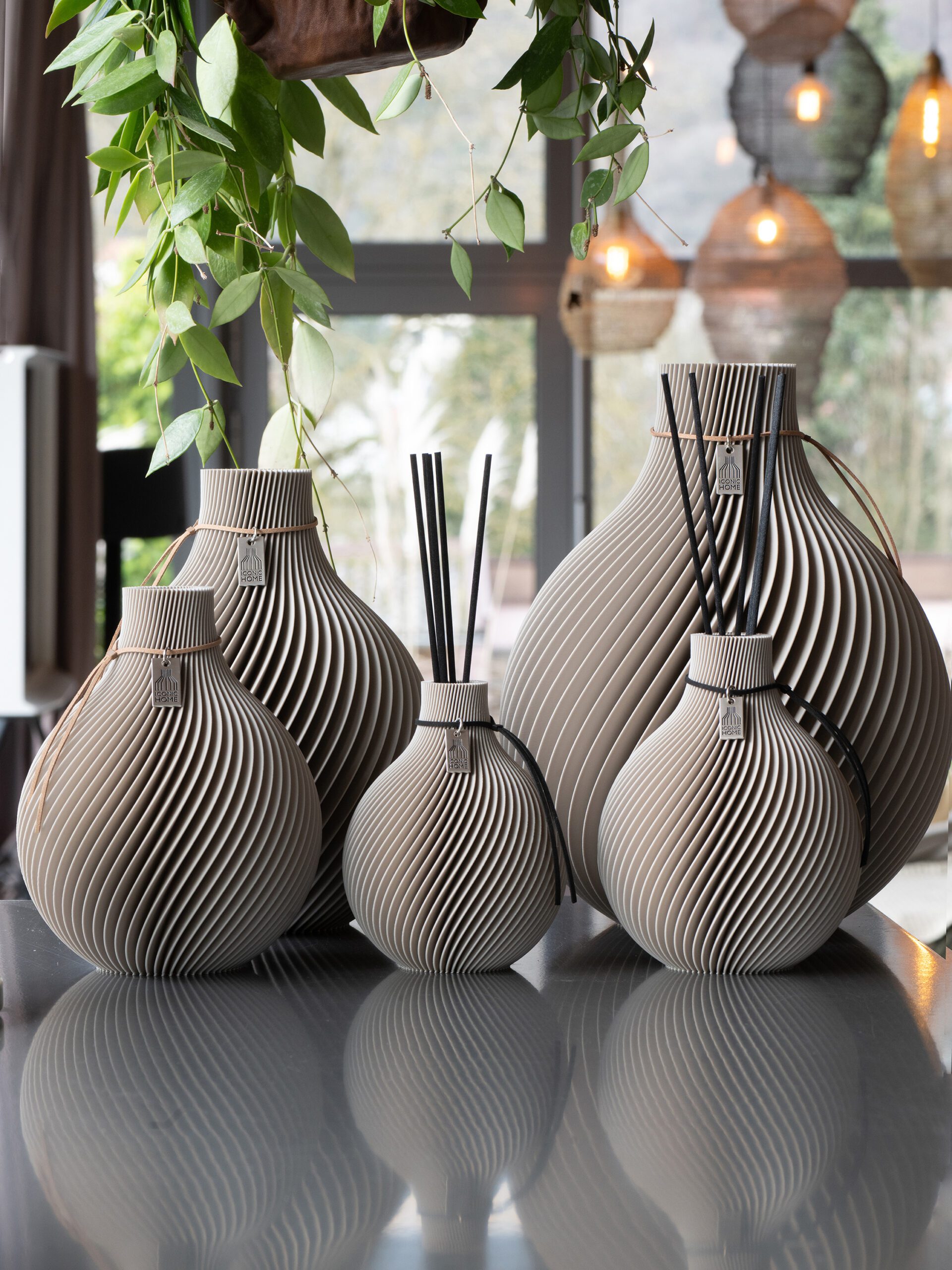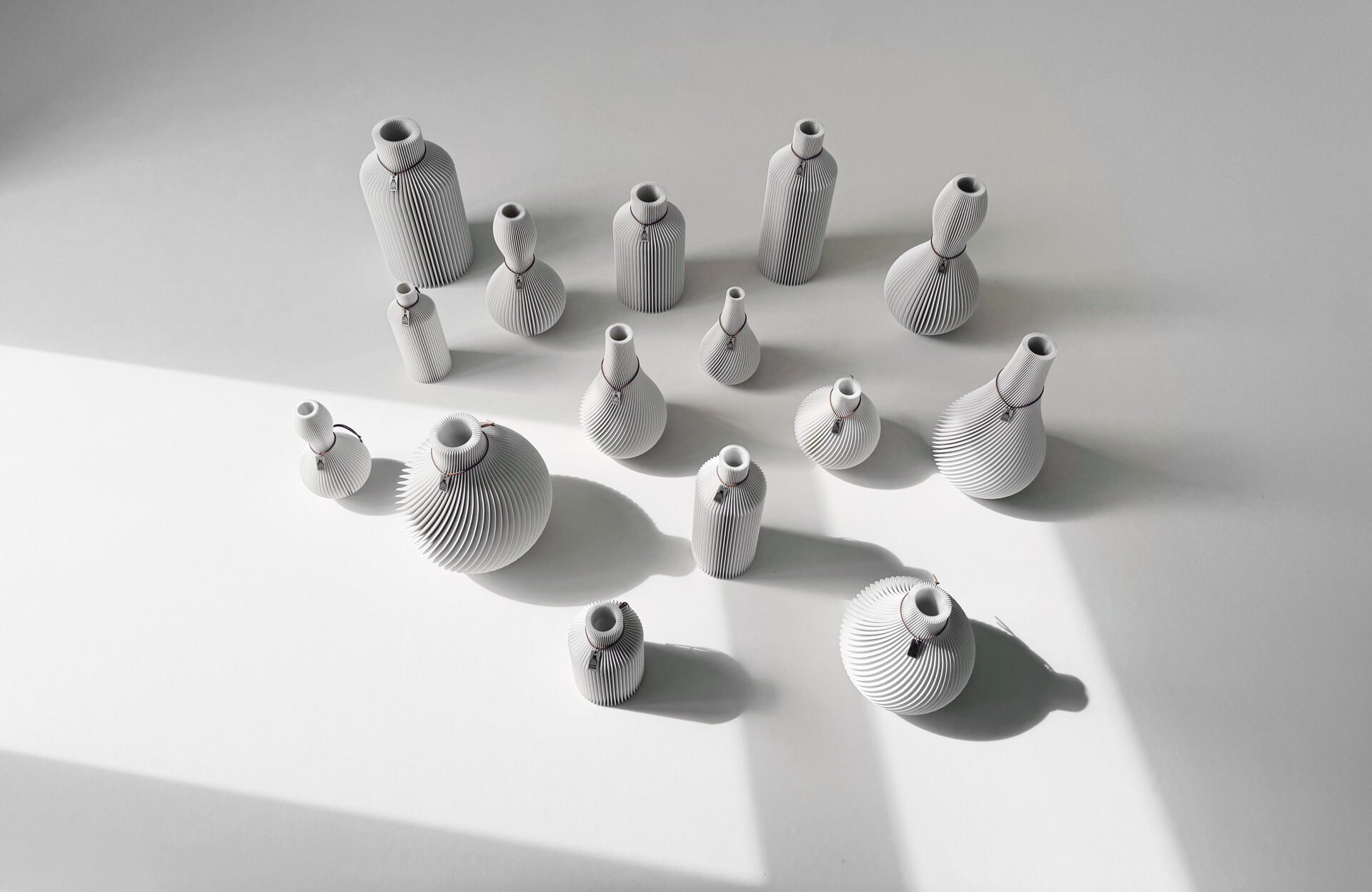 The five-piece vase collection is created in the company's own design factory in Germany using a high-precision 3D printing process. Made from bio-based PLA, it combines innovative technology with sustainable design. Quality takes time: layer by layer, each vase is manufactured with the utmost precision in a process lasting up to 15 hours. The focus is not only on the unusual shapes, but also on resource-saving production that minimises waste.