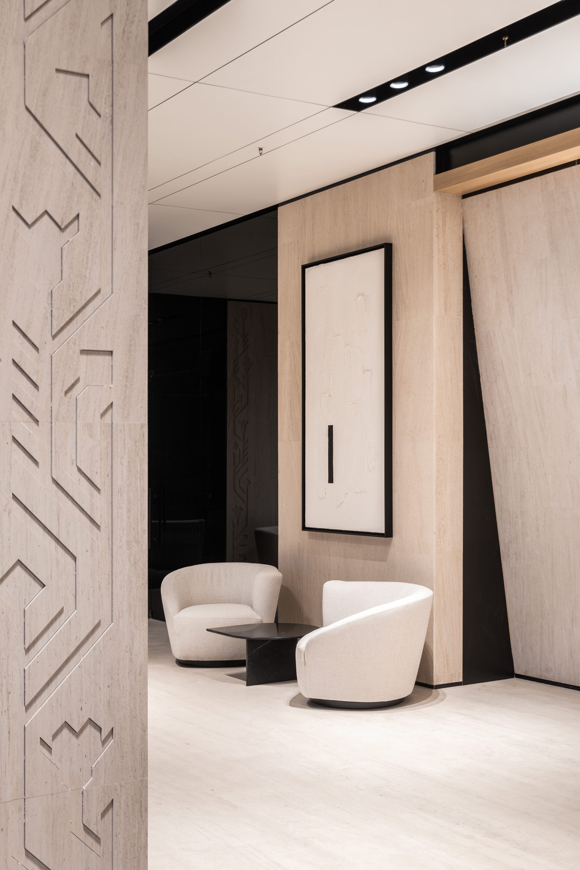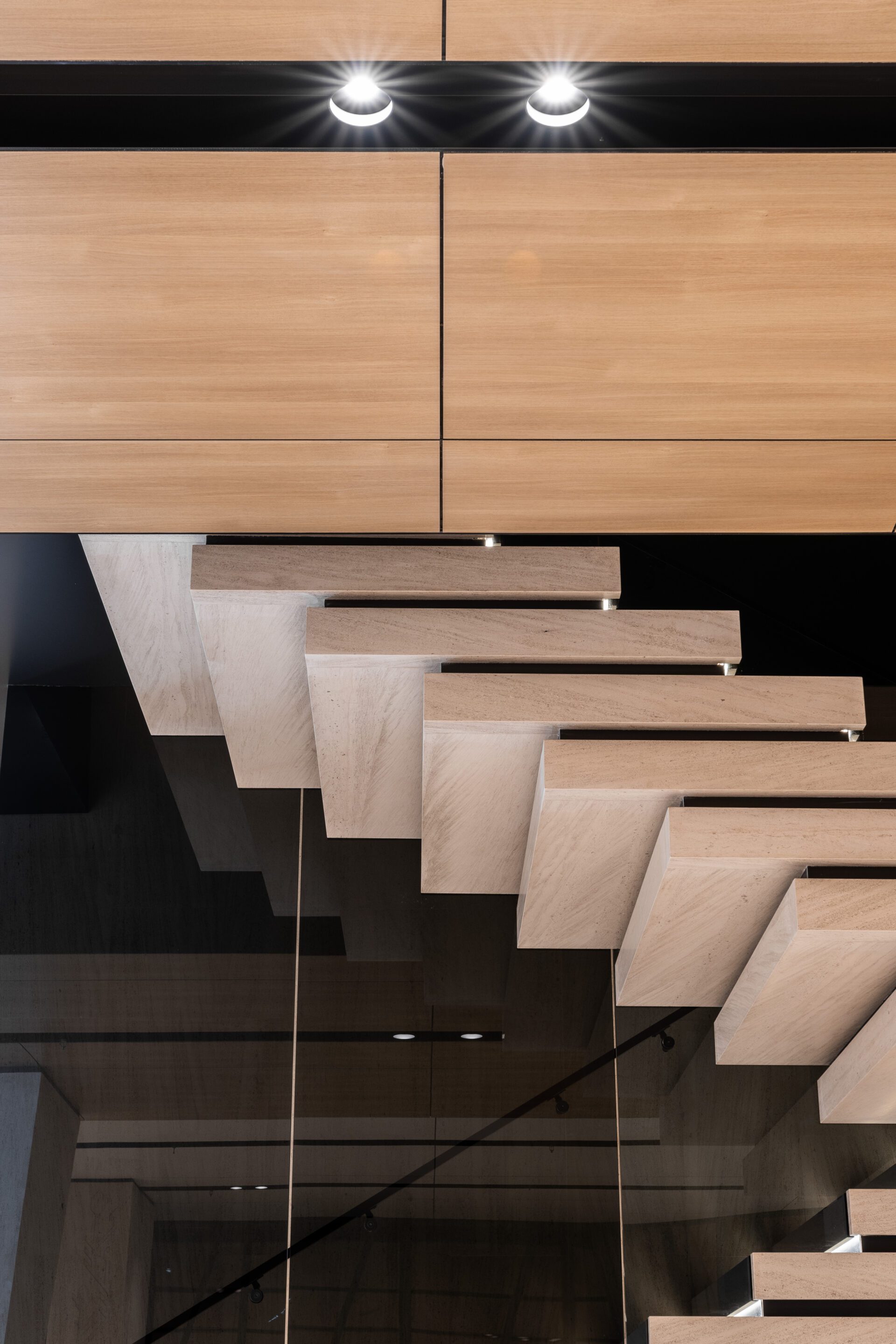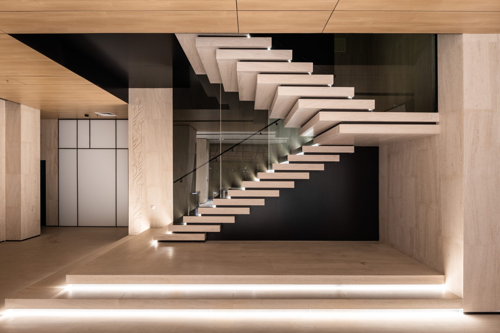 A signature feature of the space is the Infinity Staircase, designed as a sculptural focal point. The stone steps appear to be embedded into the tinted glass balustrade, creating an ethereal, floating effect. This sense of weightlessness is amplified by integrated lighting, illuminating the steps as visitors ascend. Special attention was given to the precision of stone cladding and glass installation, ensuring the staircase embodies both craftsmanship and innovation.