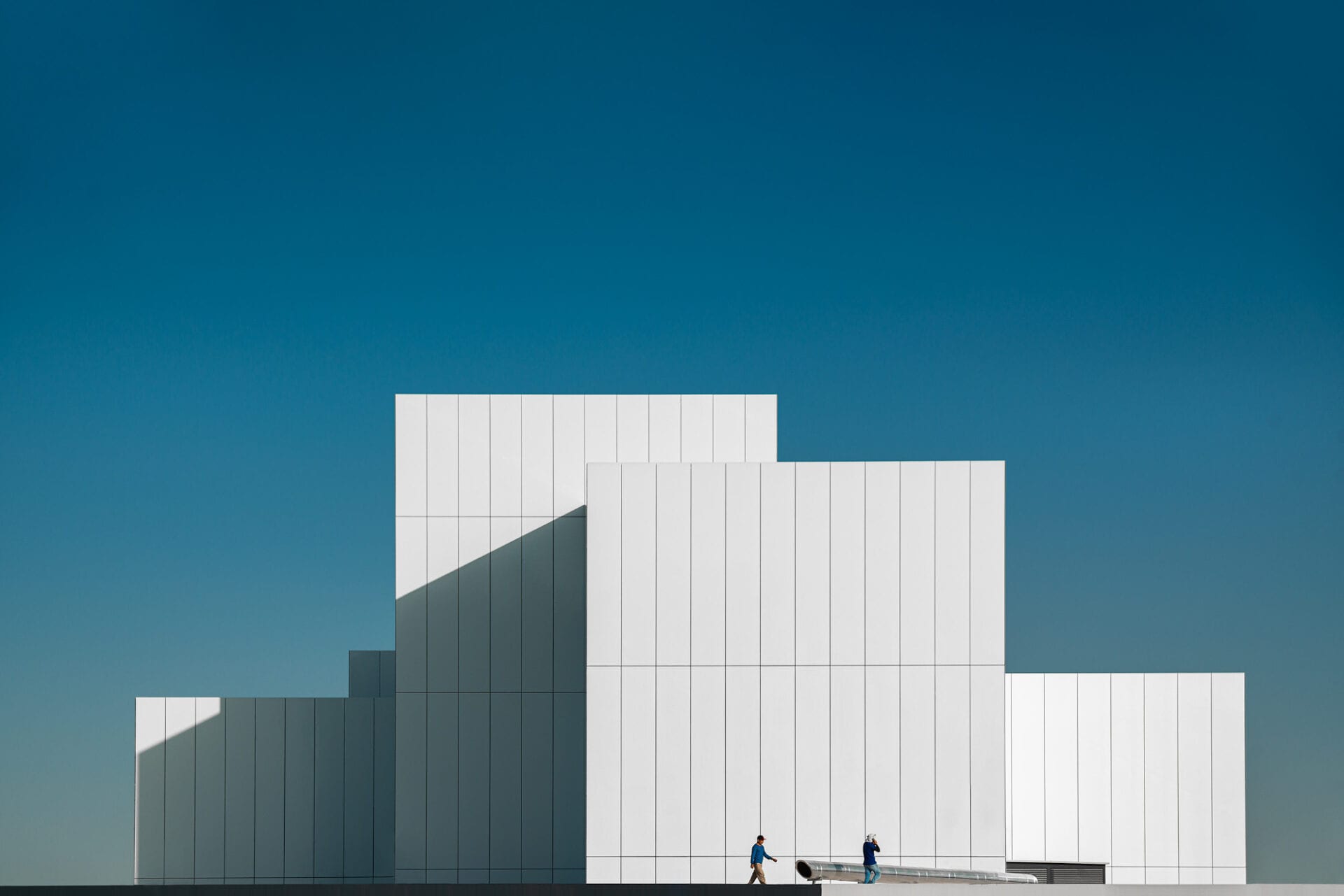 I am always obsessed with white and minimalism, and since I saw the renders of Jameel Art center I knew it would be a perfect place for me to visit and capture. I was lucky to be at the right angle at the right time, there was those two guys who are still doing the installation and maintenance of the AC system so I thought of highlighting that part by giving a scale comparison to those simple yet huge white masses.